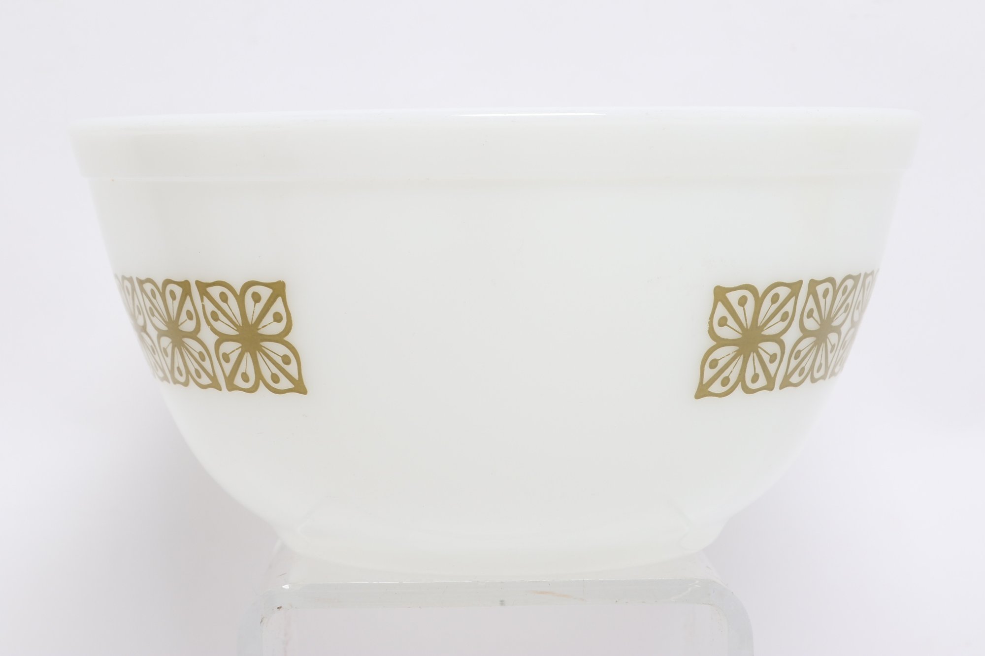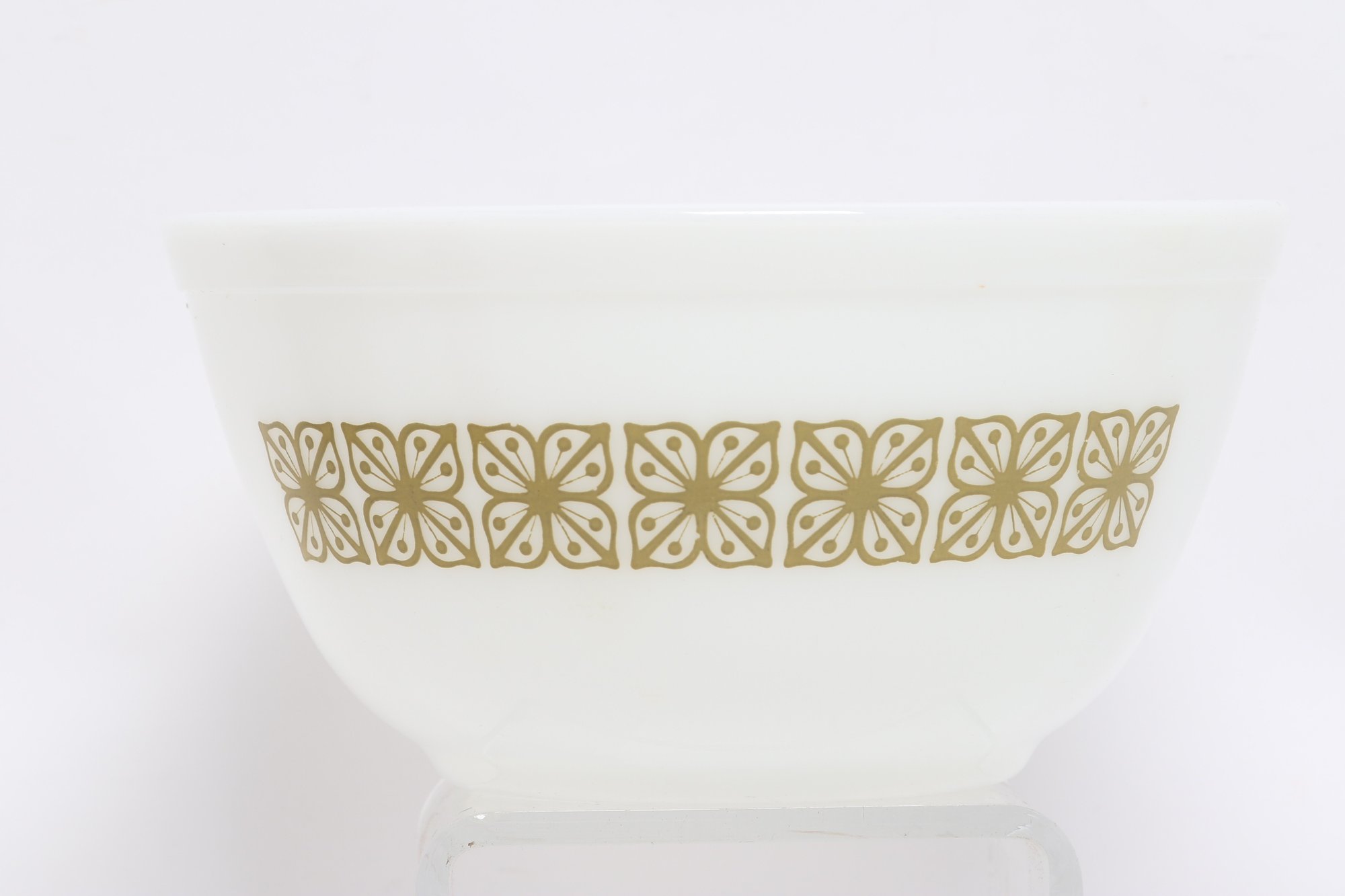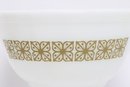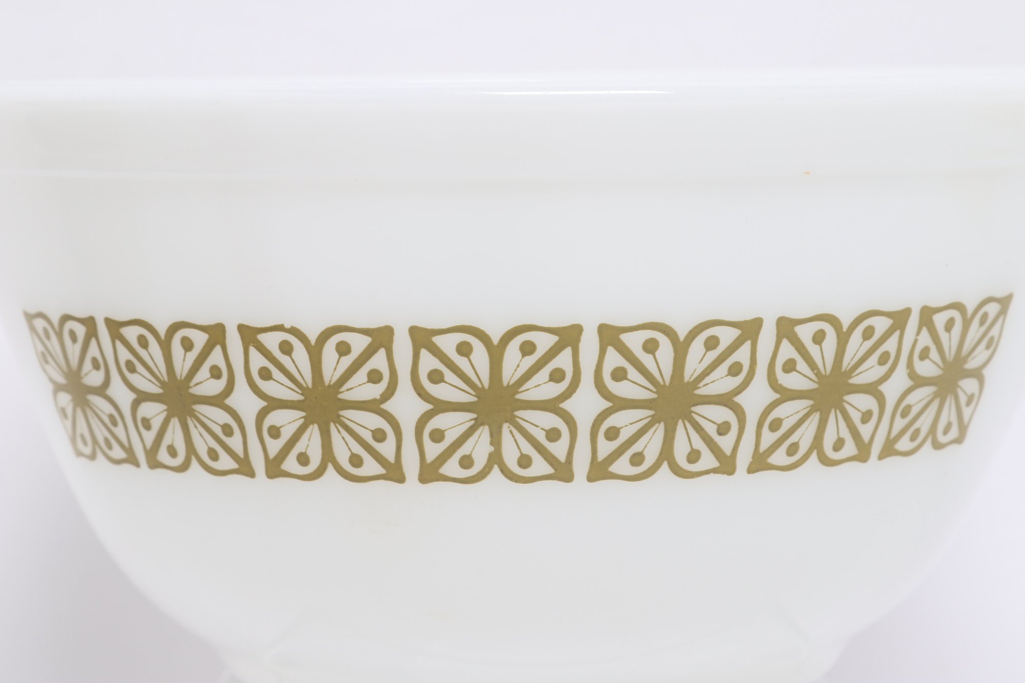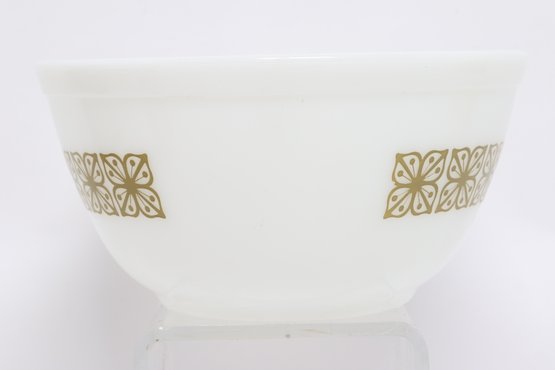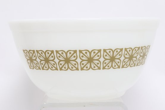 Vintage Pyrex mixing bowl in white glass featuring a gold geometric band pattern. Classic mid-century design suitable for kitchen use or display. Pre-owned with light wear; pattern remains visible and attractive.