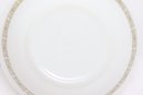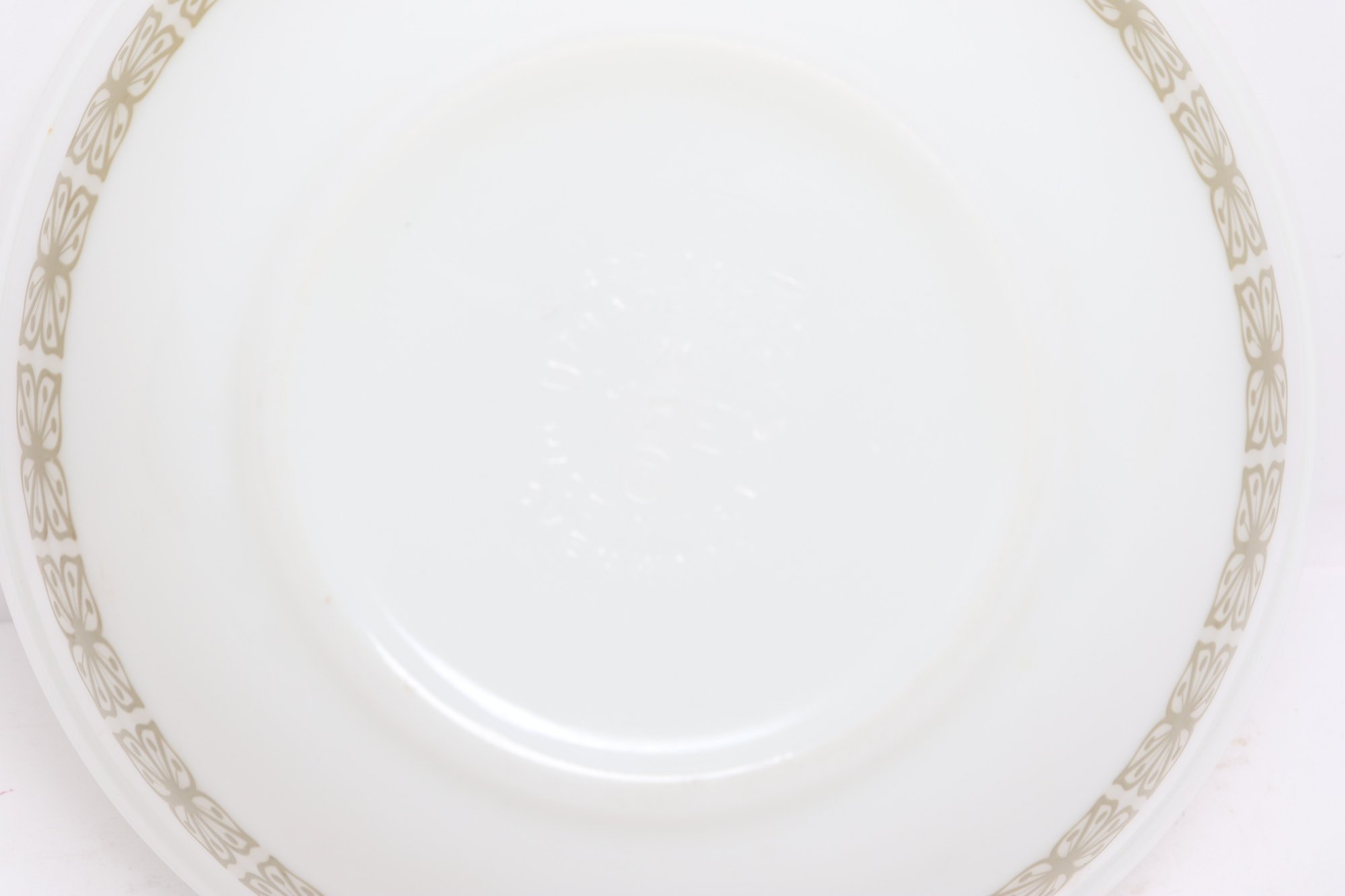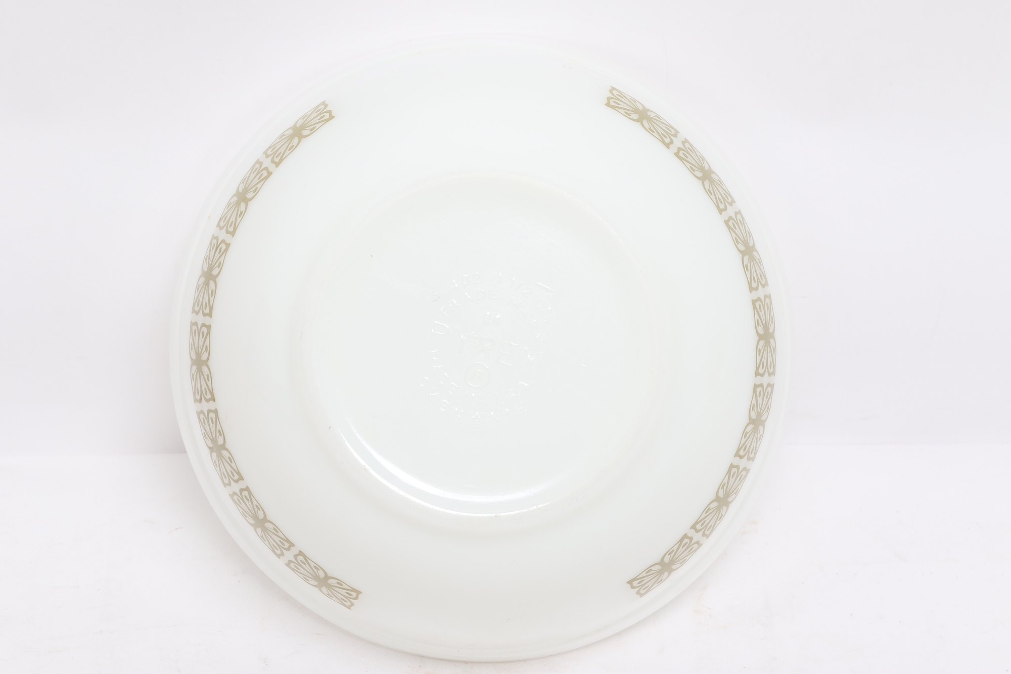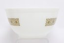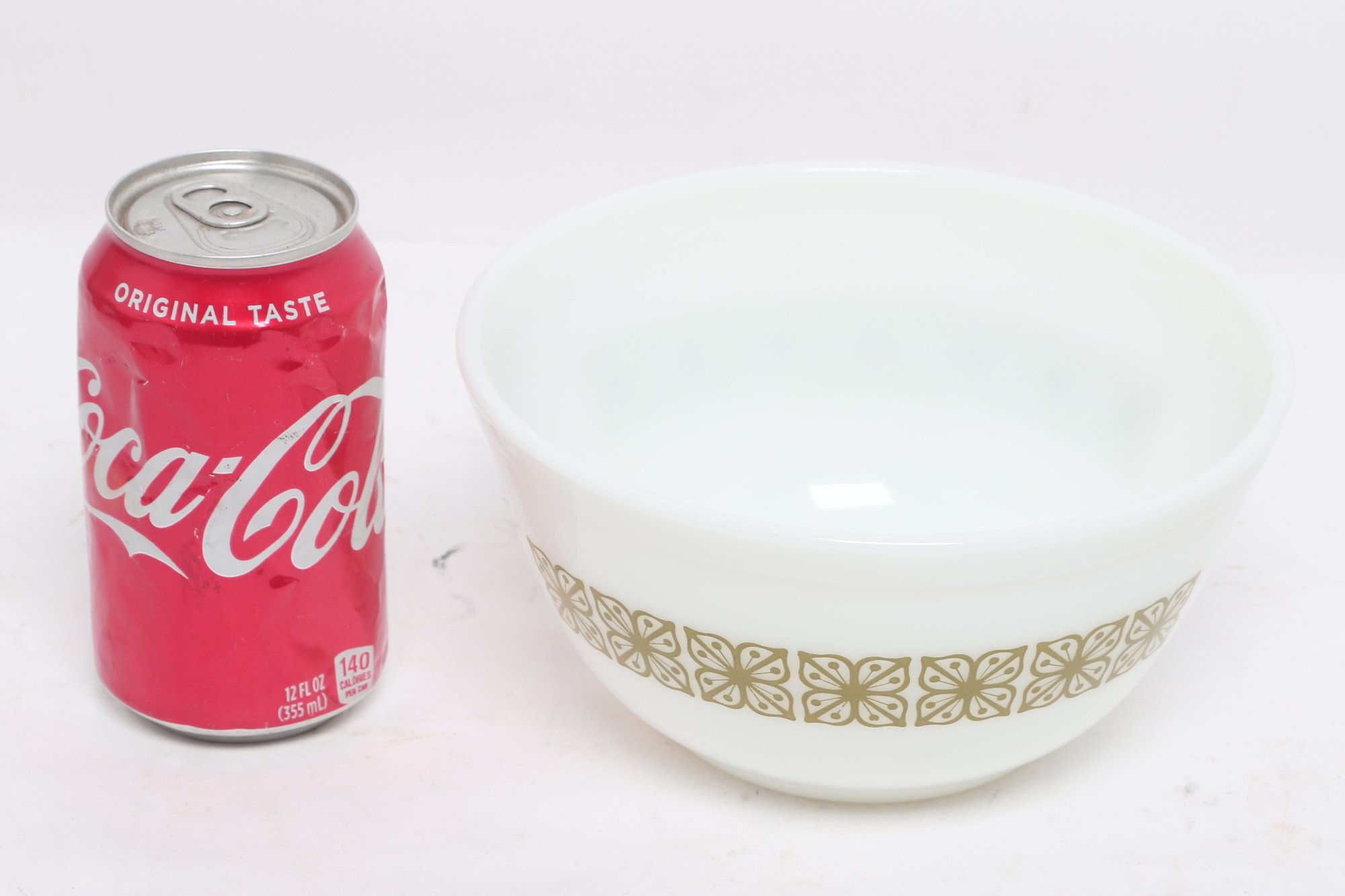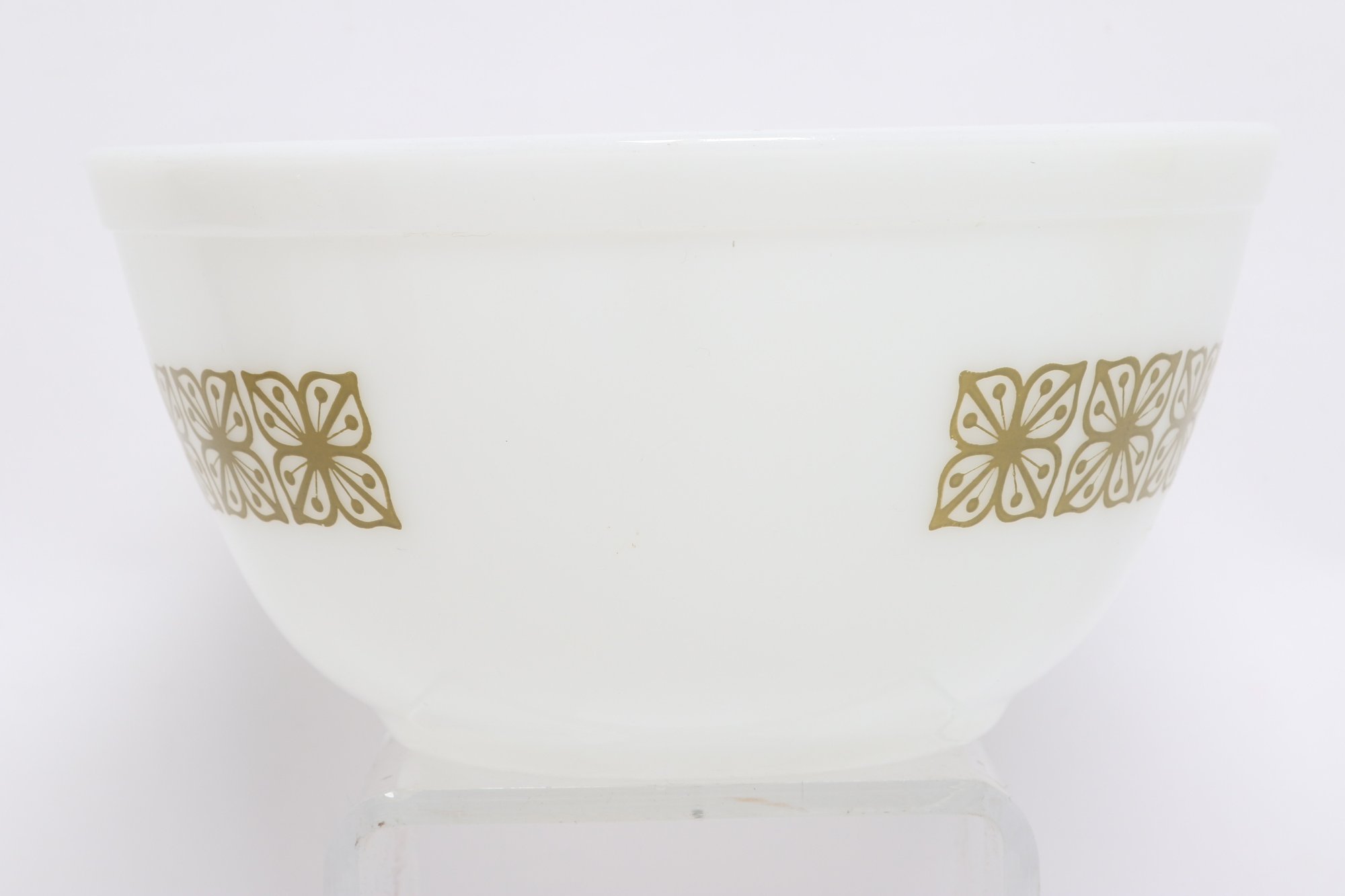 Vintage Pyrex mixing bowl in white glass featuring a gold geometric band pattern. Classic mid-century design suitable for kitchen use or display. Pre-owned with light wear; pattern remains visible and attractive.