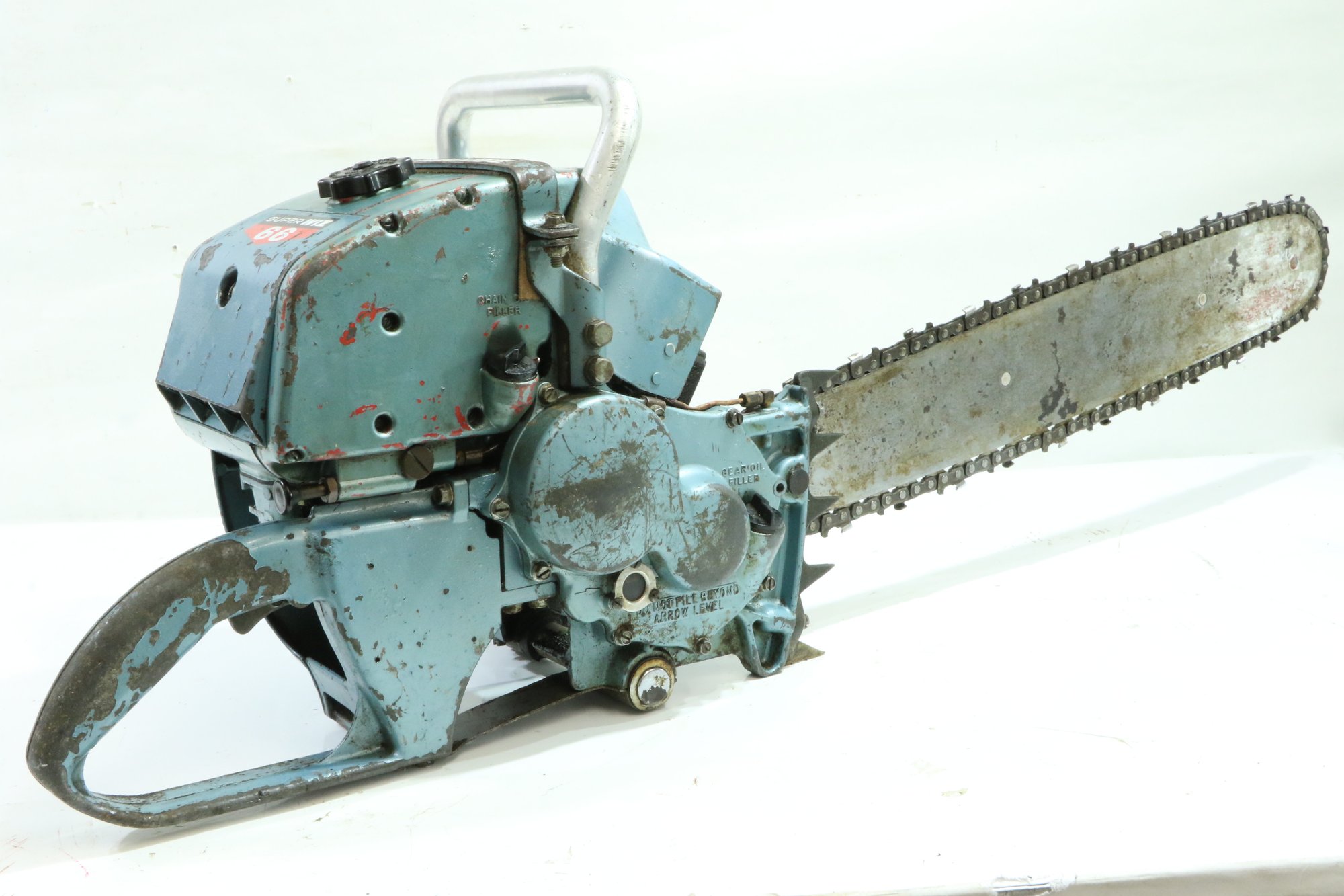 the spring in the pull cord is broken..sold as-is untested..very rare chainsaw
