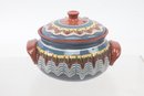 Double handled terracotta lidded cooking pot with beautiful marbled blue, yellow