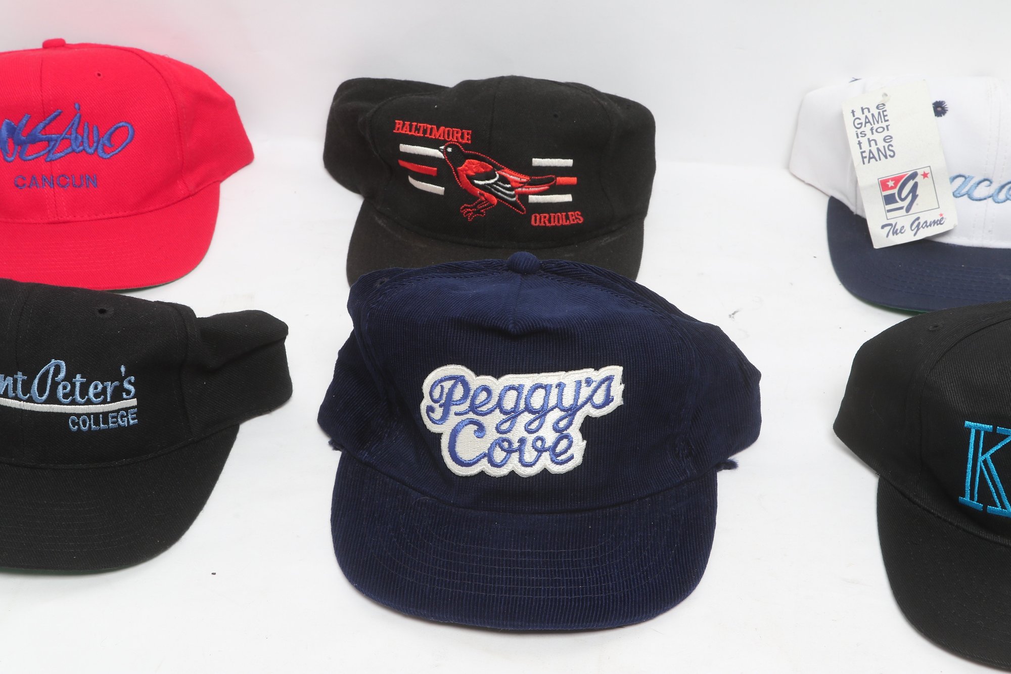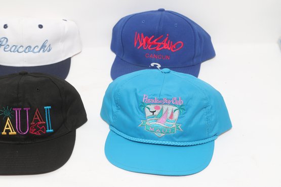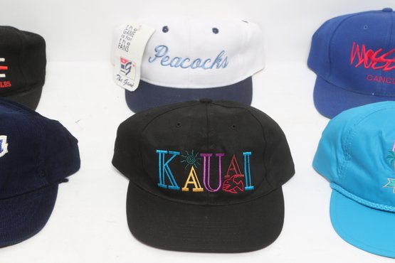 Lot of assorted vintage-style snapback hats featuring Saint Peter’s College, Kauai, Peacock Cove, Mossimo Cancun, and other designs. Mixed colors and graphics with adjustable backs. Show light to moderate wear—great for collectors or everyday wear.