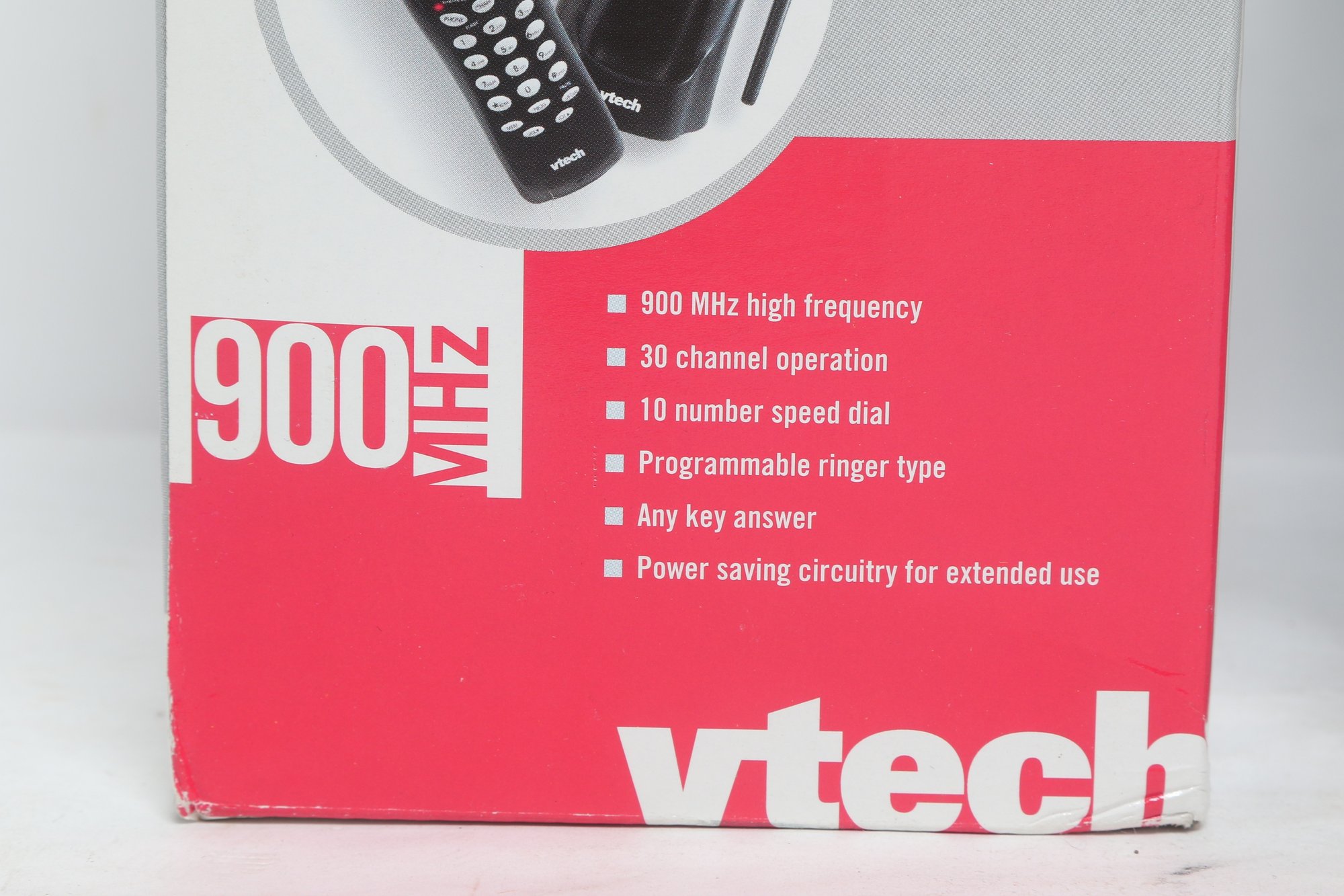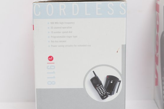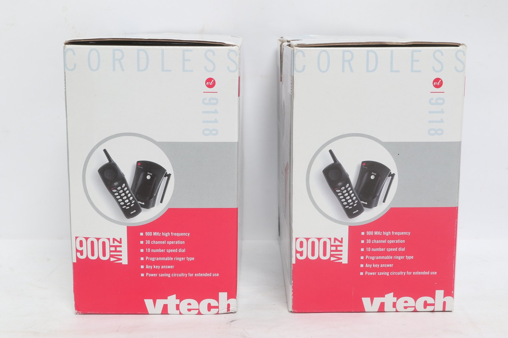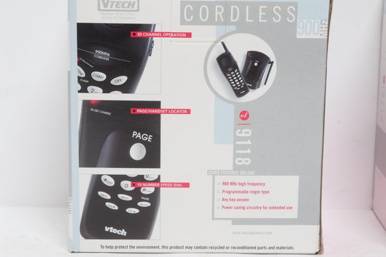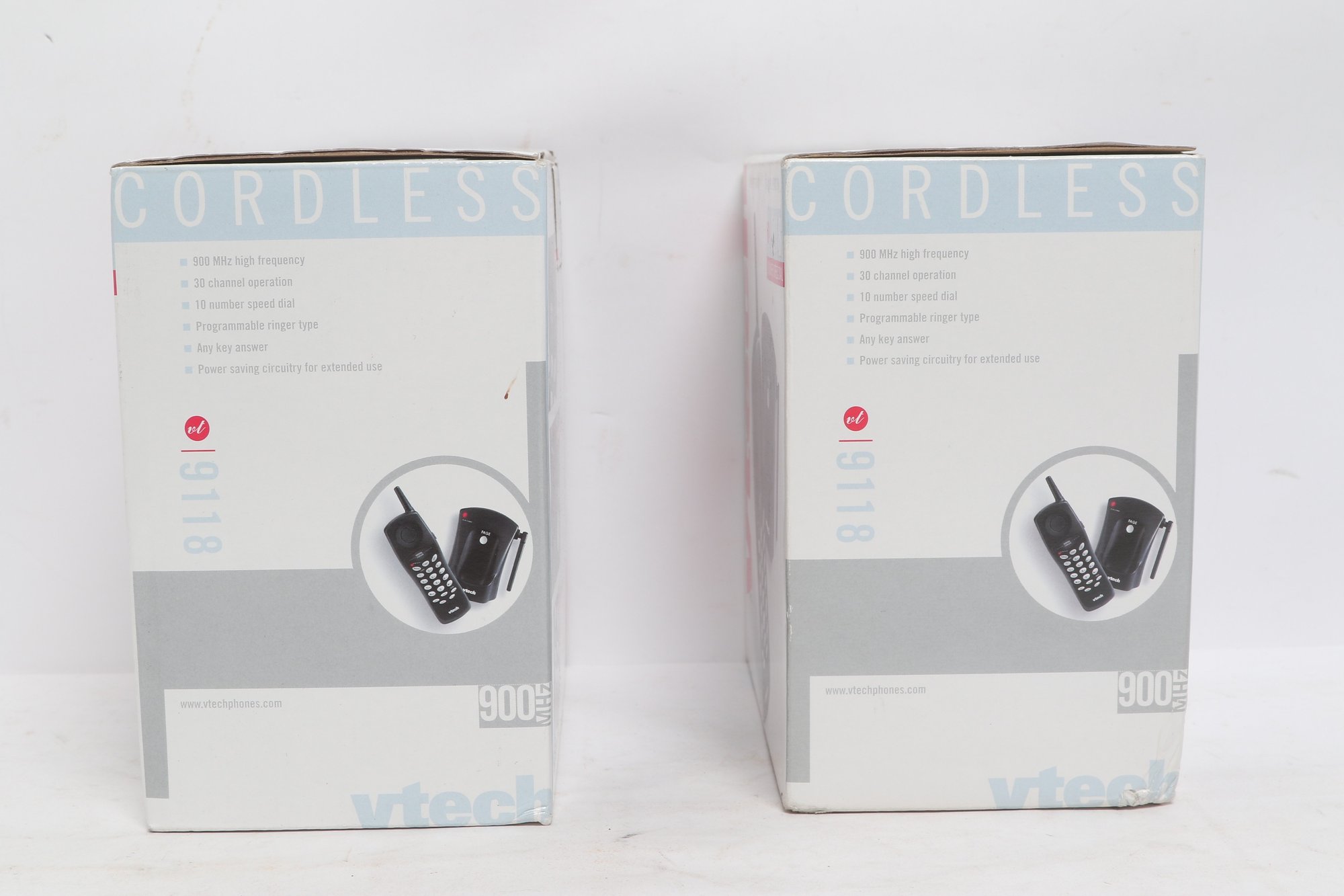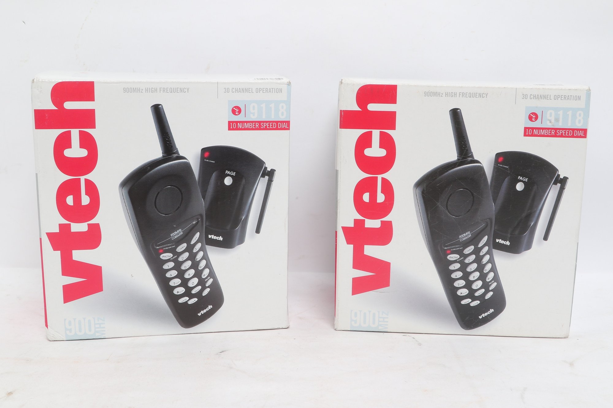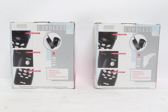 Lot of two VTech 900MHz cordless phone systems, both new in original boxes. Features include 30-channel operation, programmable memory, speed dial, and power-saving design. Ideal for home or office use. Boxes show minor storage wear; contents are new unused condition.