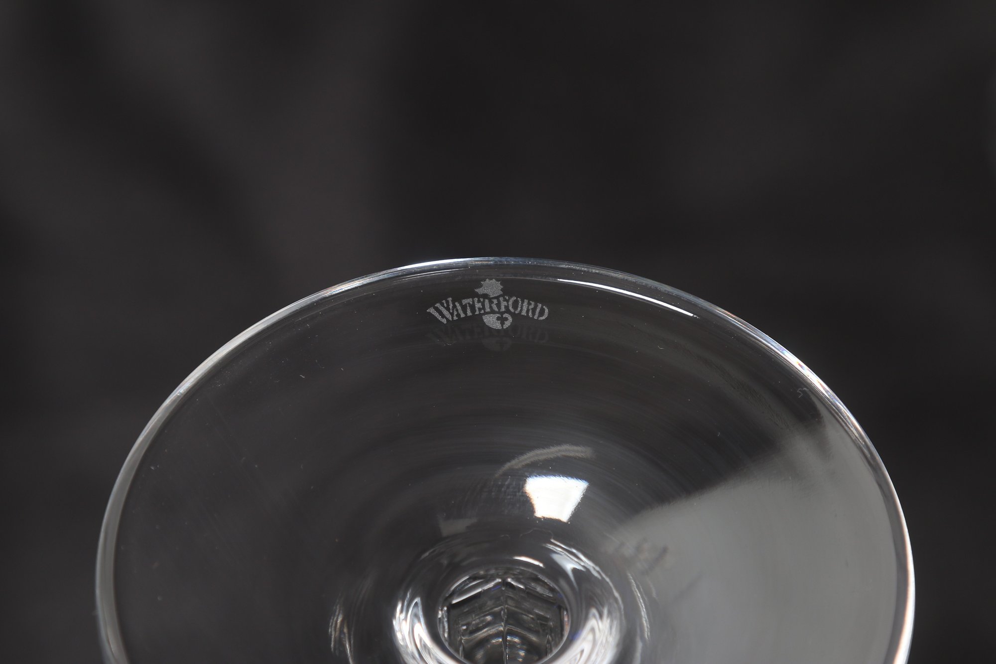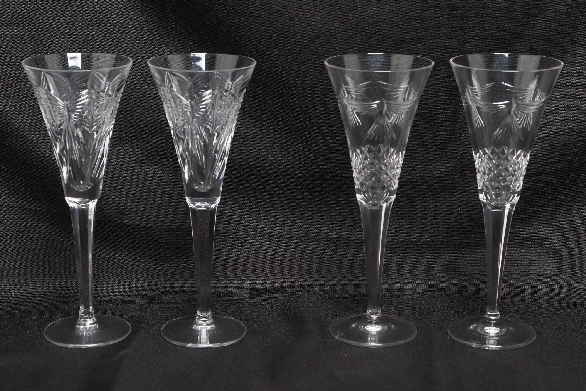 Set of four Waterford crystal champagne flutes featuring two different cut patterns. Elegant long stems with detailed etched designs. Pre-owned with light wear; no obvious chips or cracks observed.