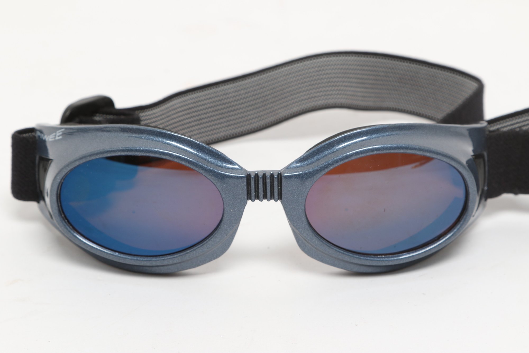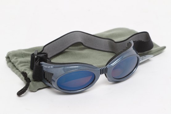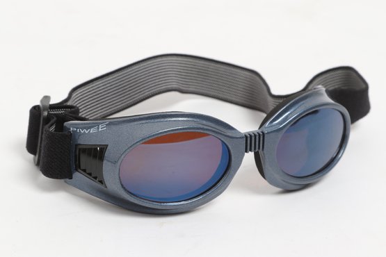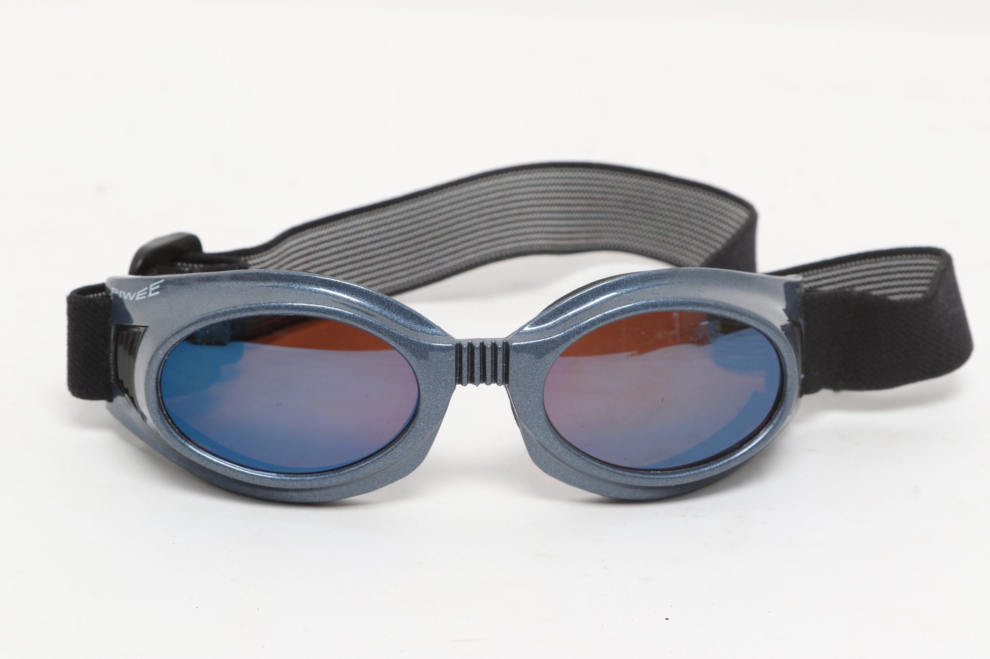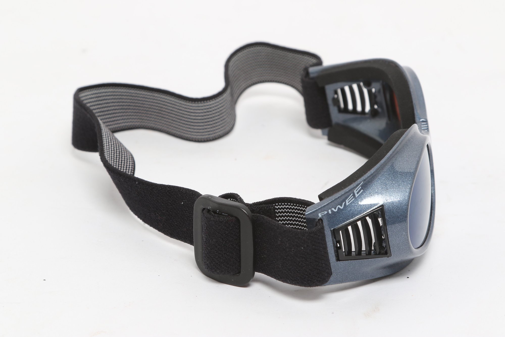 Piwee sports sunglasses/goggles featuring wraparound design with tinted lenses and adjustable elastic strap for secure fit. Includes soft pouch; pre-owned with light wear.