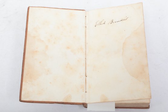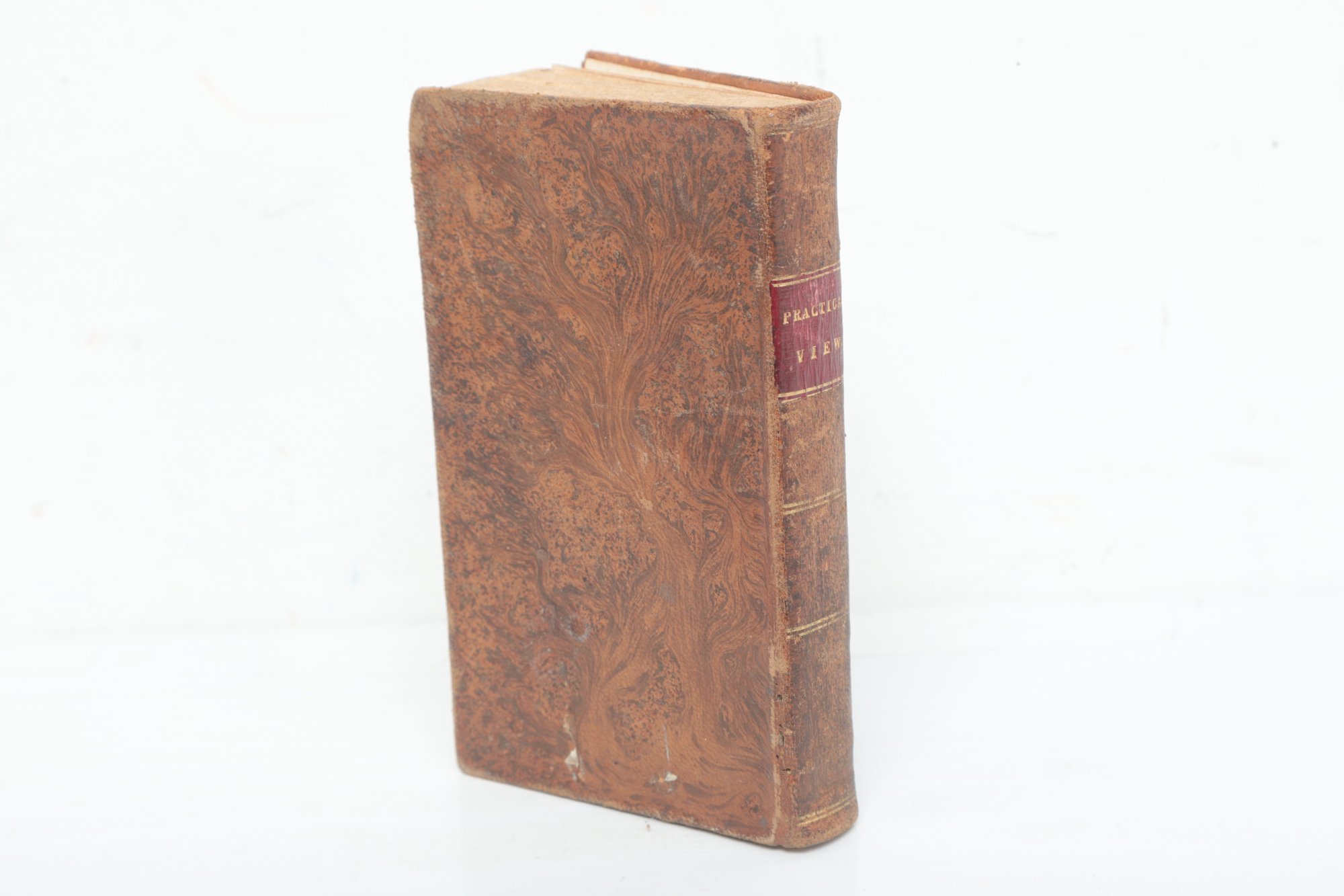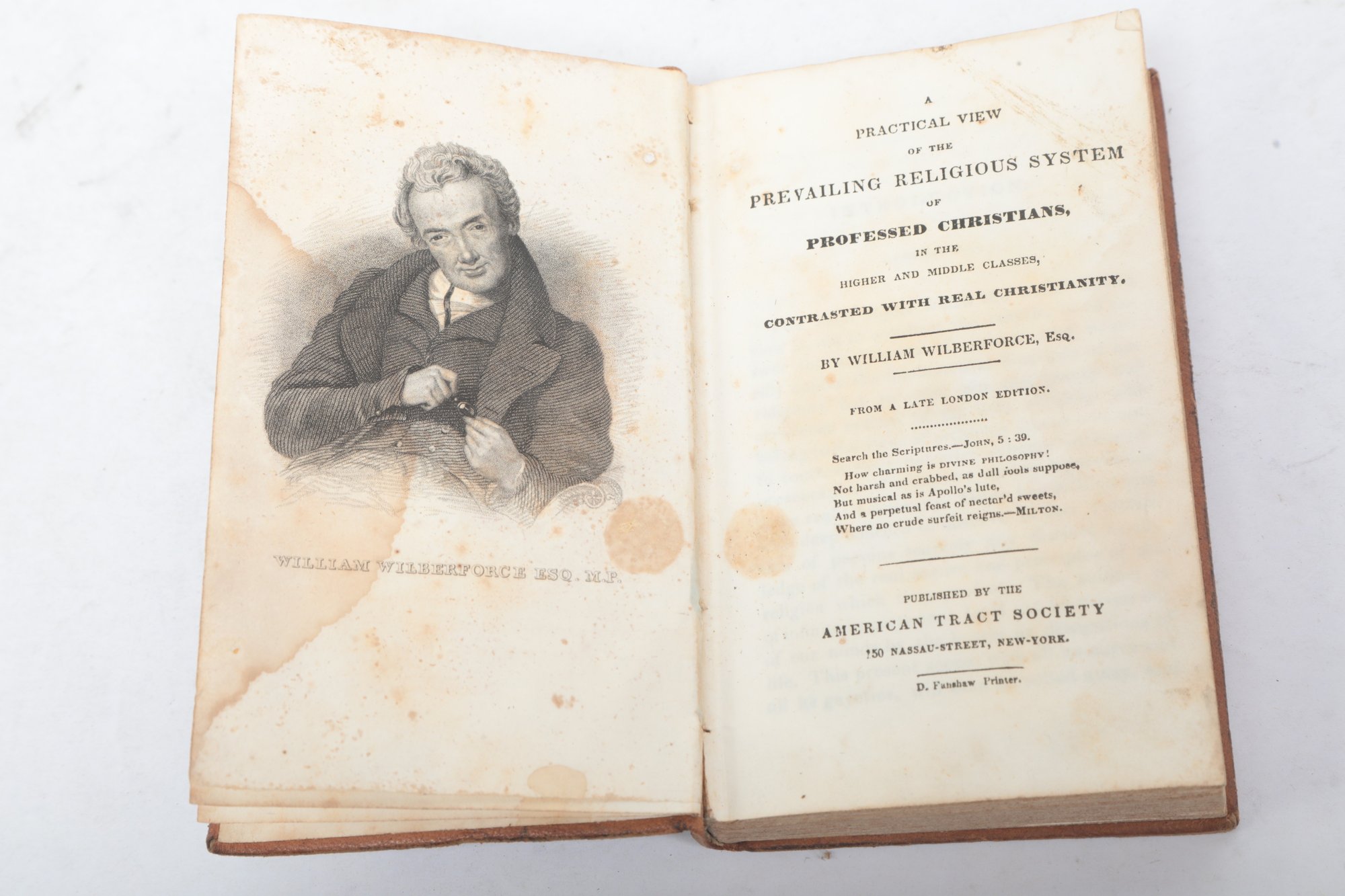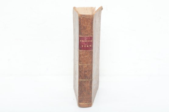 New York: Published by the American Tract Society, 150 Nassau-Street; D. Fanshaw, Printer. From a late London edition. Contemporary full calf with red morocco spine label lettered in gilt, boards mottled in tree calf style, spine ruled in gilt. Engraved portrait frontispiece of William Wilberforce, Esq., M.P. The influential evangelical work contrasting nominal Christianity with “real Christianity,” widely circulated in American editions by the Tract Society. Leather rubbed with moderate wear at extremities, joints sound; scattered foxing and several tide stains to frontispiece and title, text generally clean and legible. A solid nineteenth-century American issue of Wilberforce’s important religious classic.