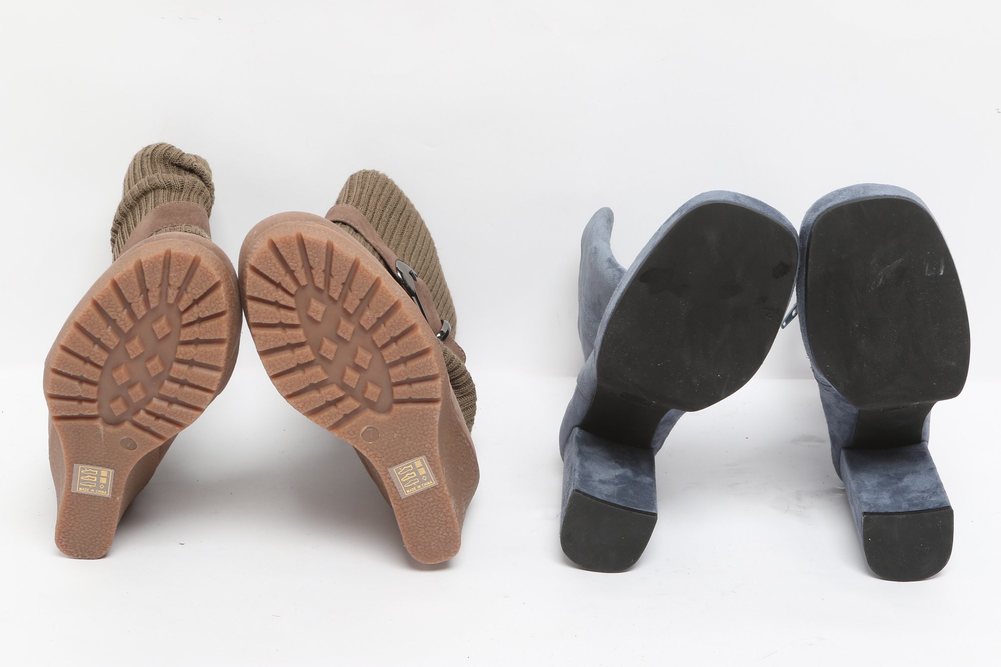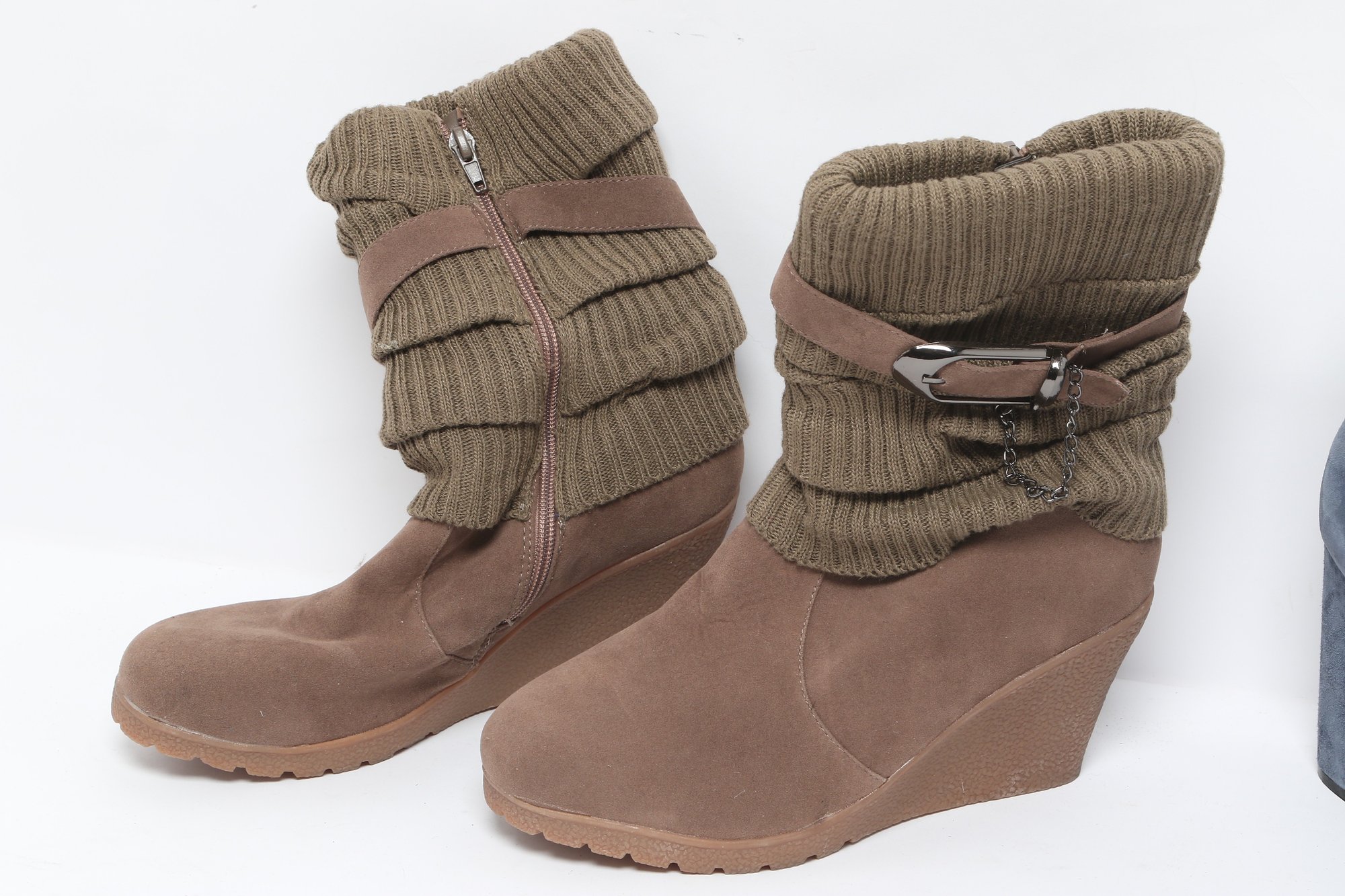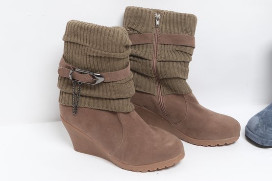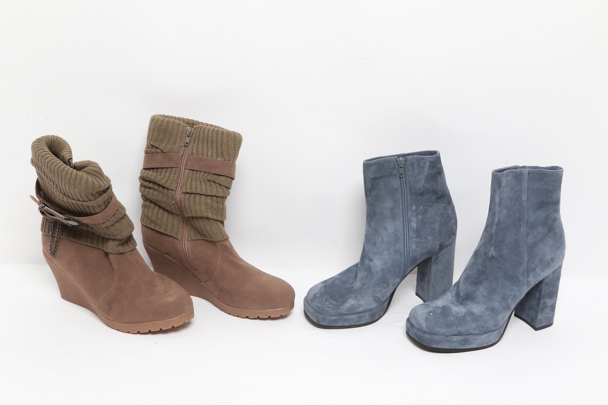 Lot of two pairs of women’s boots including brown wedge ankle boots with knit cuff and buckle detail, and blue suede heeled ankle booties. Pre-owned with visible wear; versatile styles for fall and winter wear. Brown boots are size 7 & blue boots are a size 8.5.