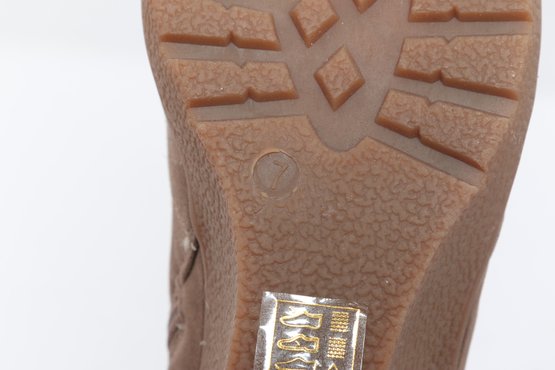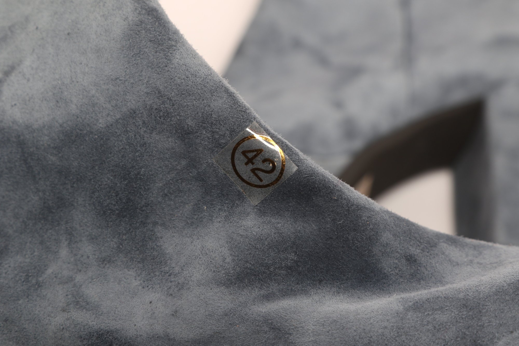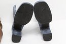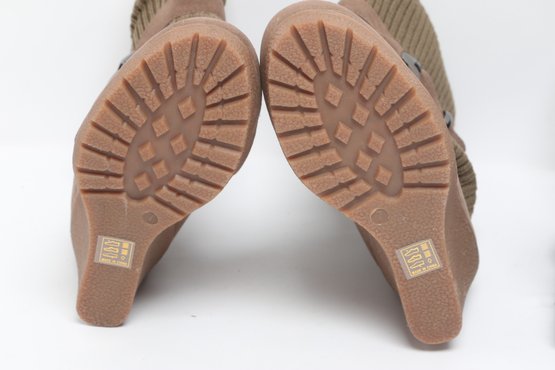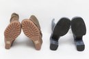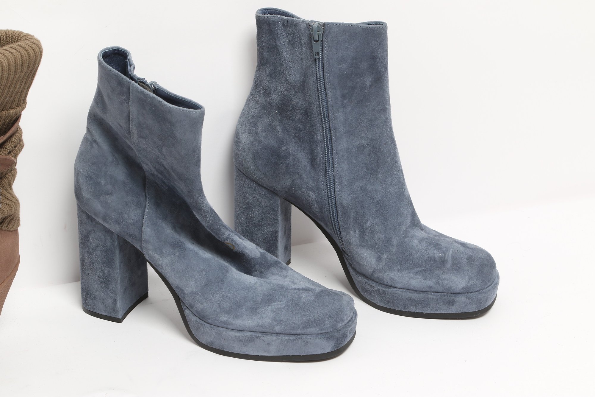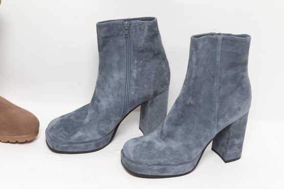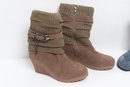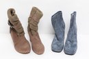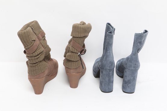 Lot of two pairs of women’s boots including brown wedge ankle boots with knit cuff and buckle detail, and blue suede heeled ankle booties. Pre-owned with visible wear; versatile styles for fall and winter wear. Brown boots are size 7 & blue boots are a size 8.5.