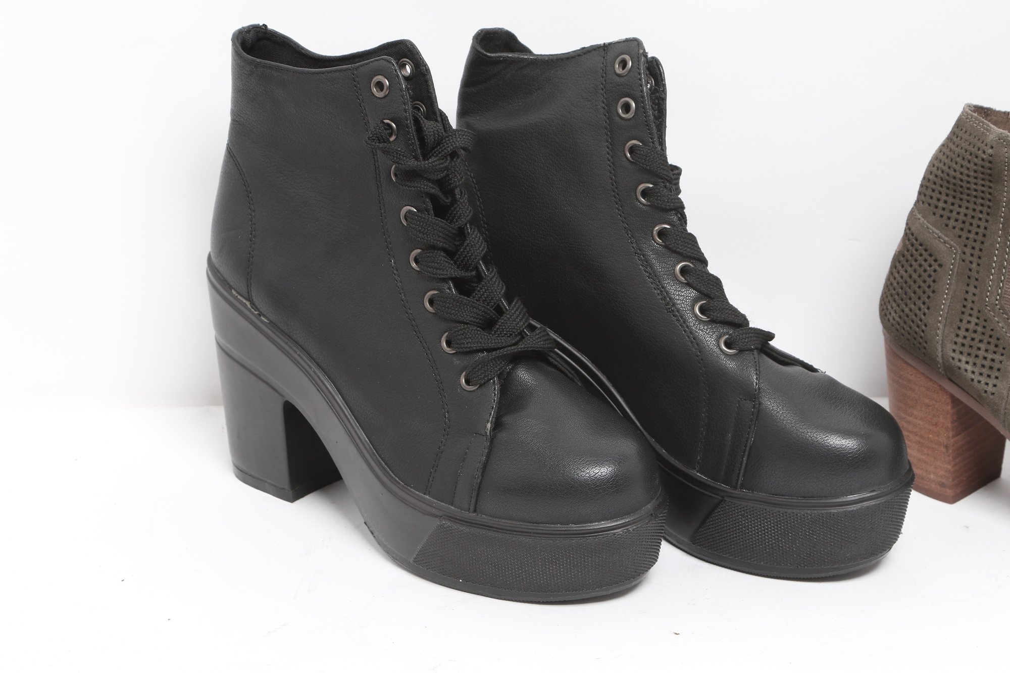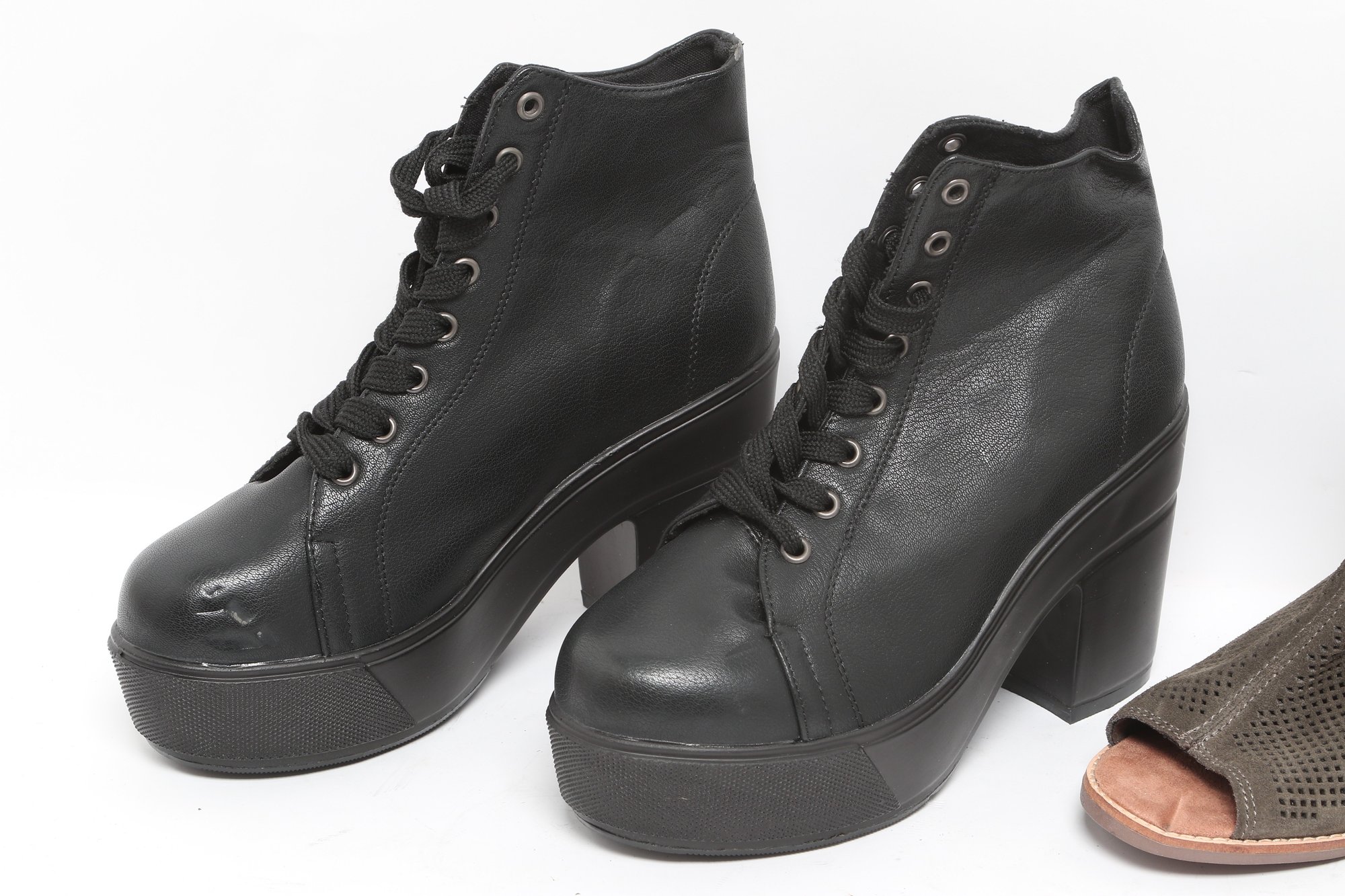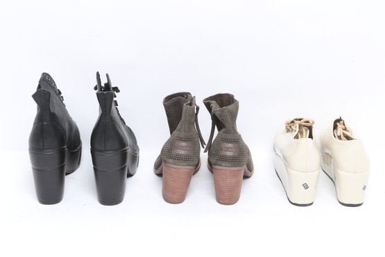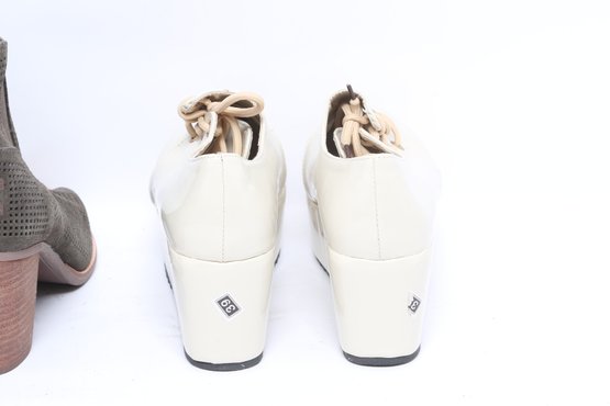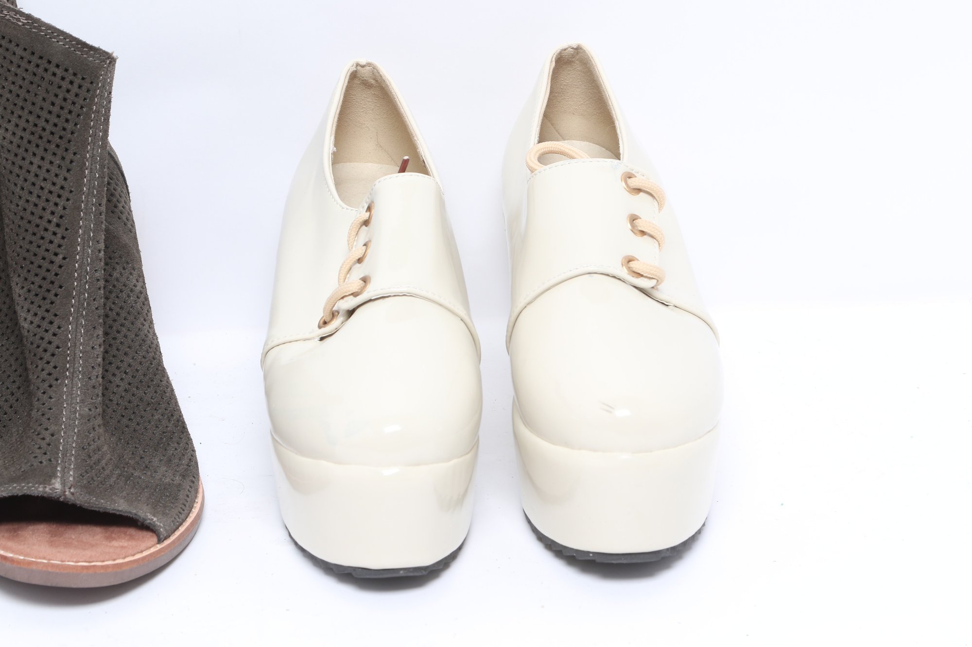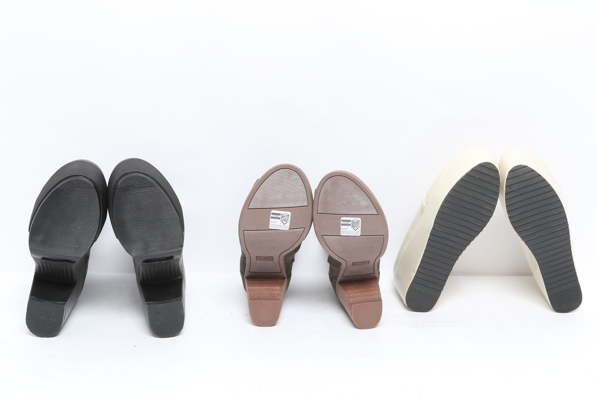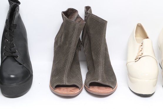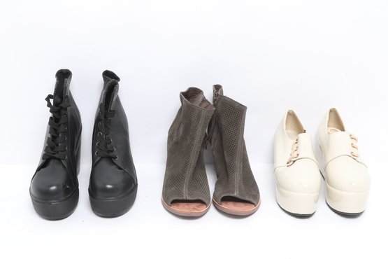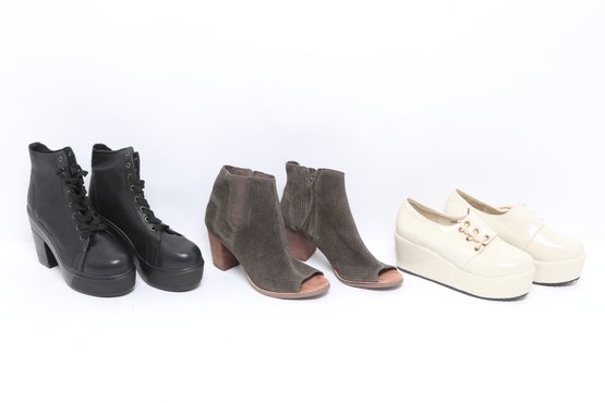 Lot of three pairs of women’s shoes including black platform lace-up ankle boots, brown perforated peep-toe heeled booties, and white platform oxford-style shoes. Pre-owned with visible wear; varied styles suitable for casual or fashion wear. White shoes size 9, green shoes are size 8.5 and black shoes are size 9.