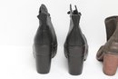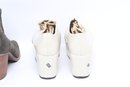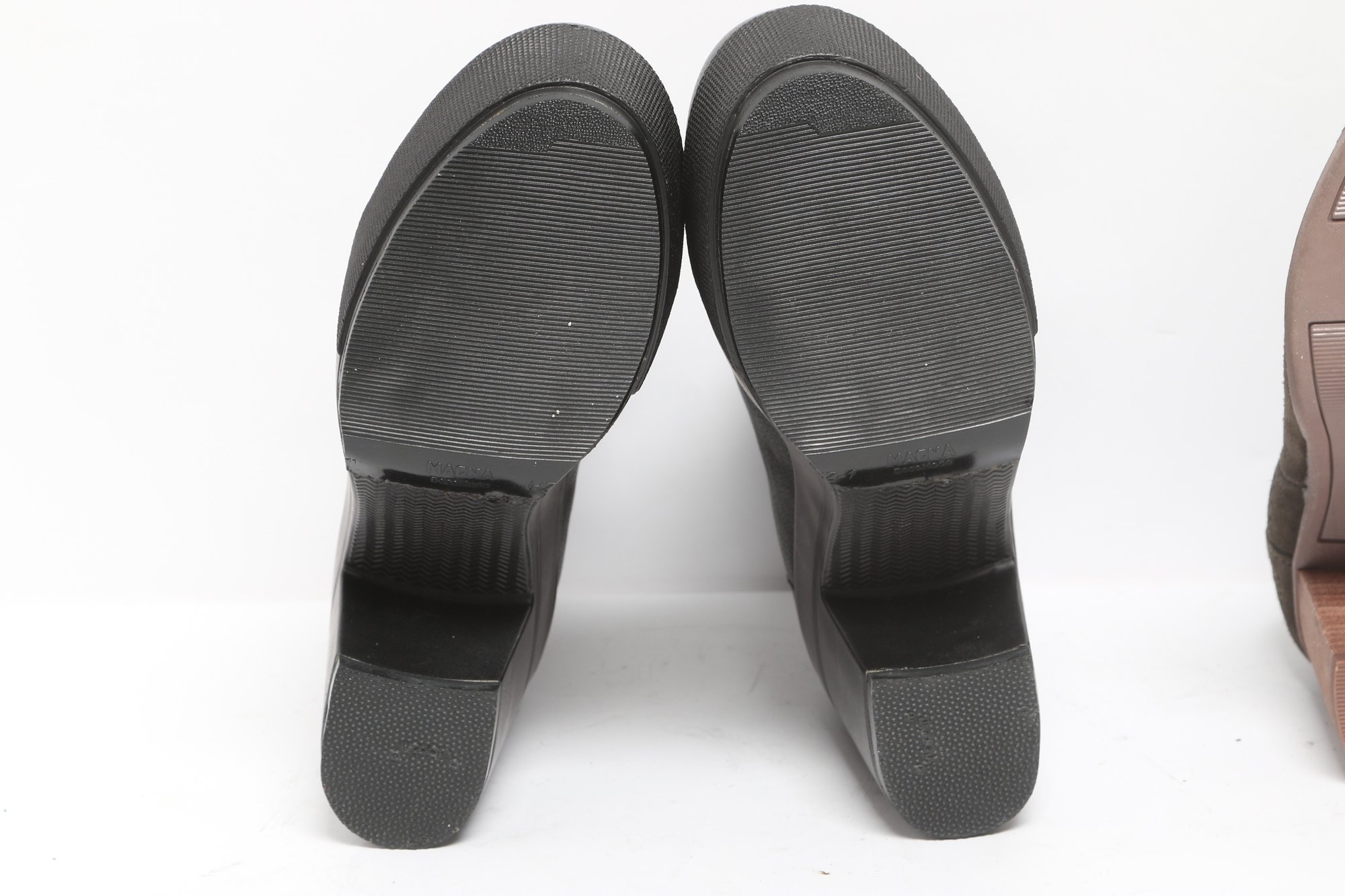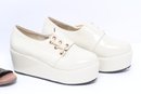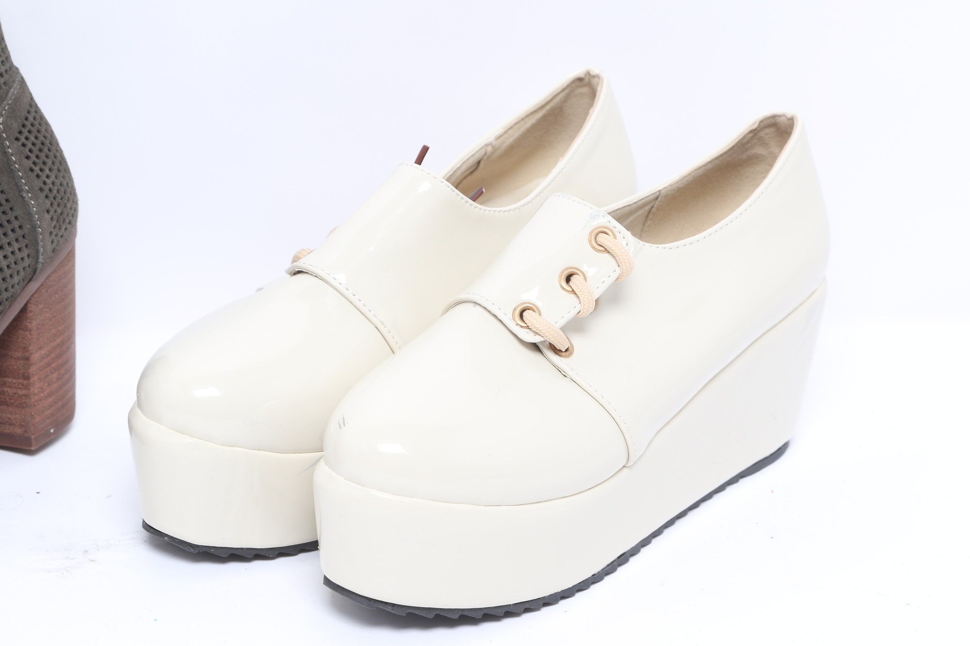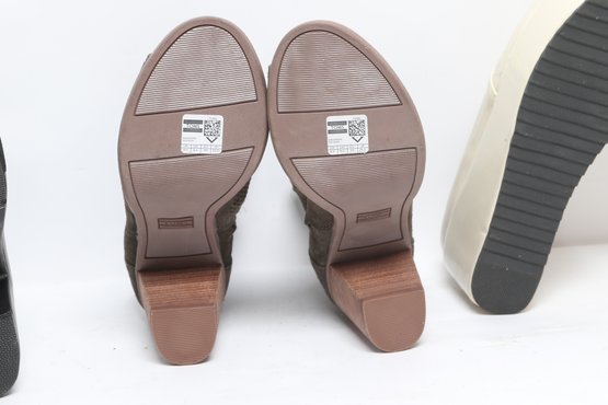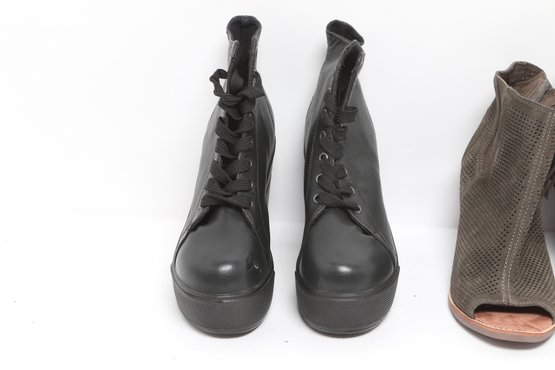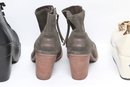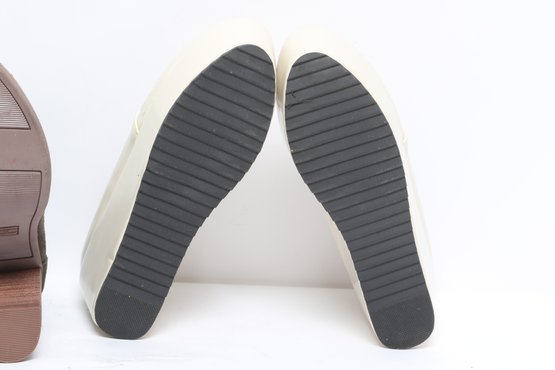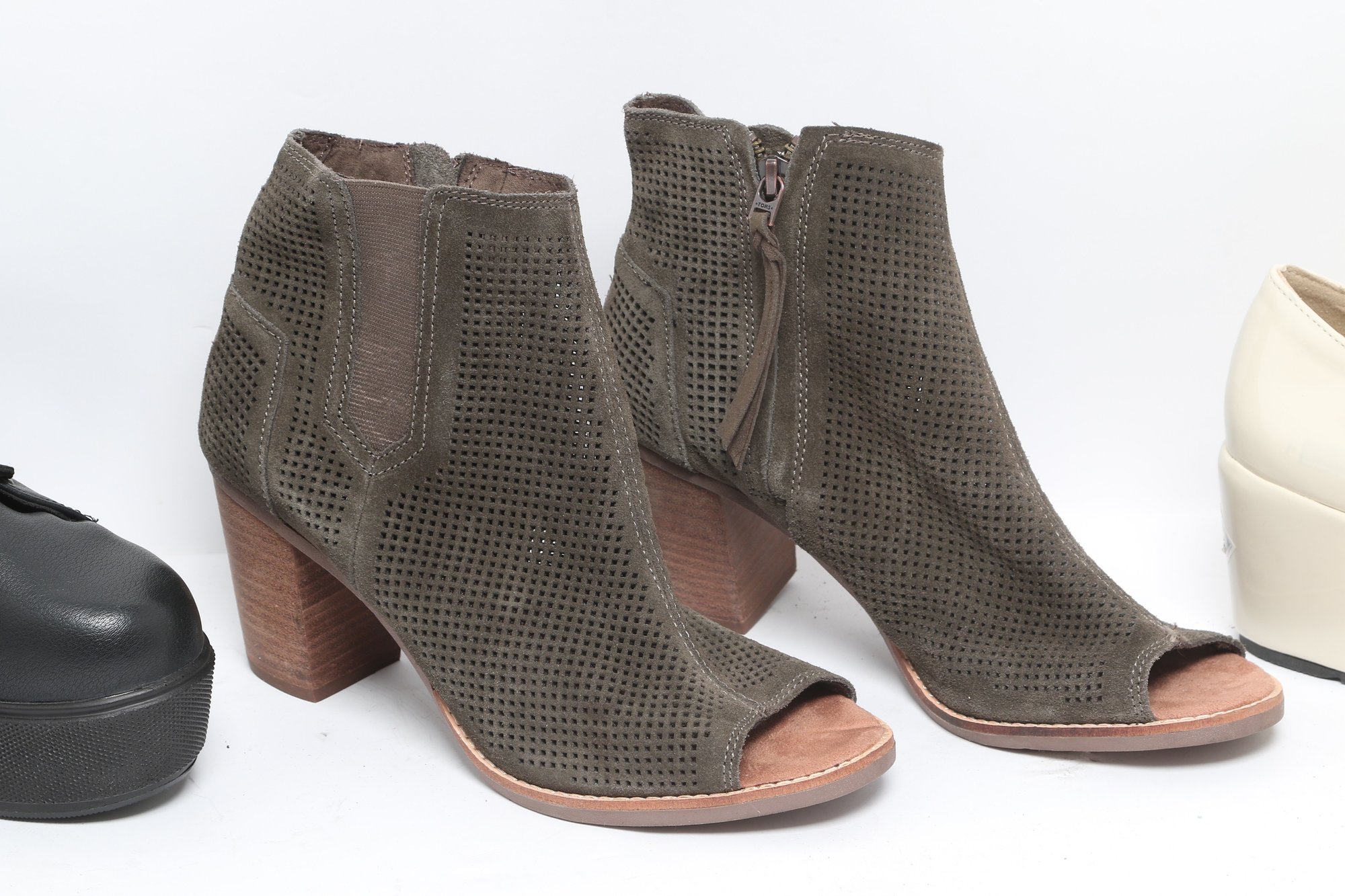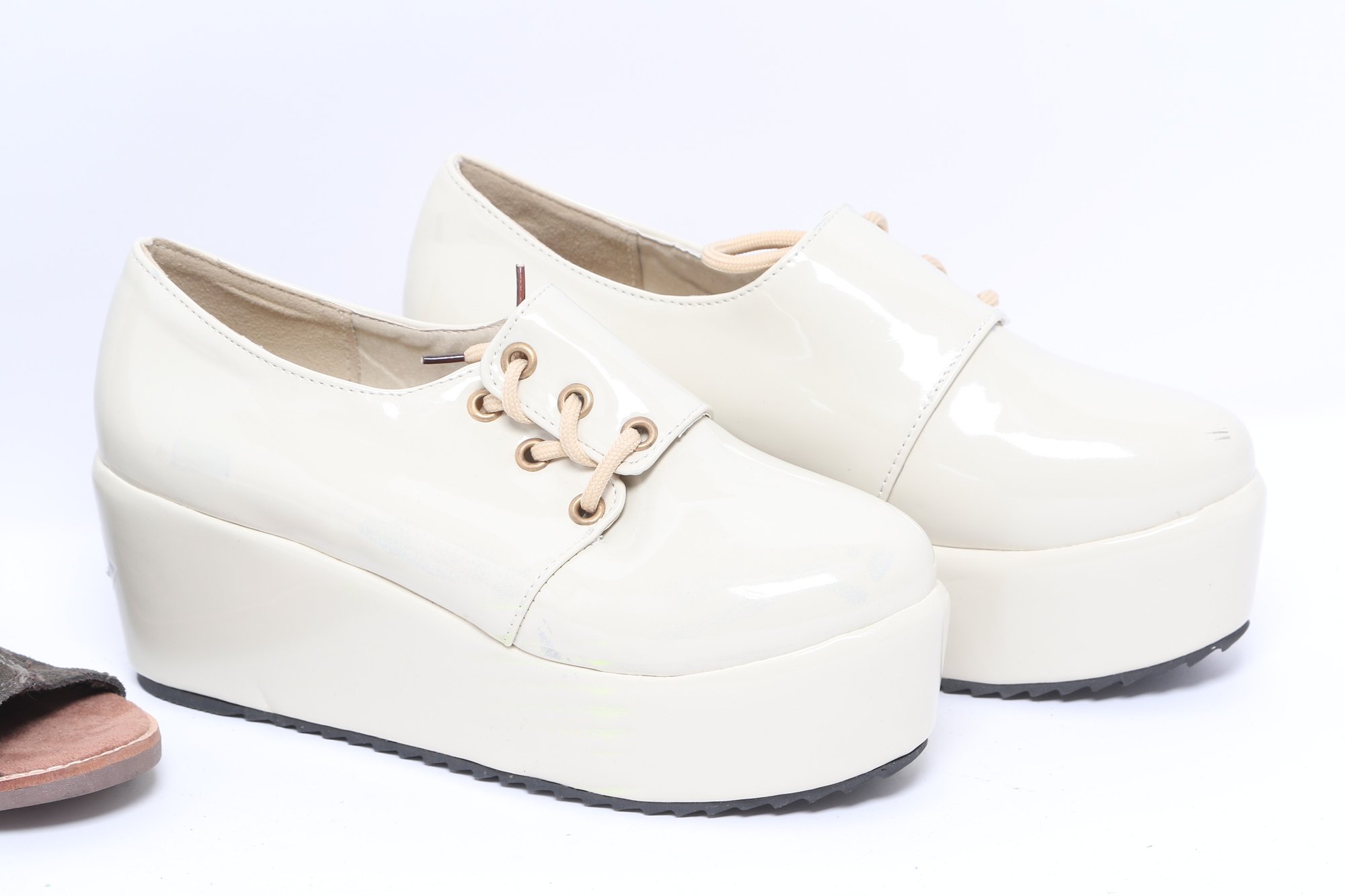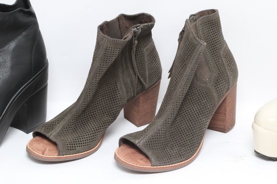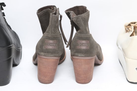 Lot of three pairs of women’s shoes including black platform lace-up ankle boots, brown perforated peep-toe heeled booties, and white platform oxford-style shoes. Pre-owned with visible wear; varied styles suitable for casual or fashion wear. White shoes size 9, green shoes are size 8.5 and black shoes are size 9.