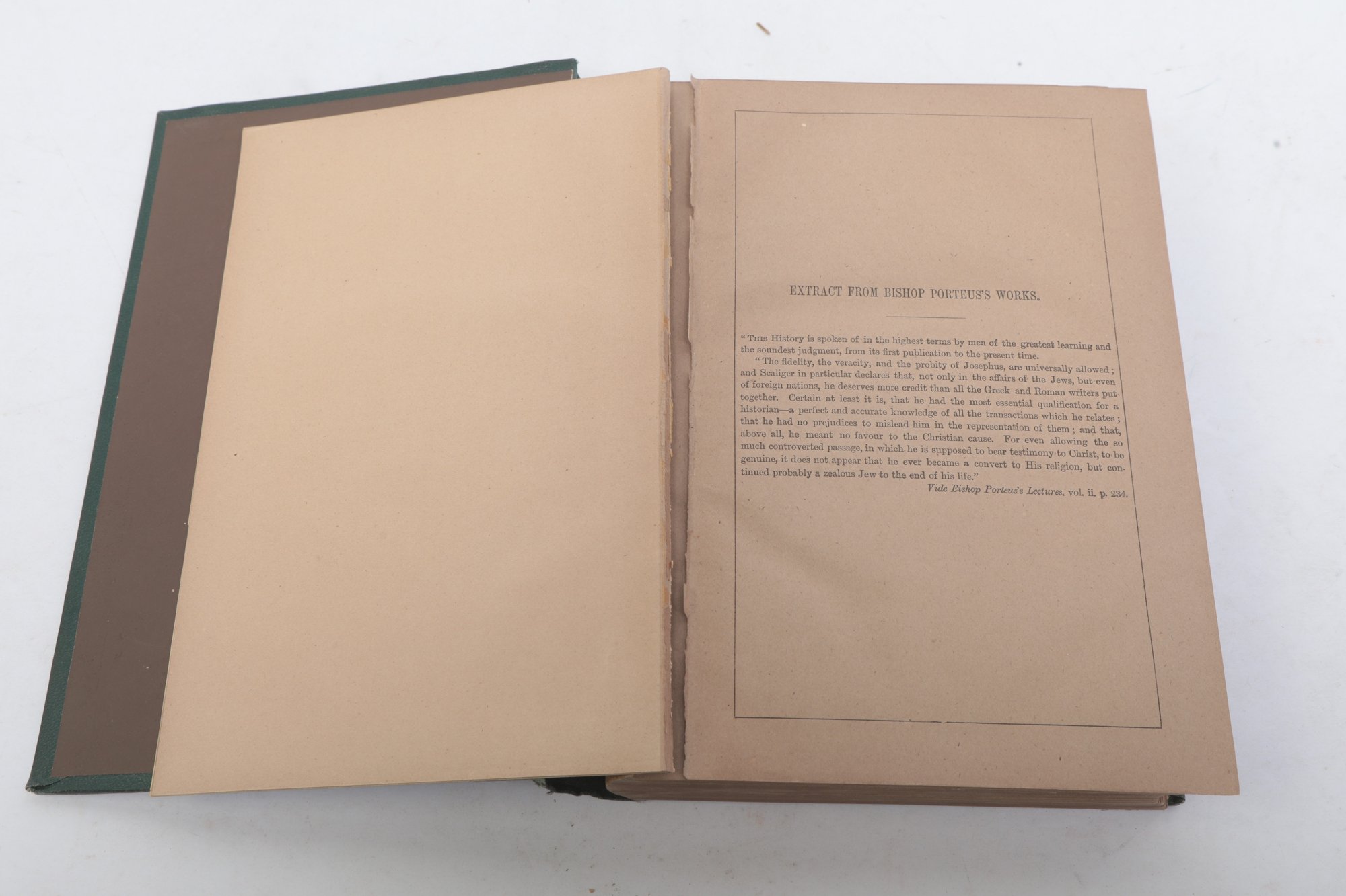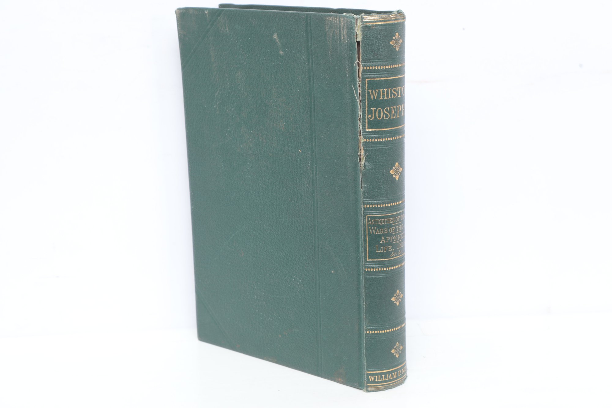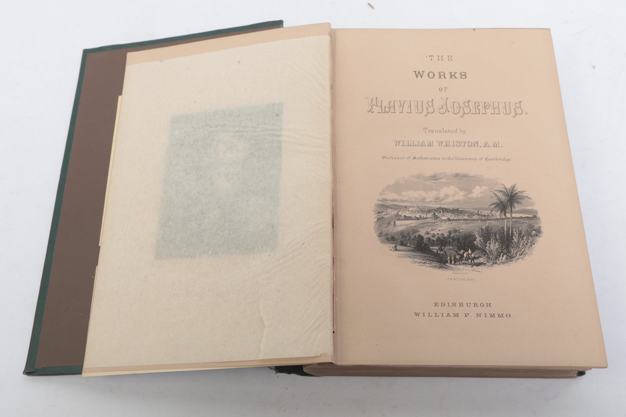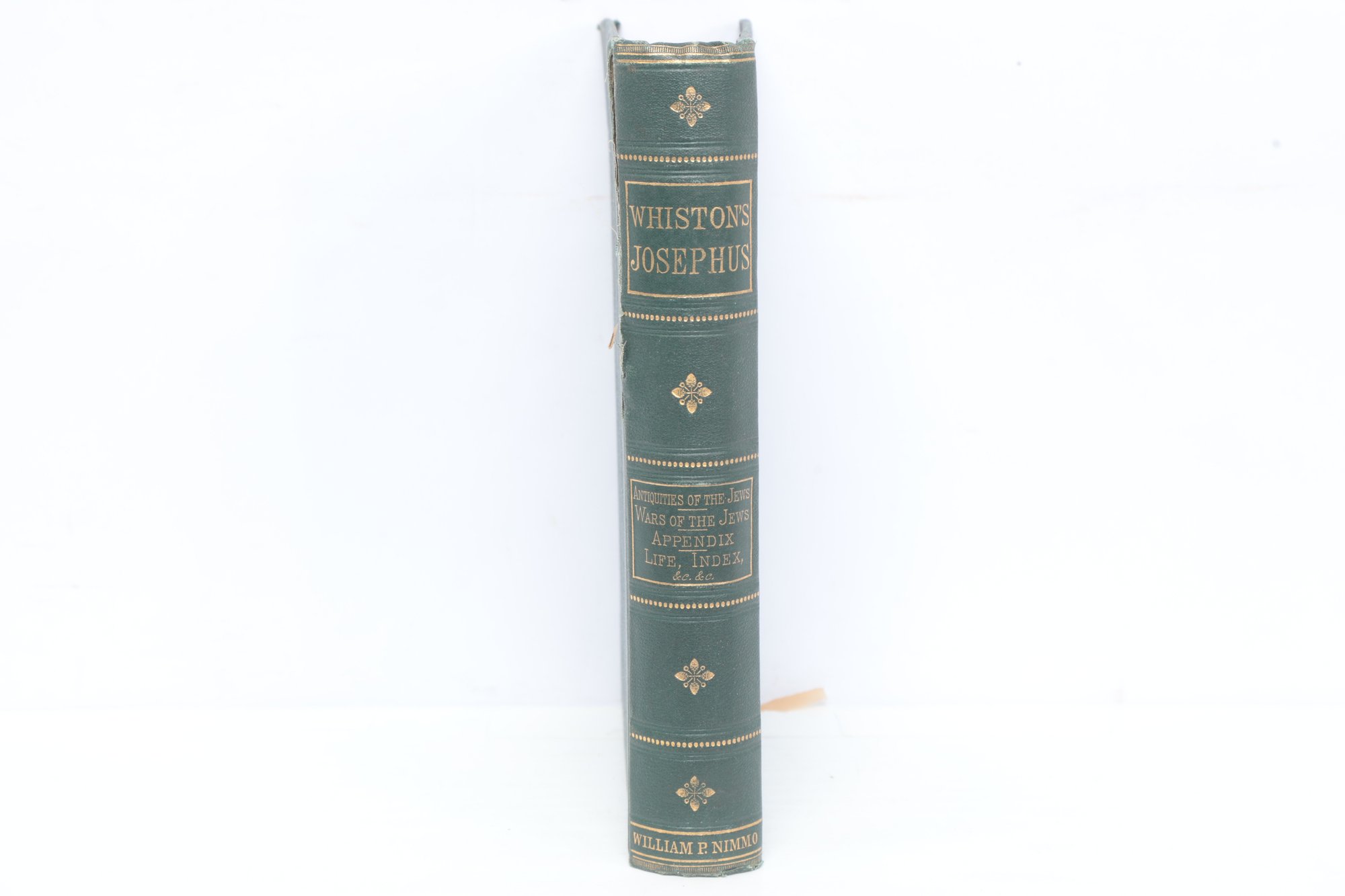 William Whiston (translator), The Works of Flavius Josephus. Edinburgh: William P. Nimmo, nineteenth-century edition. Octavo, rebound in later green cloth with gilt-stamped spine, retaining the original engraved title vignette. A durable scholarly reissue of Whiston’s influential English translation of the Jewish historian Josephus, long central to biblical and classical studies, here in a sound working binding with moderate internal toning.