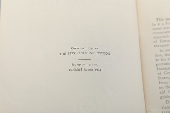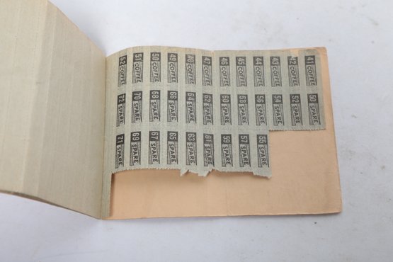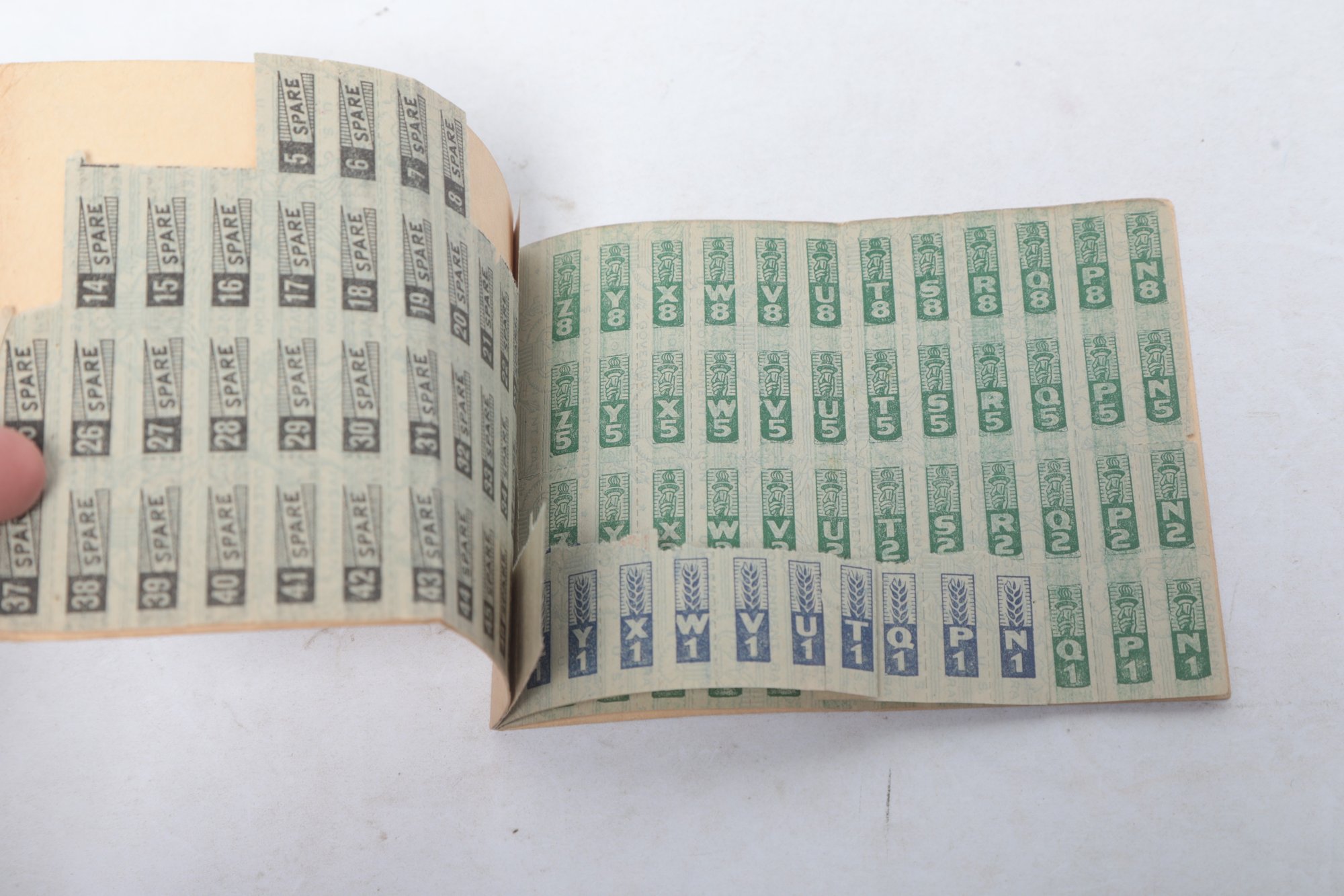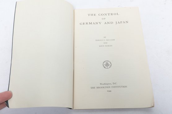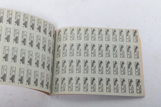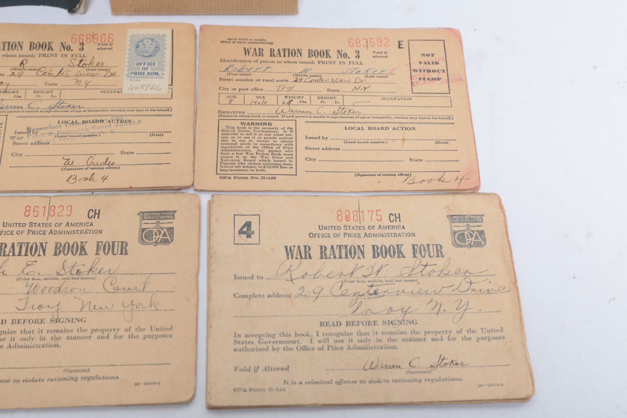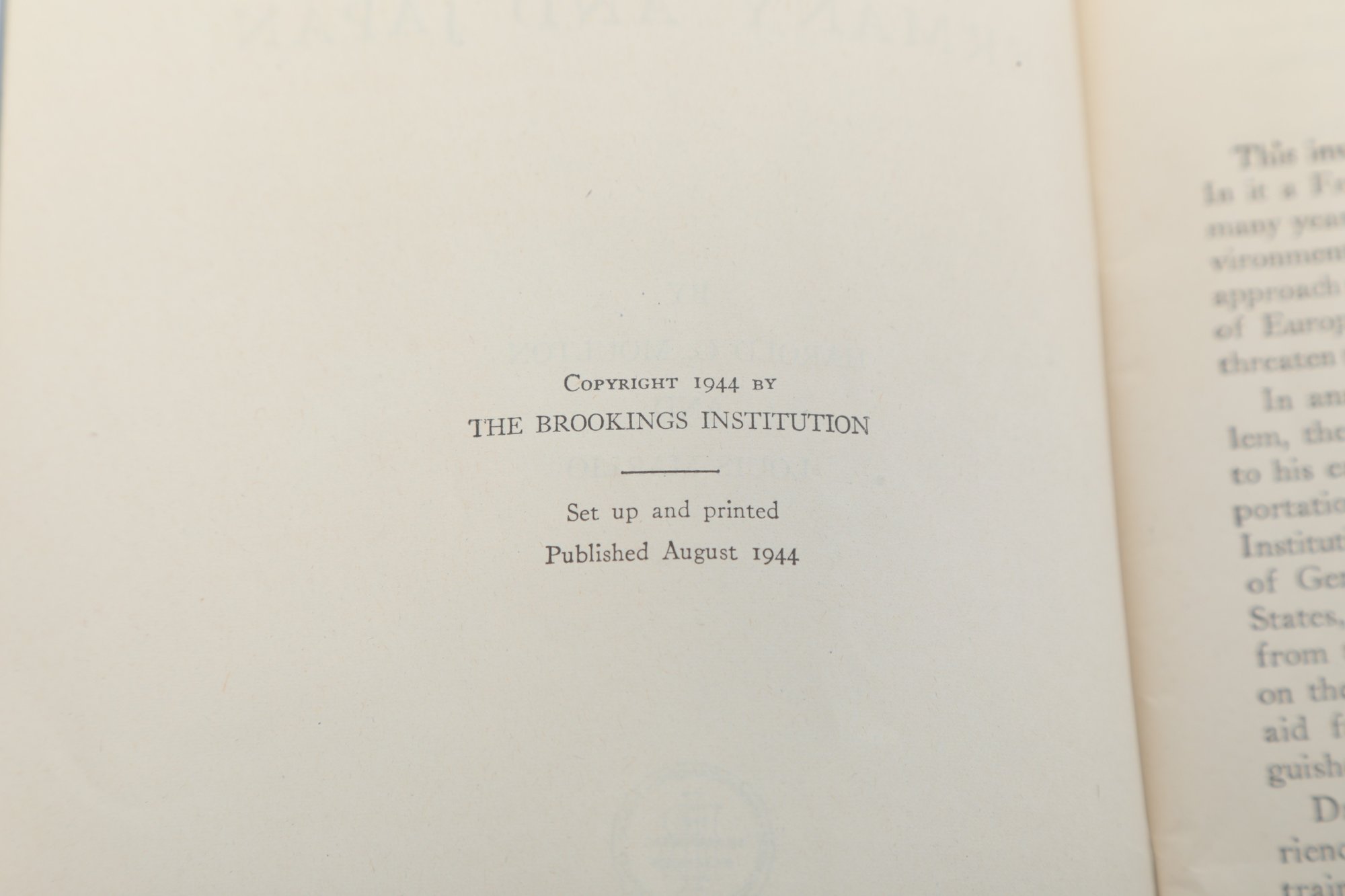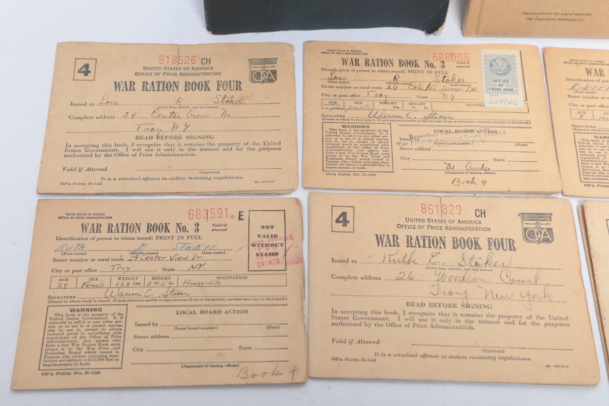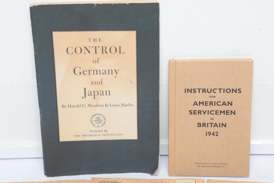 Washington D.C. The Brookings Institution and U.S. Government Printing Office 1942-1944. Six softcover War Ration Books (No. 3 and No. 4) and two historical booklets in paper wraps. Significant age-toning and edge wear to ration books; "The Control of Germany and Japan" shows chipping to spine and extremities. All ration books are filled out in ink for the Stoker family of Troy, New York.