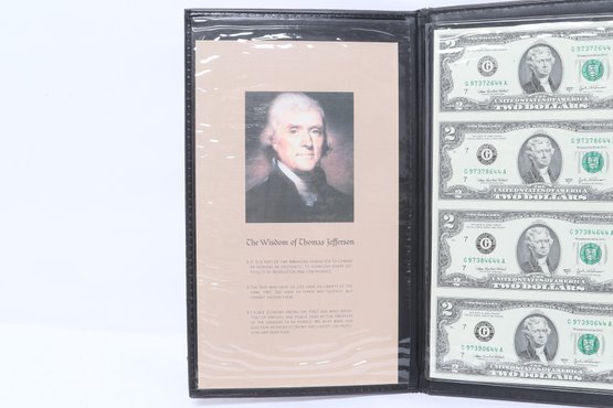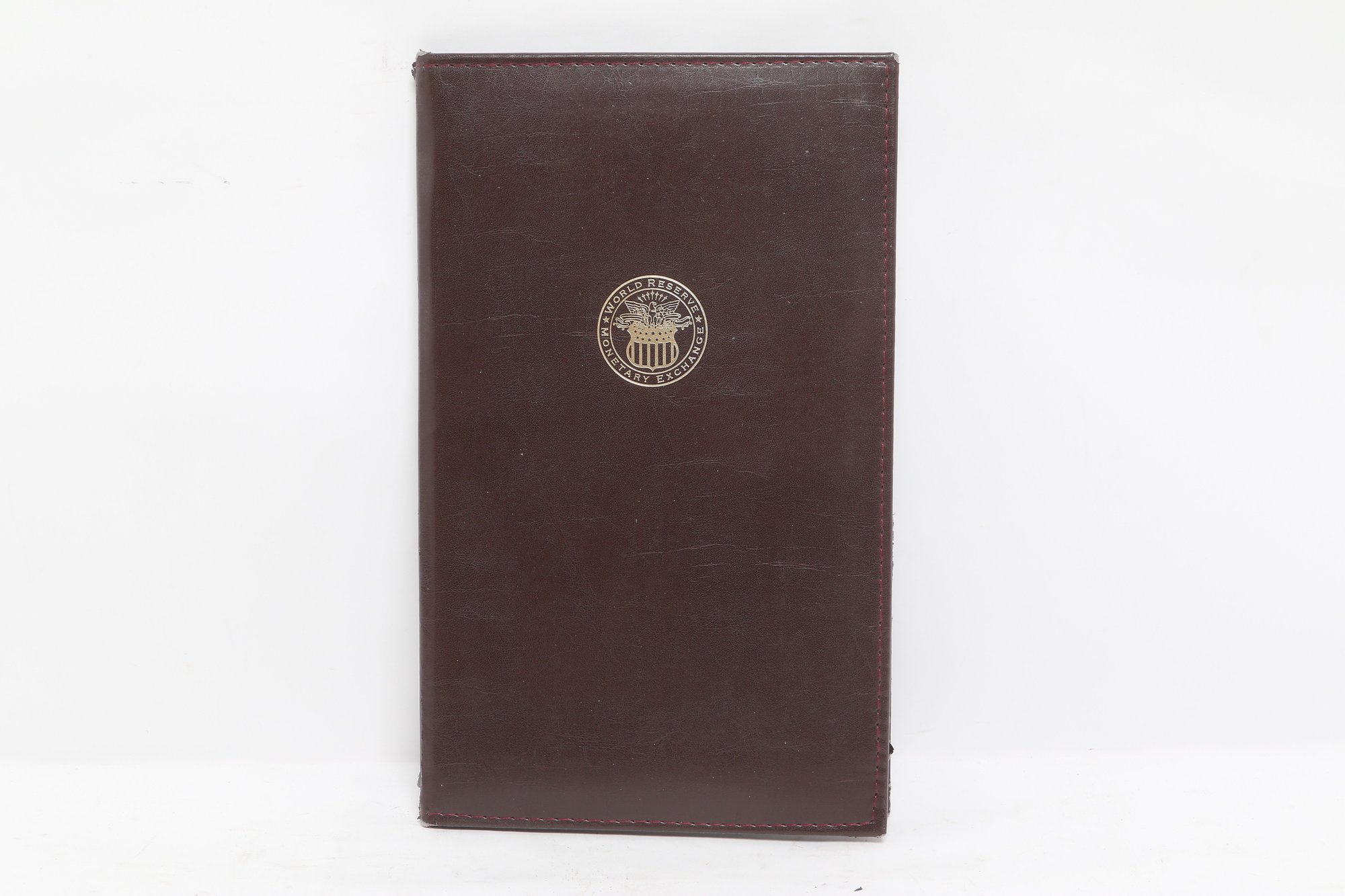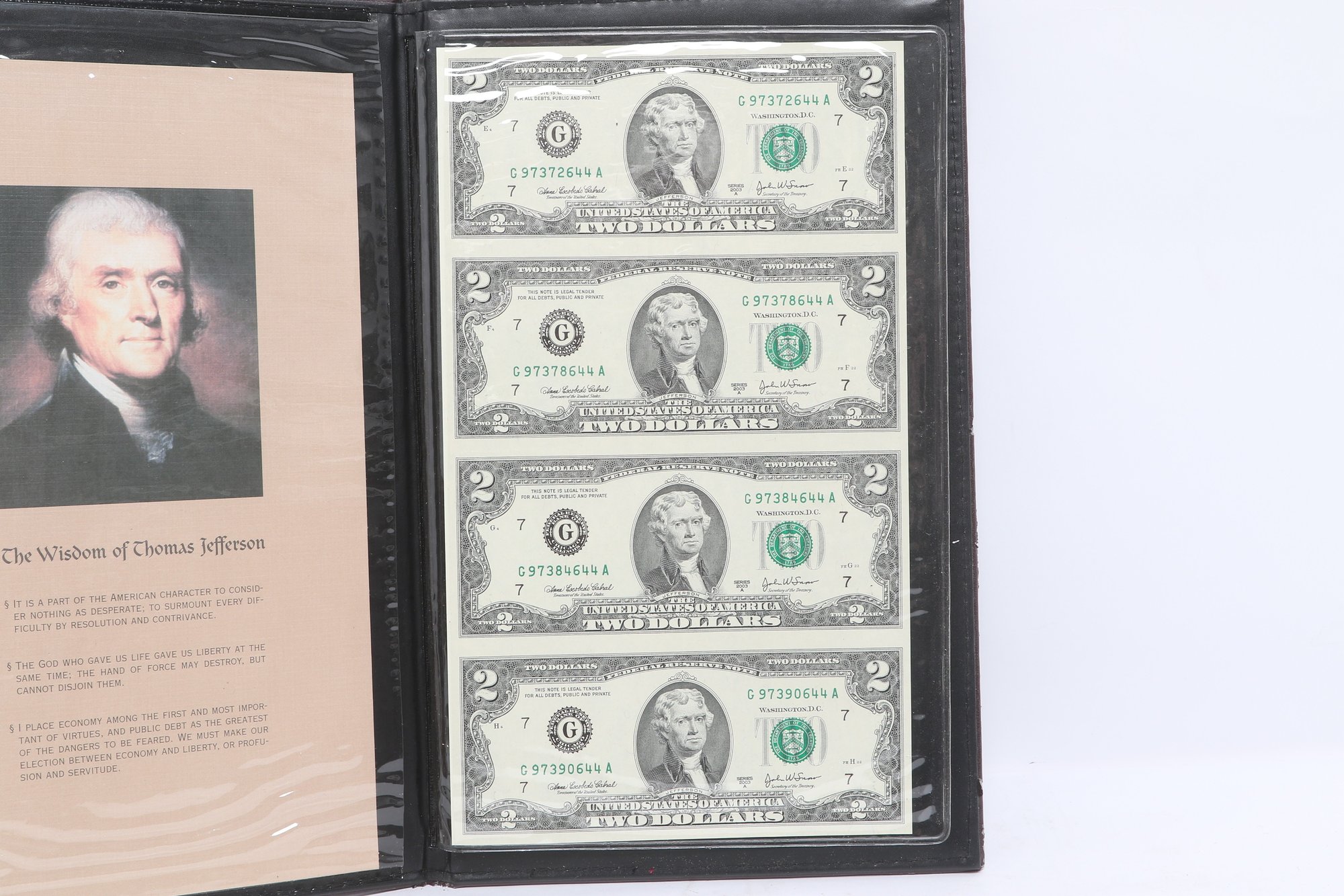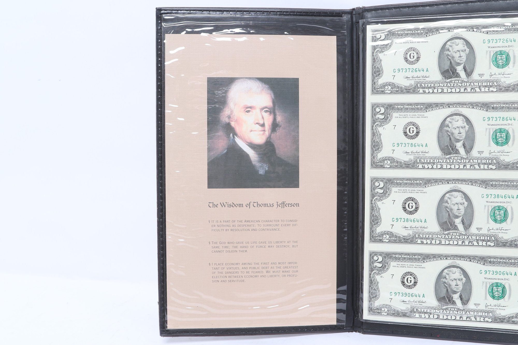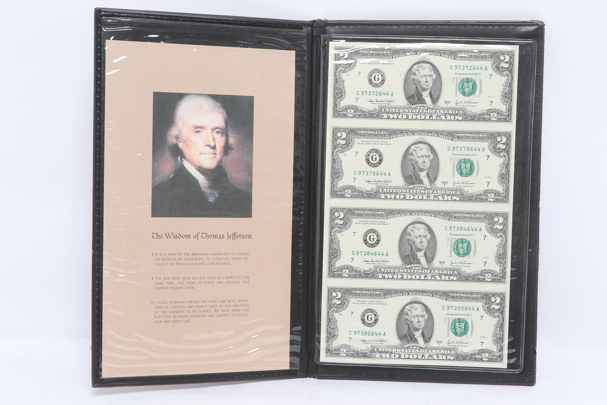 World Reserve Monetary Exchange folio featuring a collection of uncut $2 bills displayed alongside a portrait and “The Wisdom of Thomas Jefferson” insert. Housed in a brown leatherette binder with gold emblem on the cover. Bills appear crisp and well-presented; overall set in very good condition.