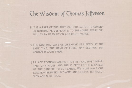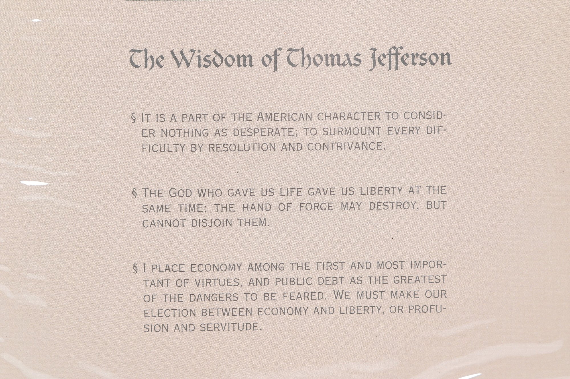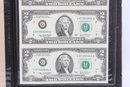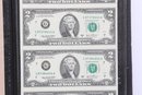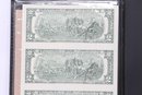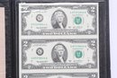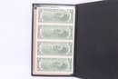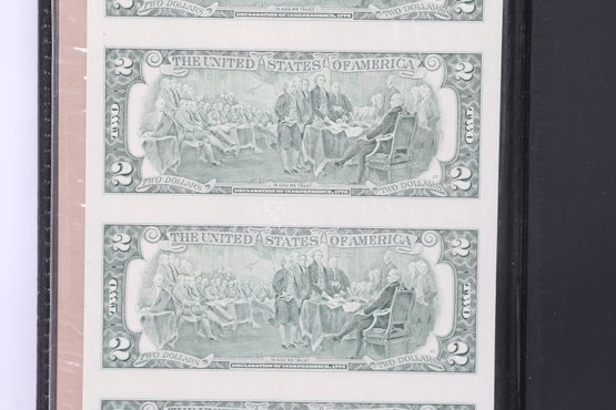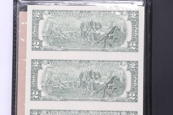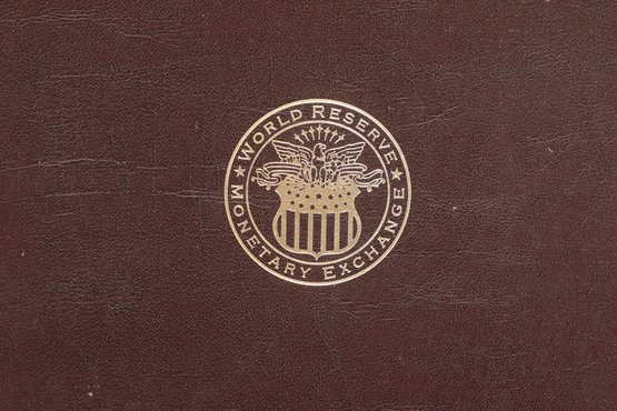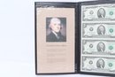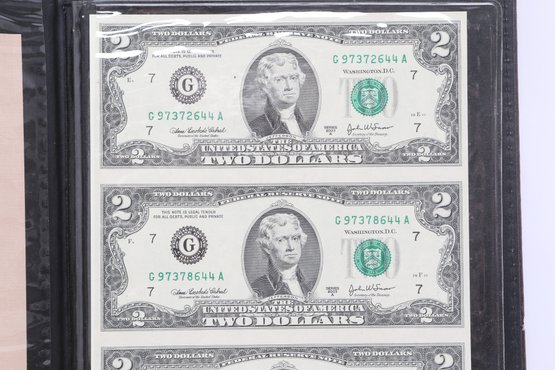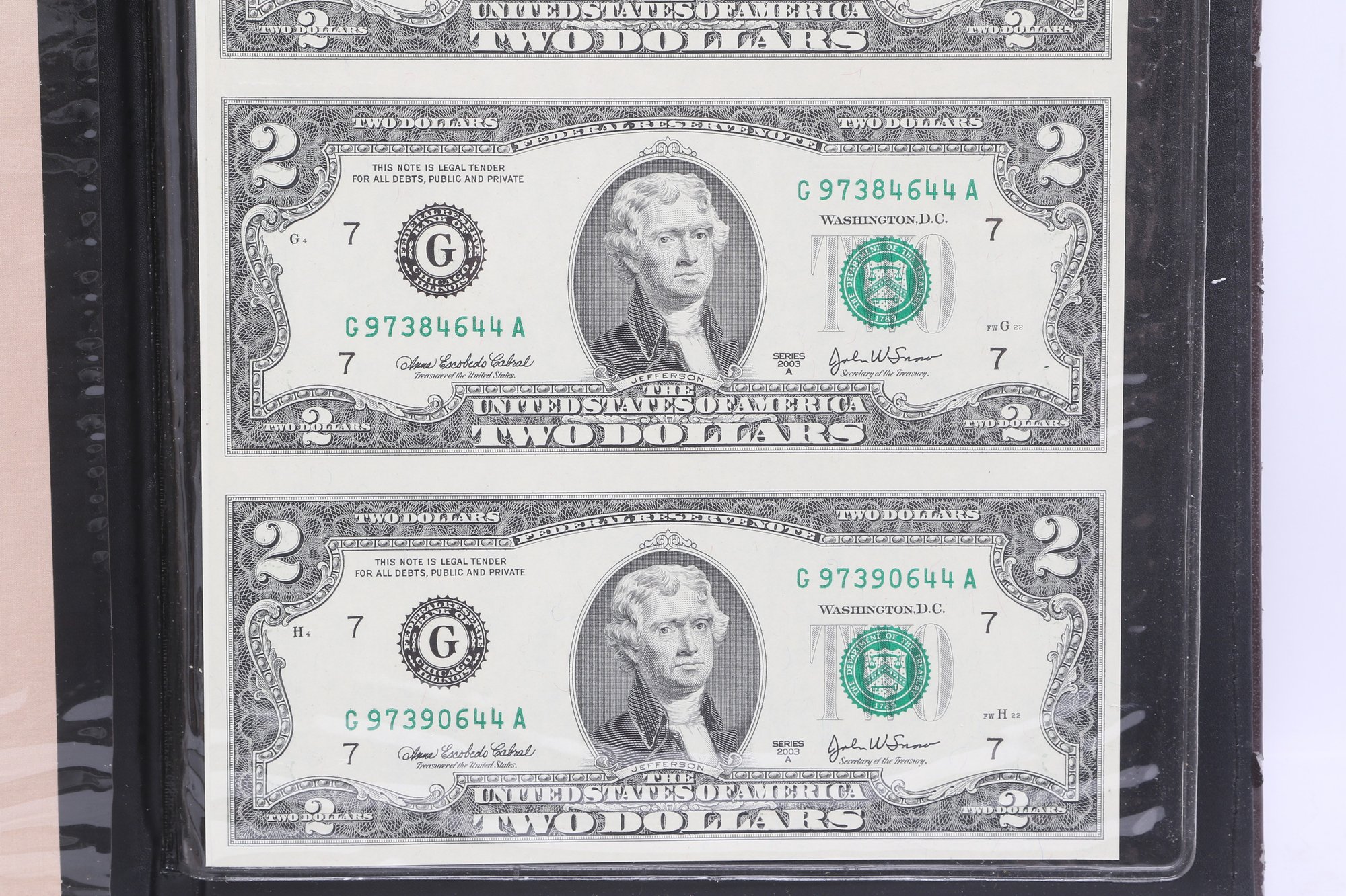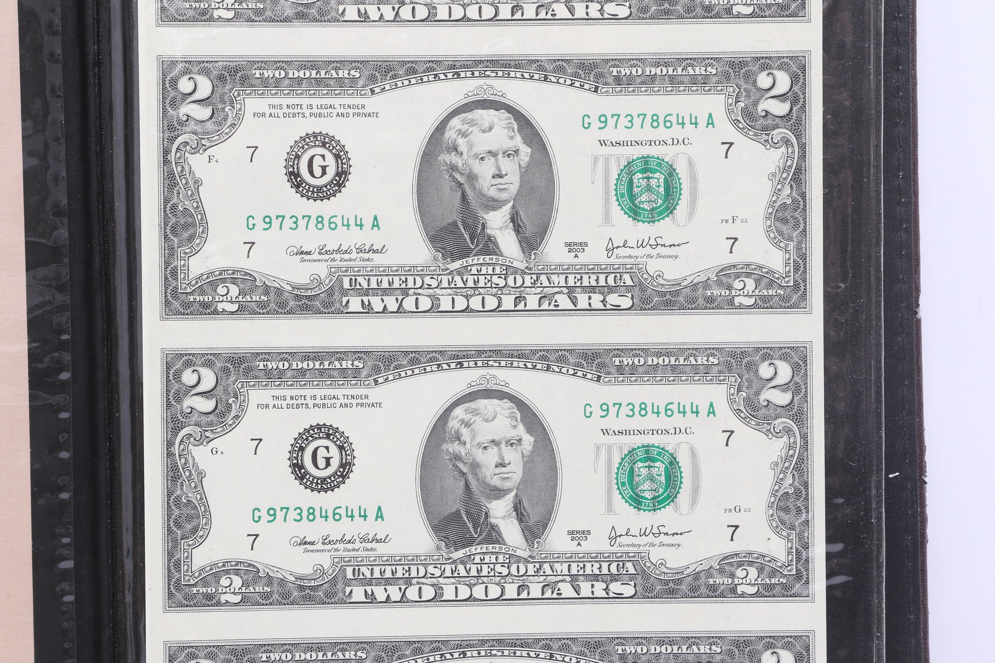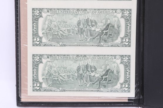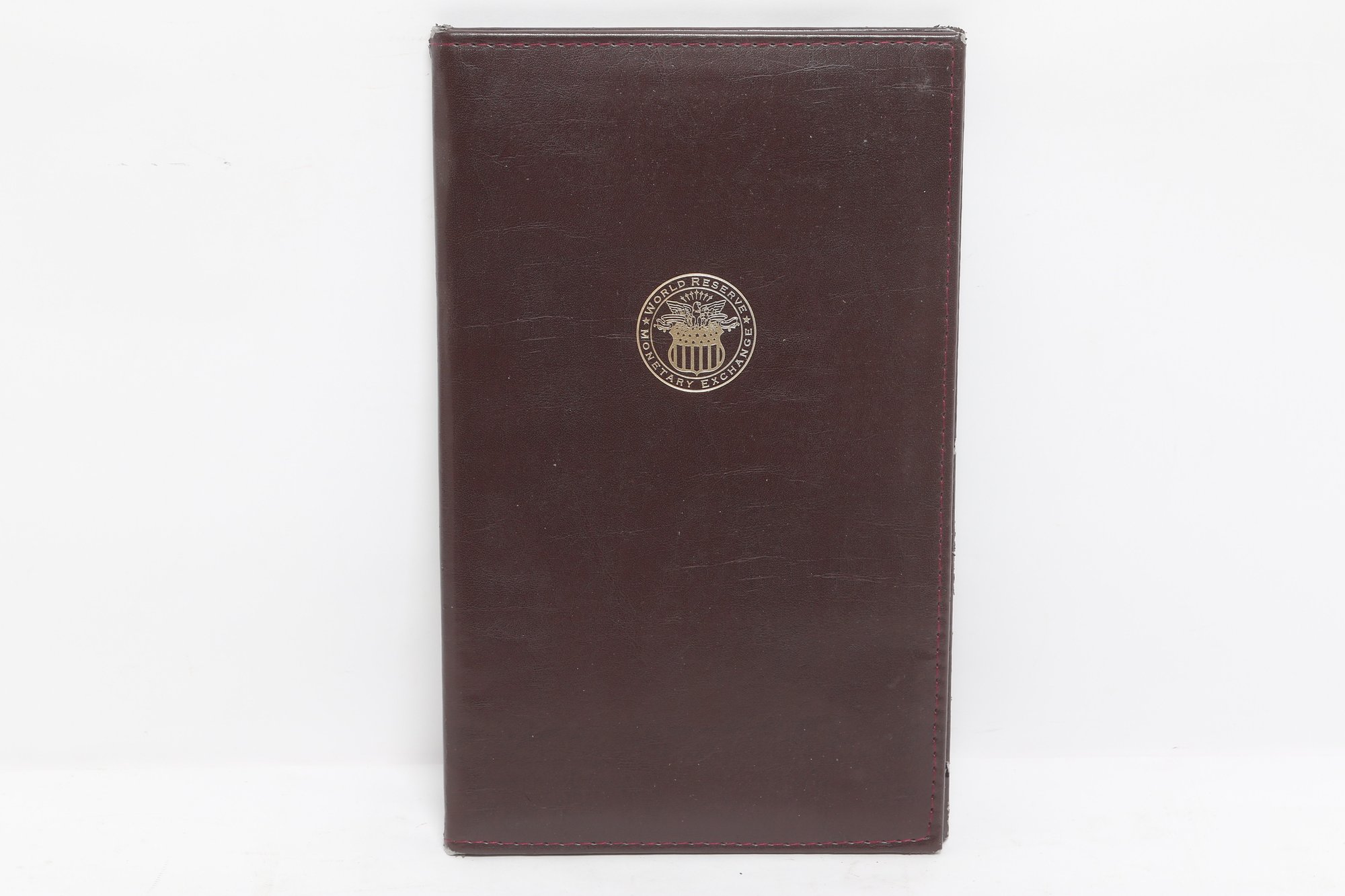 World Reserve Monetary Exchange folio featuring a collection of uncut $2 bills displayed alongside a portrait and “The Wisdom of Thomas Jefferson” insert. Housed in a brown leatherette binder with gold emblem on the cover. Bills appear crisp and well-presented; overall set in very good condition.