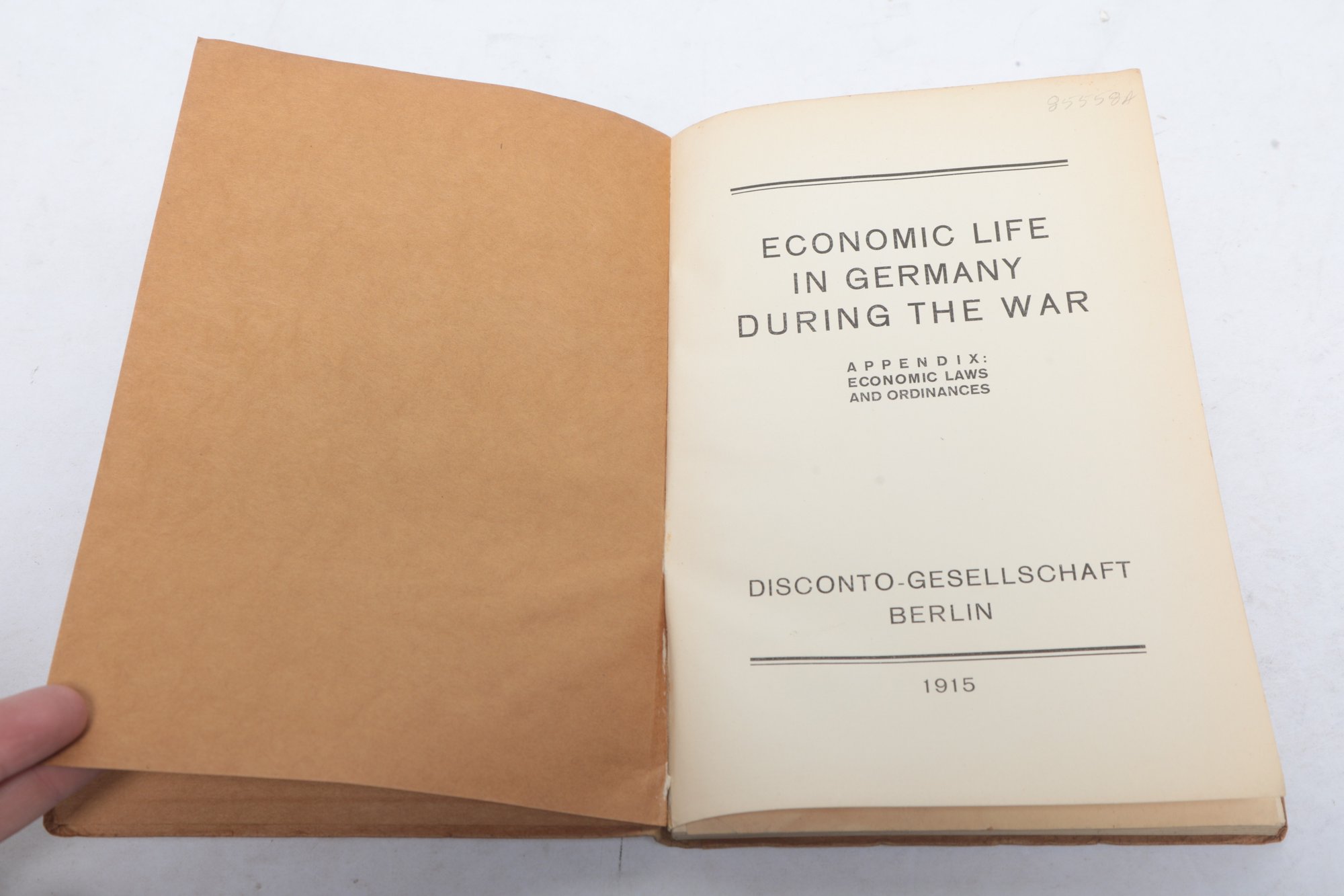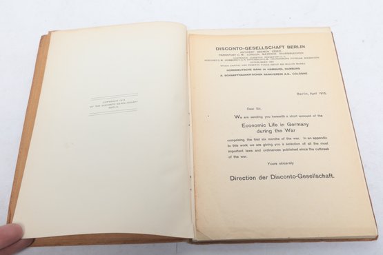 Berlin. Disconto-Gesellschaft. 1915. Hardcover in tan paper-covered boards, cloth spine. Includes an appendix of economic laws and ordinances; publisher's promotional material laid-inBinding shows minor edge wear and light toning.