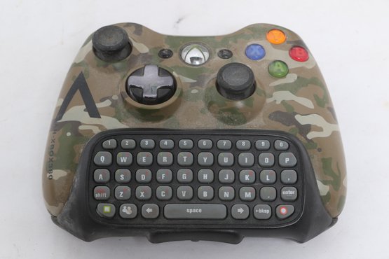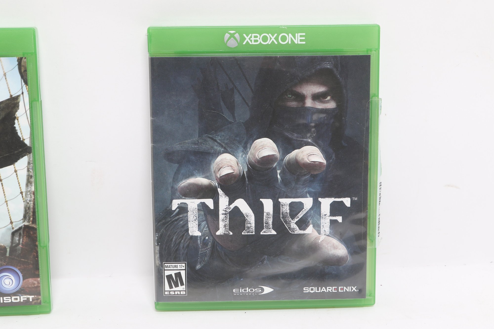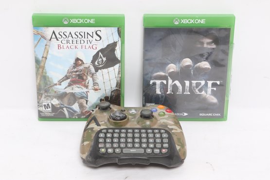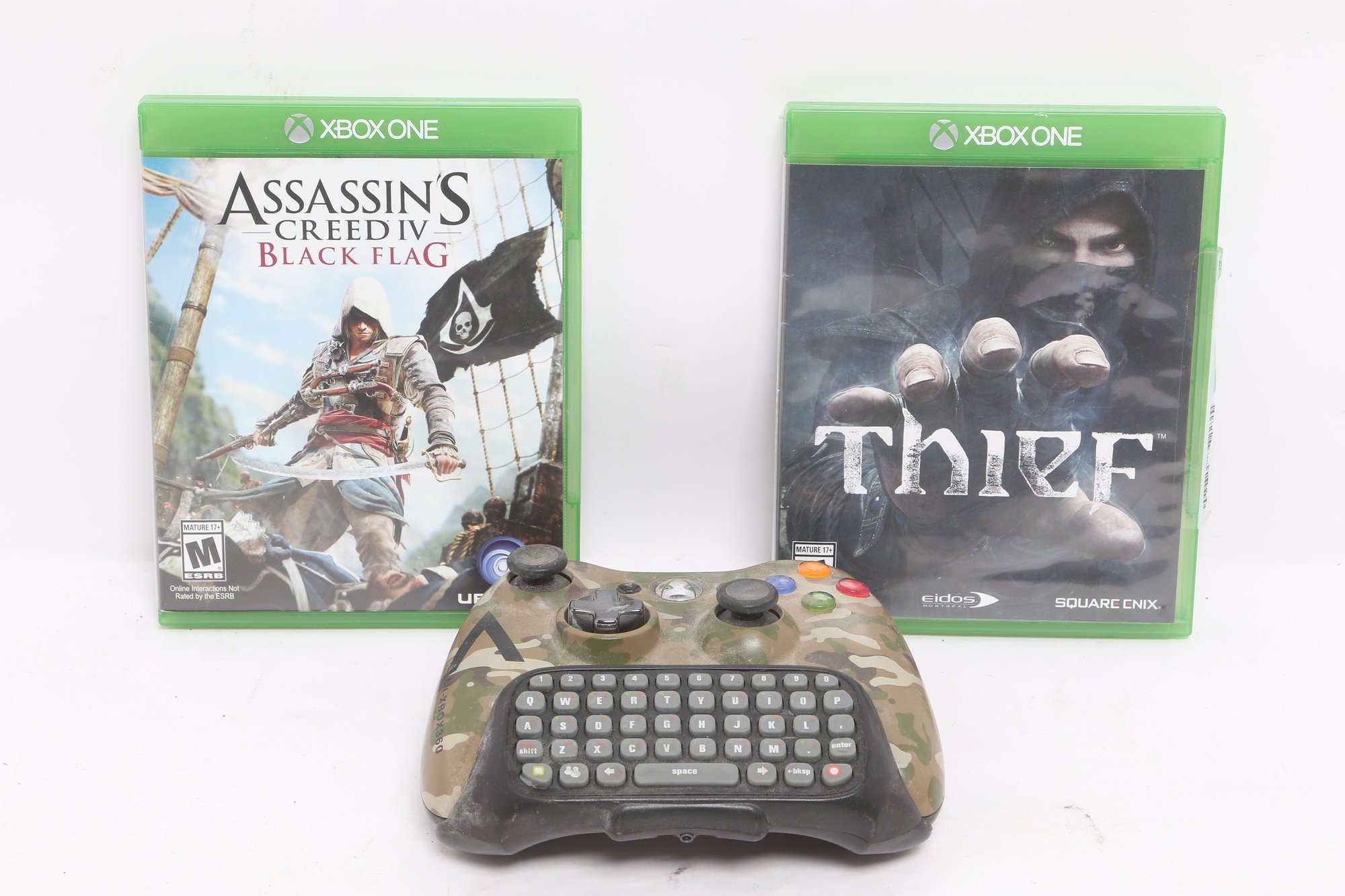Lot includes two Xbox One games, Assassin’s Creed IV Black Flag and Thief, along with a camouflage Xbox controller fitted with a chatpad keyboard attachment. Items show light use and are ideal for gaming or collection.