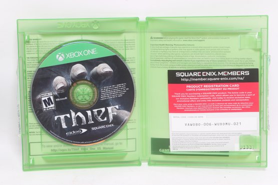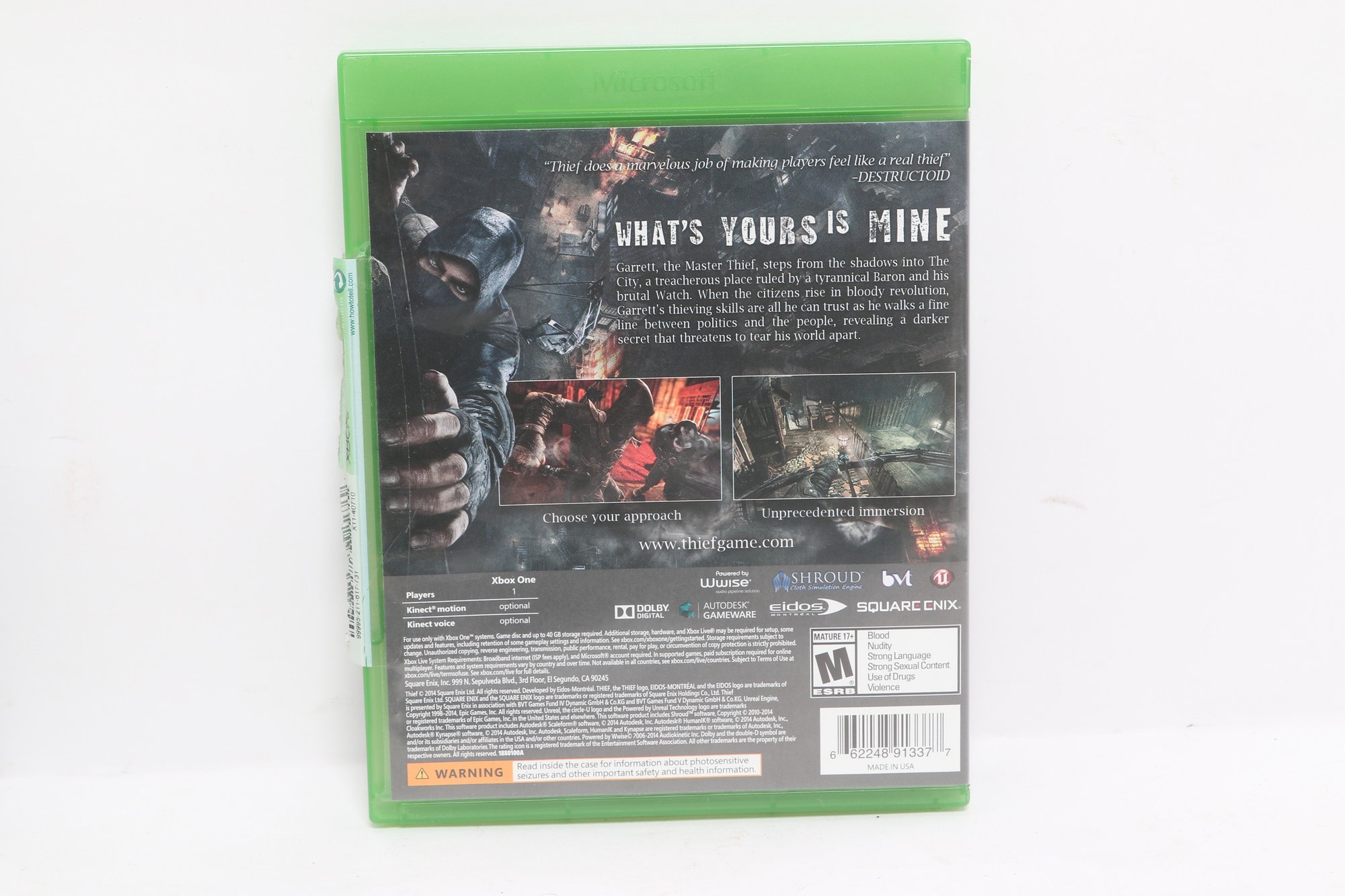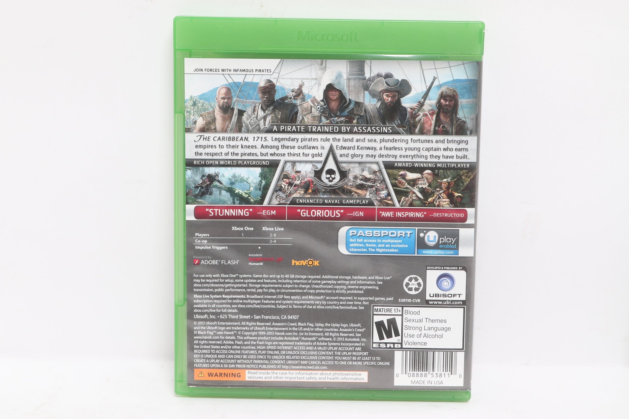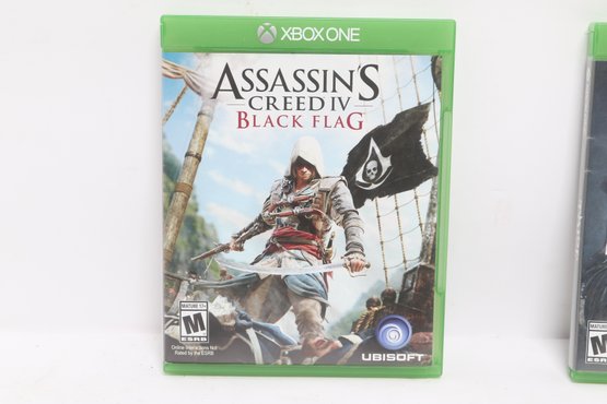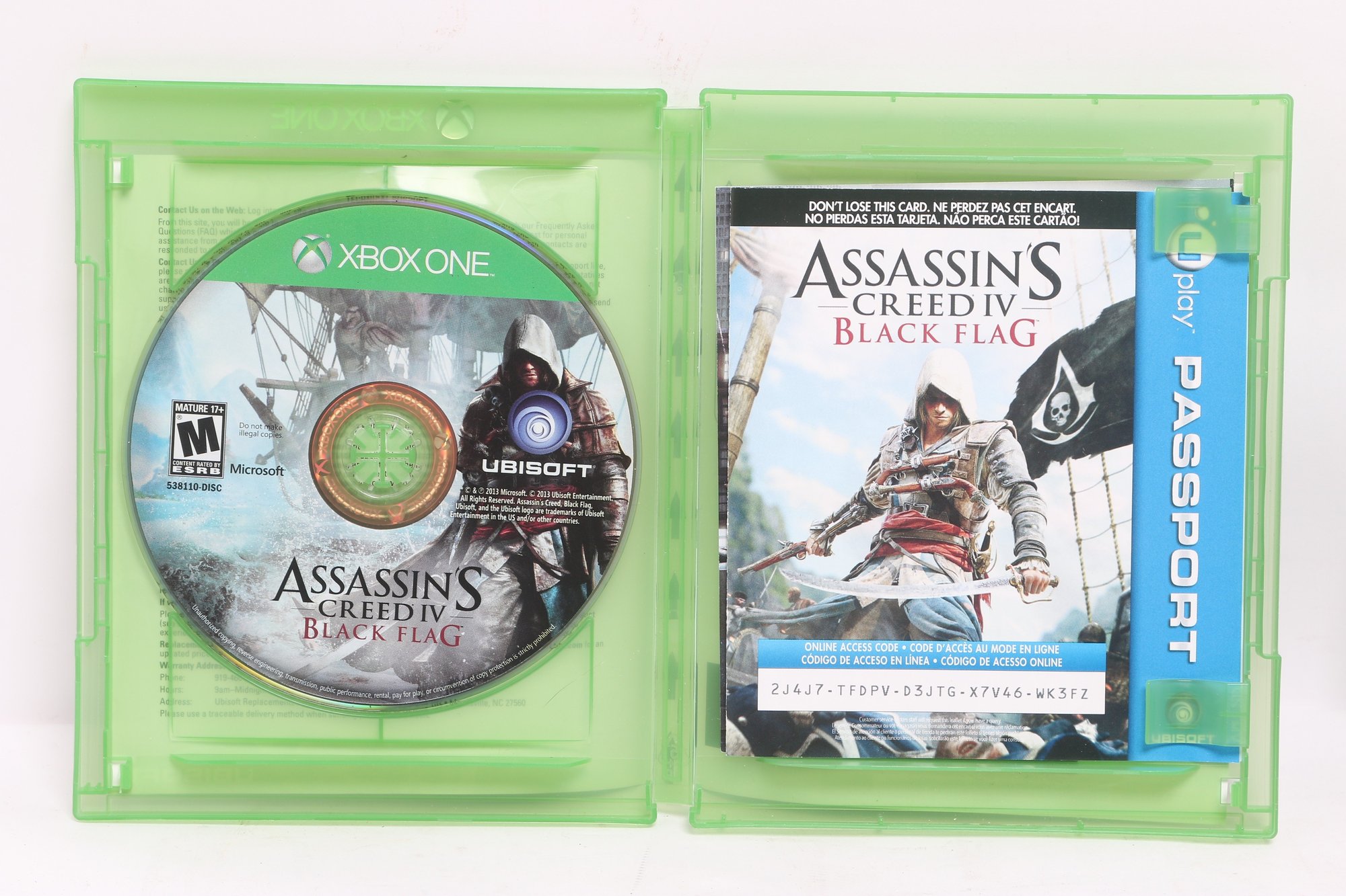 Lot includes two Xbox One games, Assassin’s Creed IV Black Flag and Thief, along with a camouflage Xbox controller fitted with a chatpad keyboard attachment. Items show light use and are ideal for gaming or collection.