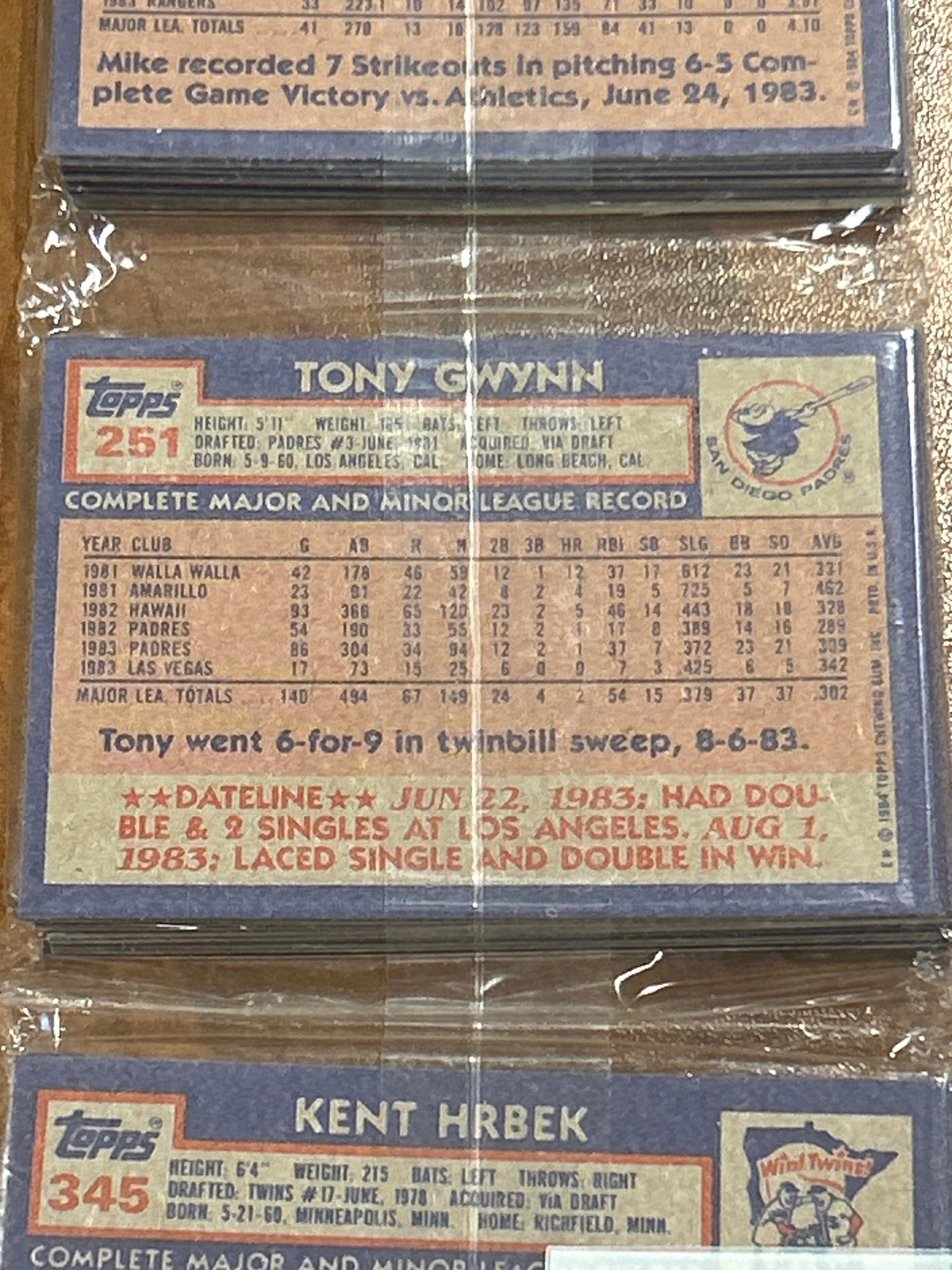 SUPER RARE!!Unopened 1984 Topps rack pack with HOF Wade Boggs showing on top AND HOF Tony Gwynn showing on bottom!! Great investment!