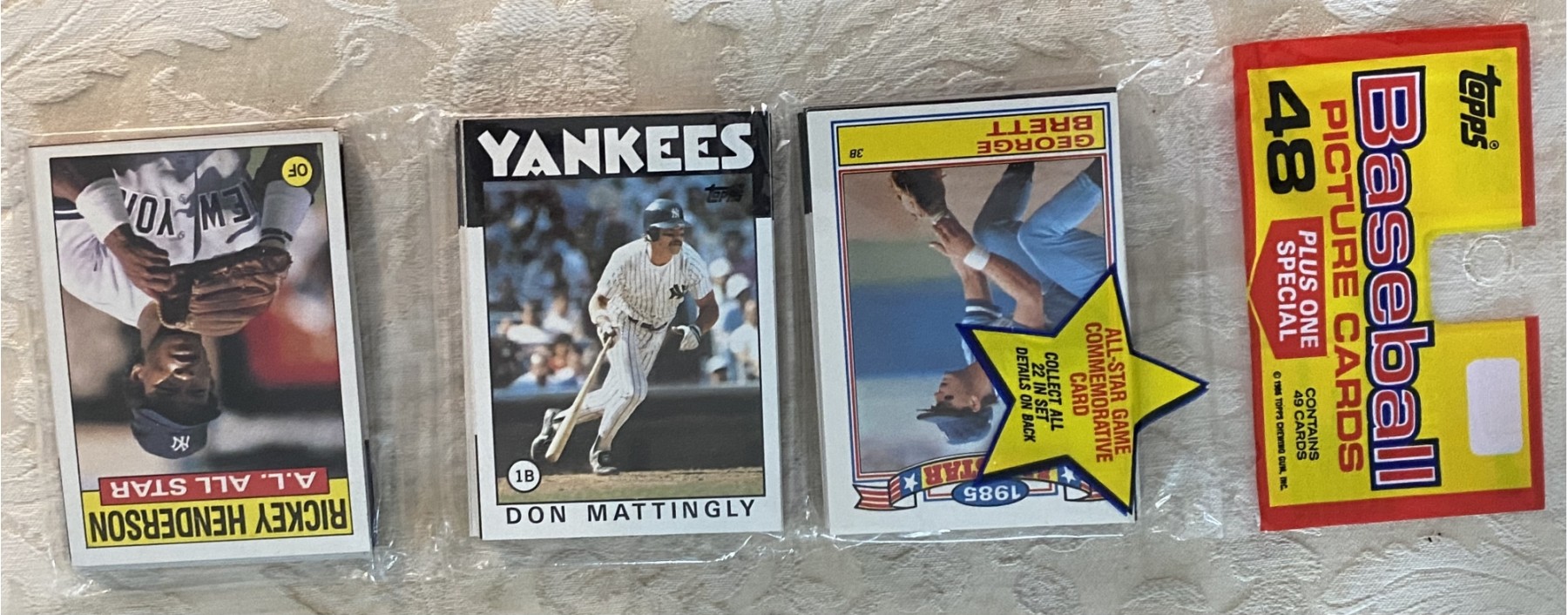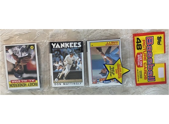 1986 Topps Baseball Rak Pak With Don Mattingly Showing. This pack also has a Rickey Henderson all star card on top and Eddie Murray on back. Wow!!