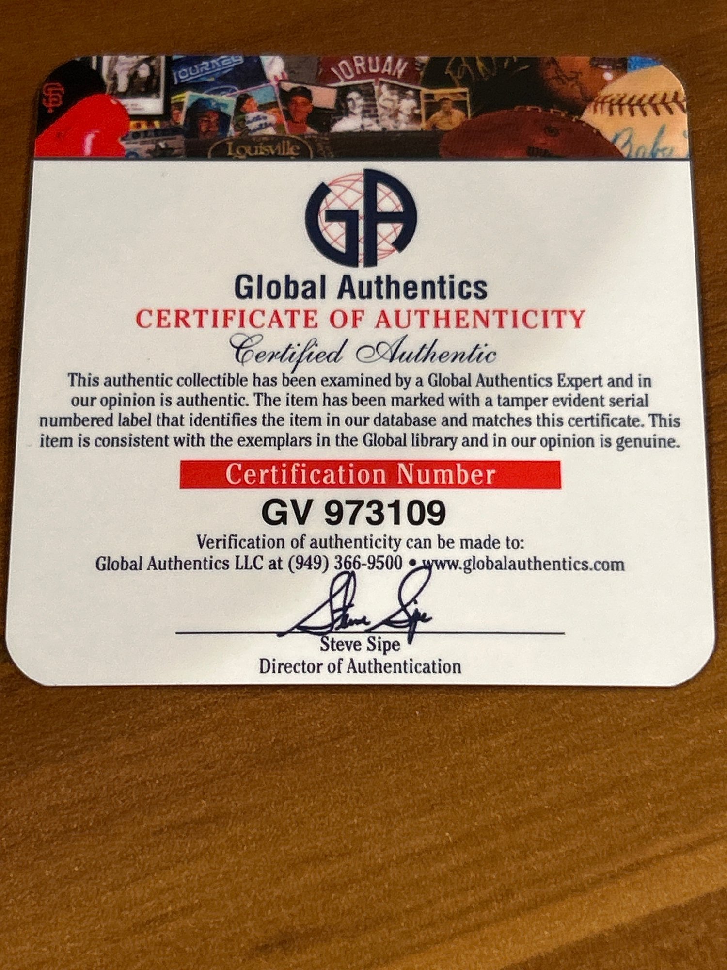 Signature has been certified, but What's In The Box does not recognize Global Authentics as a reputable authentication company. For that reason, we cannot guarantee authentic signature.