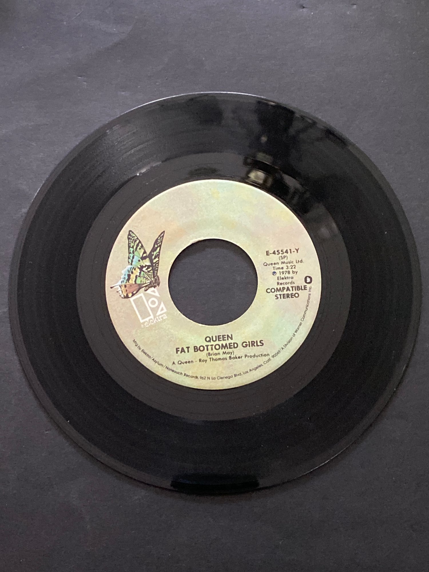 Queen Fat Bottomed Girls 45 Record. Cancelled Song. The 45 has not been tested, but appears in good condition.