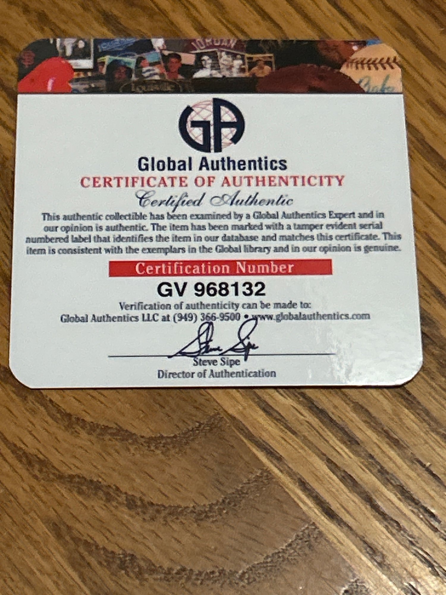 Signature has been certified, but What's In The Box does not recognize Global Authentics as a reputable authentication company. For that reason, we cannot guarantee authentic signature