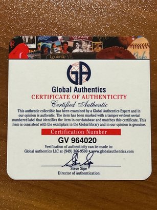 Signature has been certified, but What's In The Box does not recognize Global Authentics as a reputable authentication company. For that reason, we cannot guarantee authentic signature.