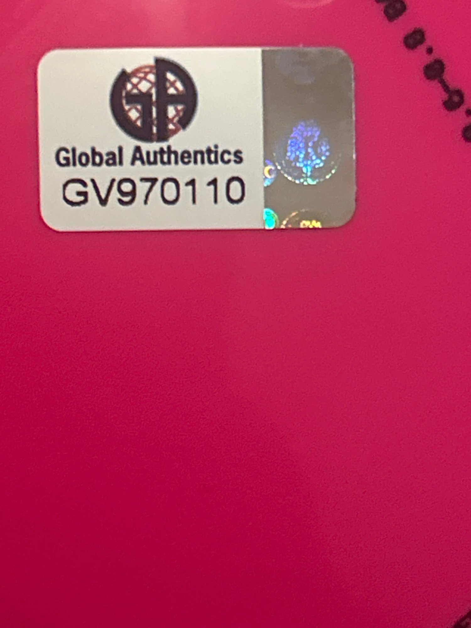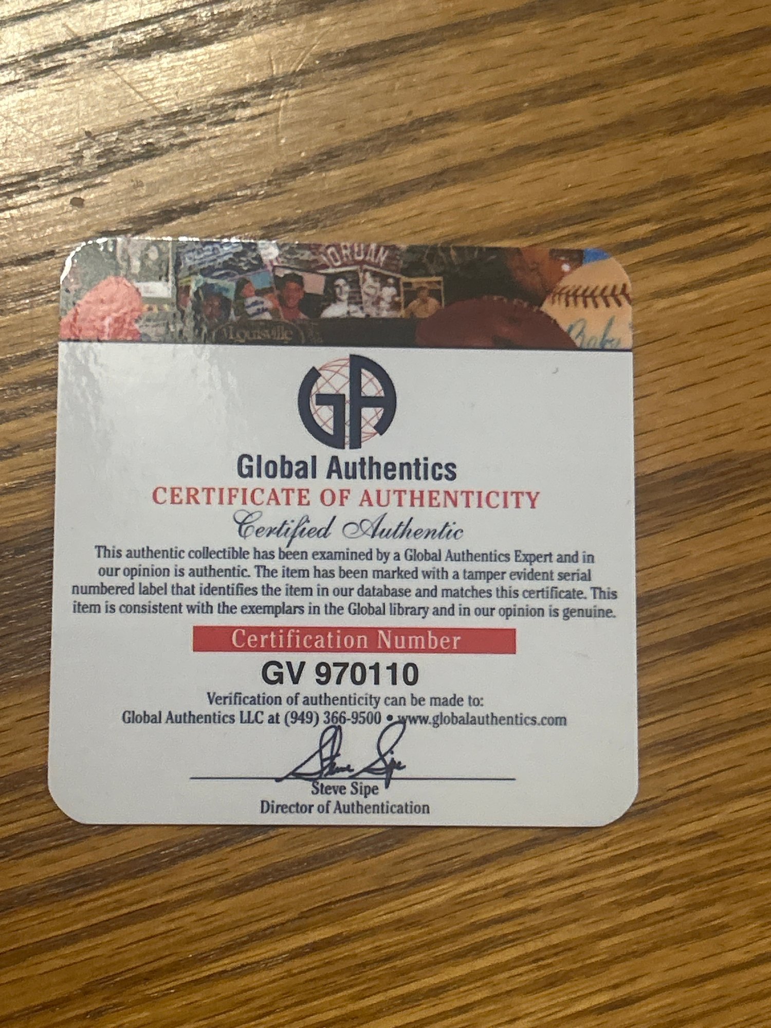 Signature has been certified, but What's In The Box does not recognize Global Authentics as a reputable authentication company. For that reason, we cannot guarantee authentic signature.