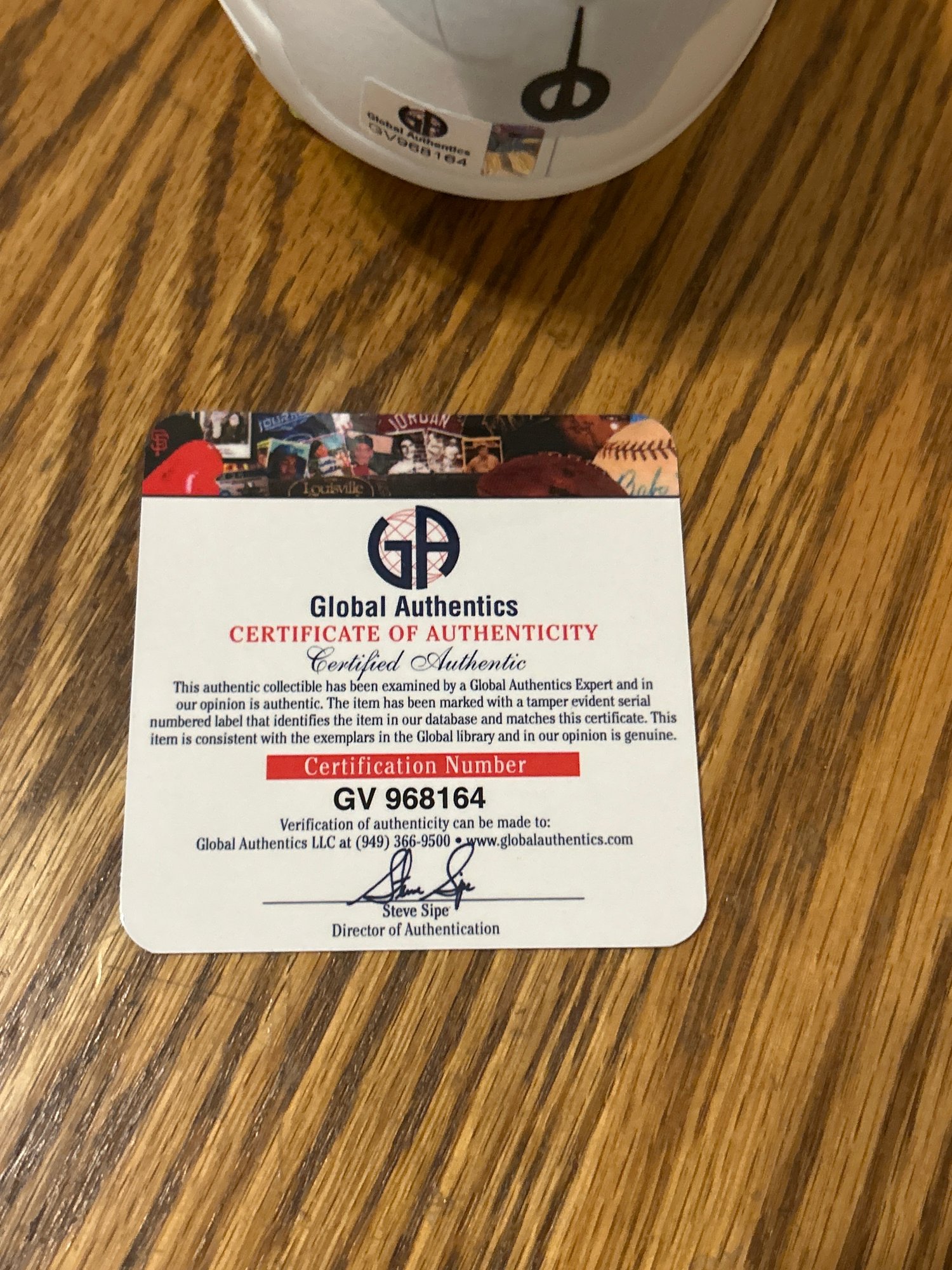Signature has been certified, but What's In The Box does not recognize Global Authentics as a reputable authentication company. For that reason, we cannot guarantee authentic signature.