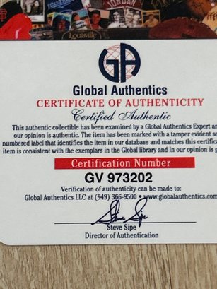 Signature has been certified, but What's In The Box does not recognize Global Authentics as a reputable authentication company. For that reason, we cannot guarantee authentic signature.
