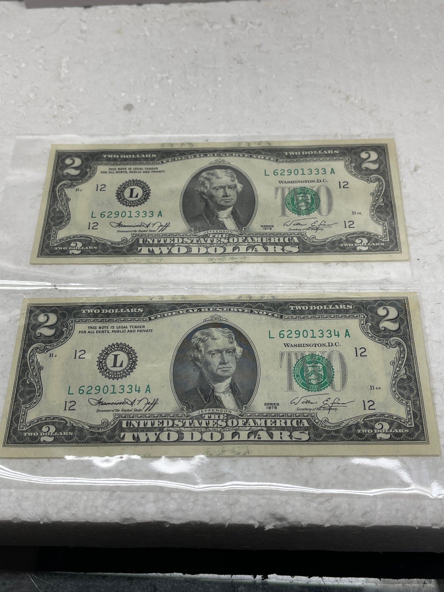 Sequential US Two Dollar Bills 1976 SET OF 2 - $2 U.S. Currency Crisp Clean Notes