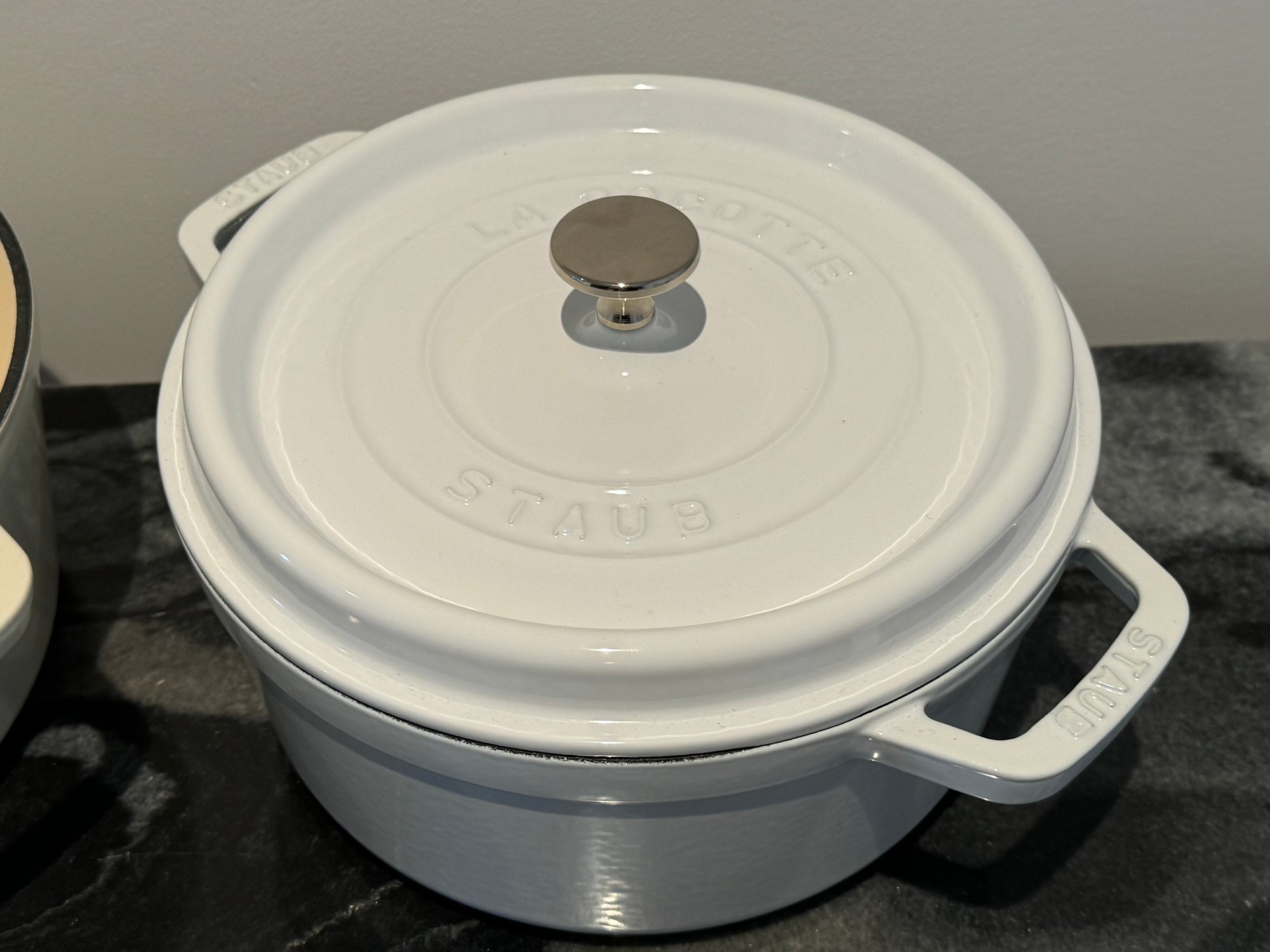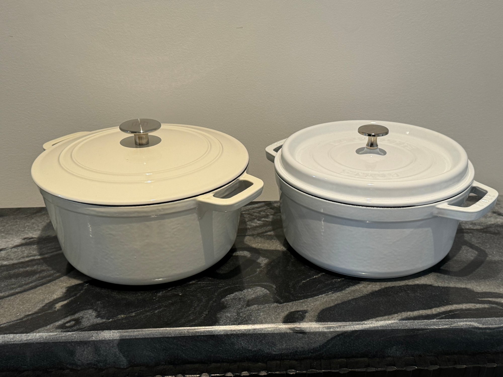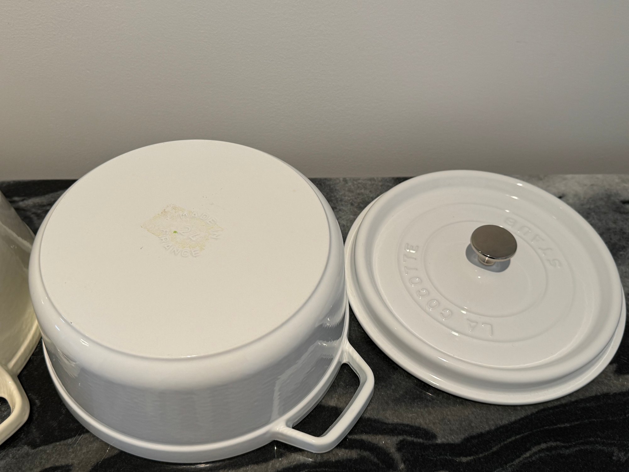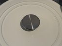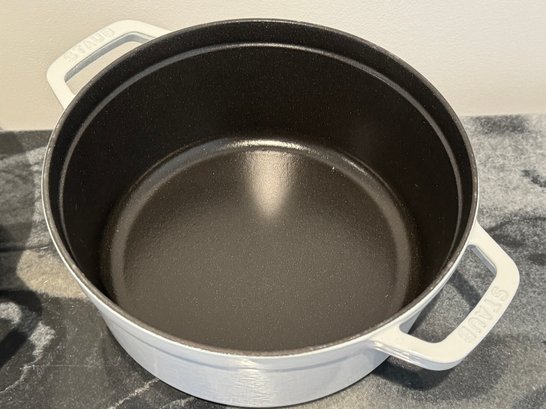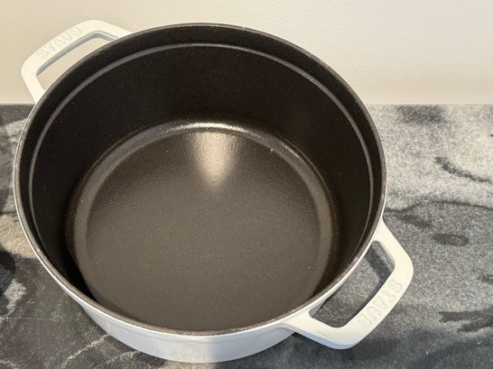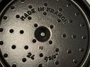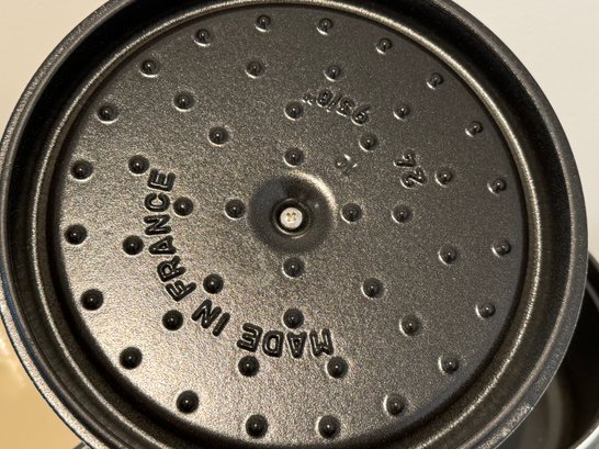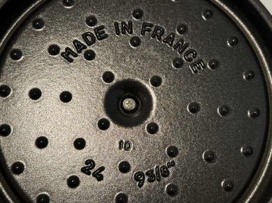 The Staub piece measures 9.5”D x 4.25”H.
