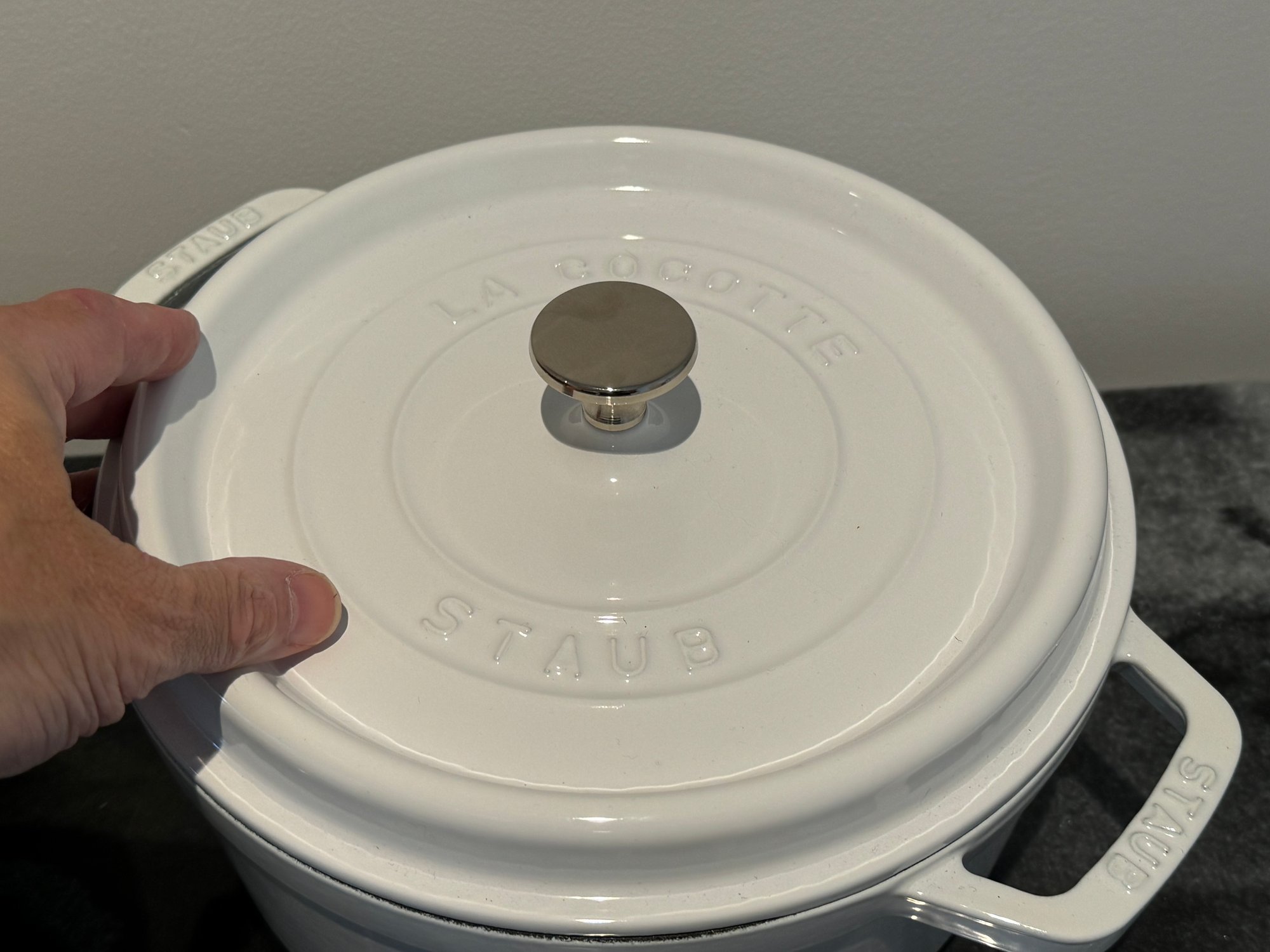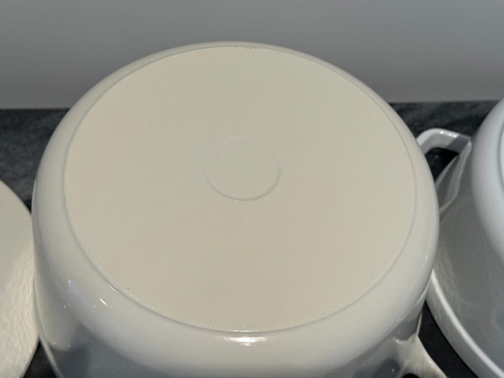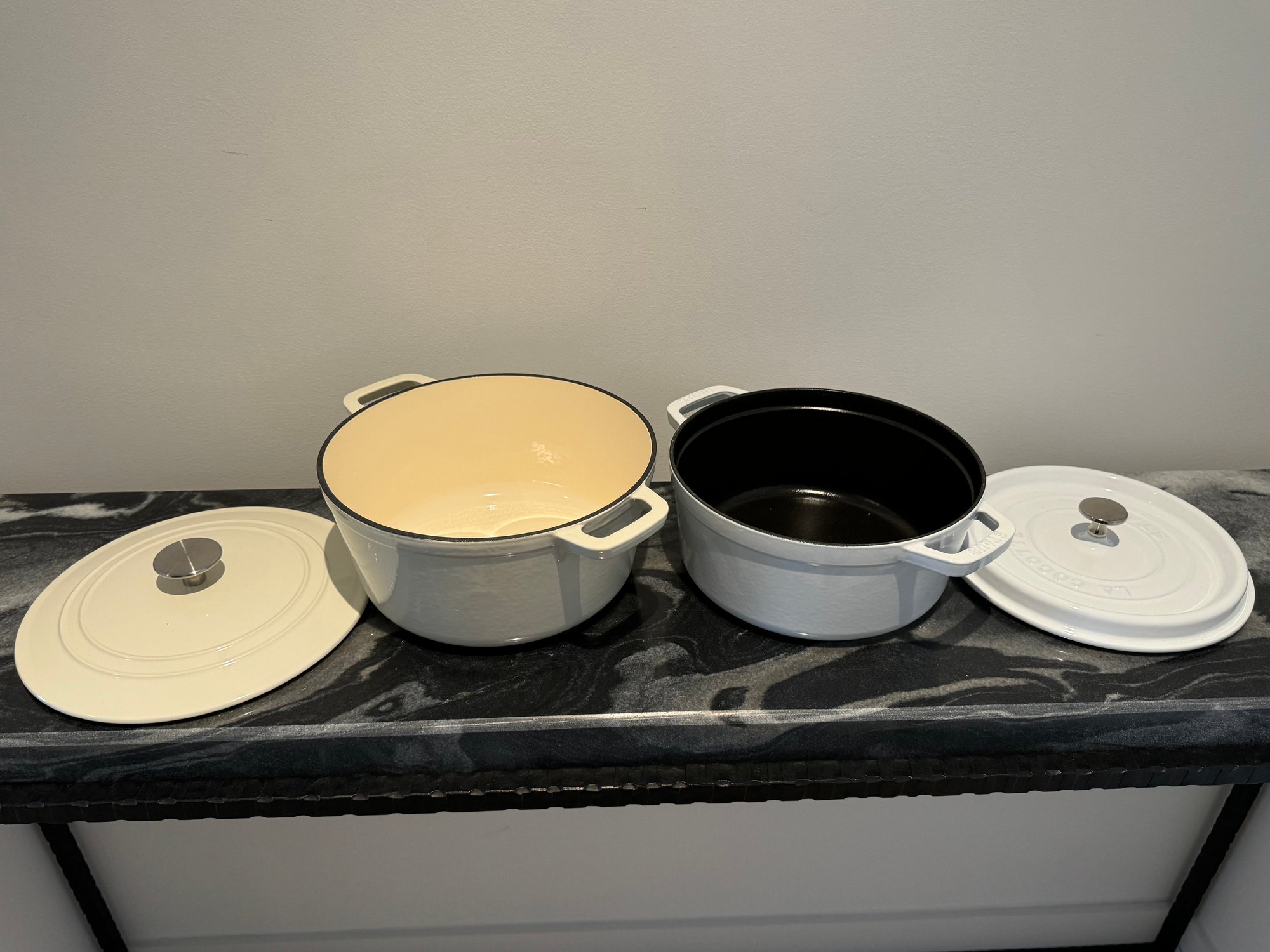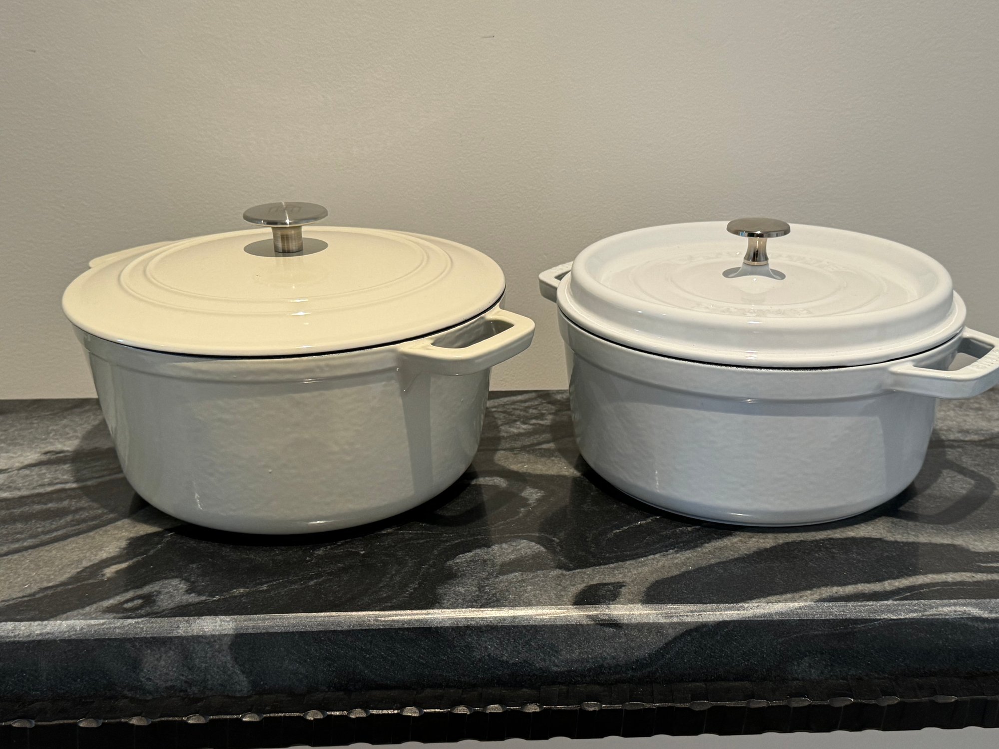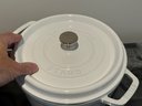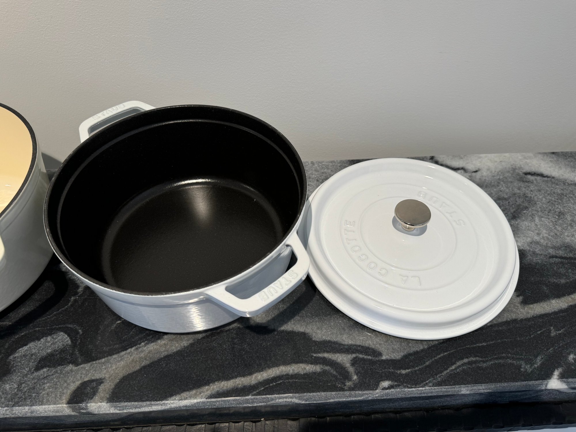 The Staub piece measures 9.5”D x 4.25”H.