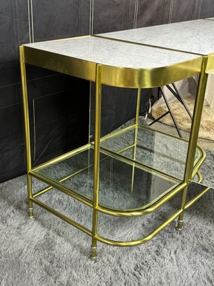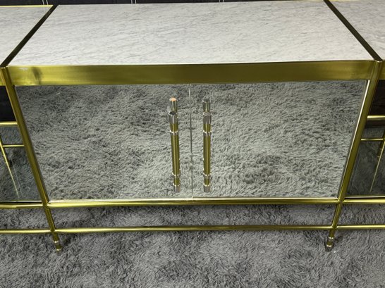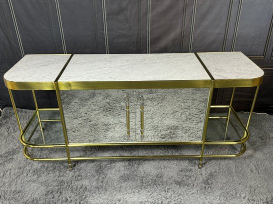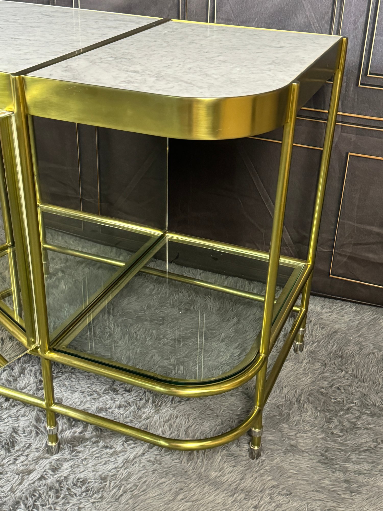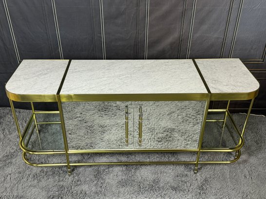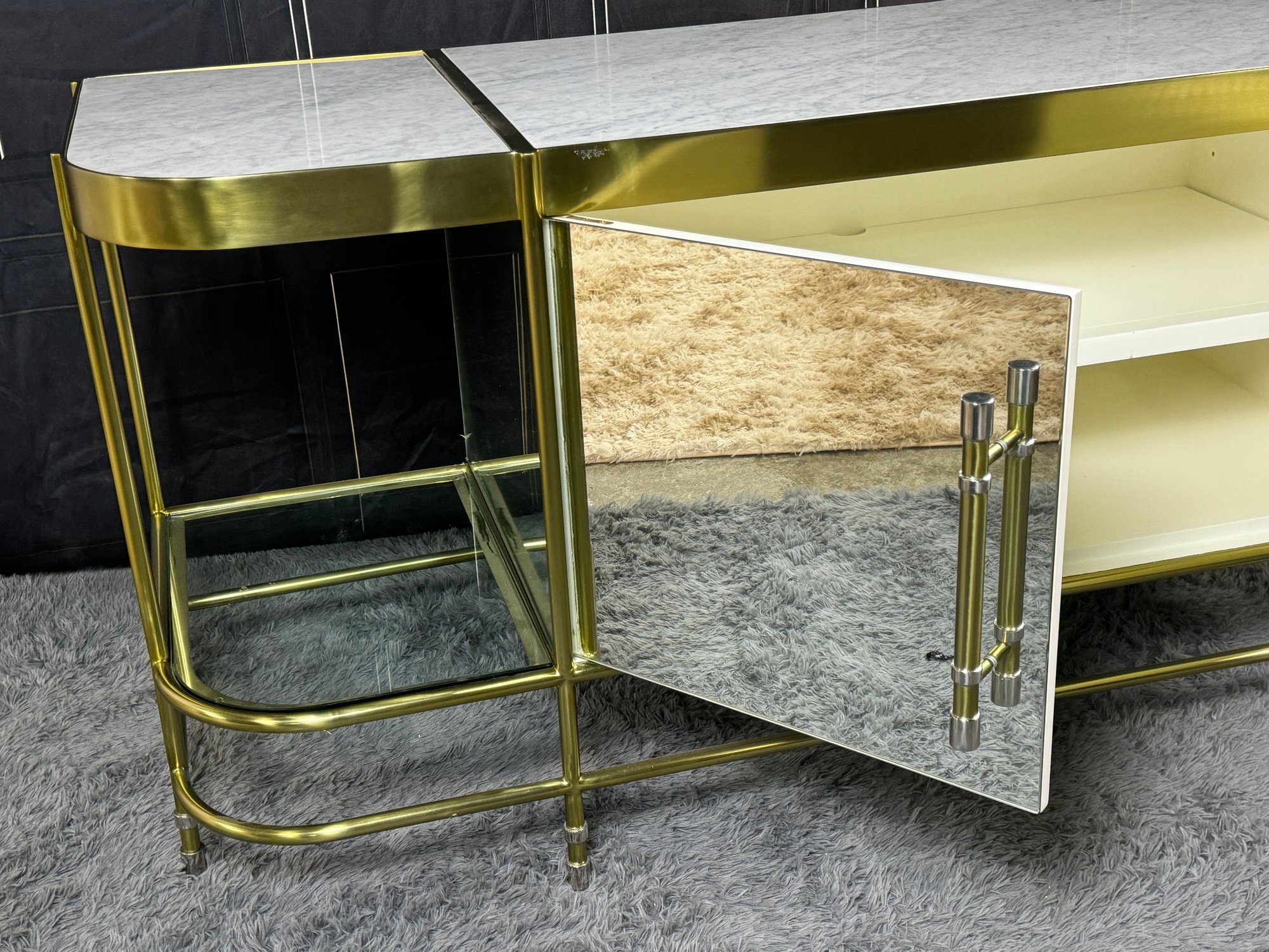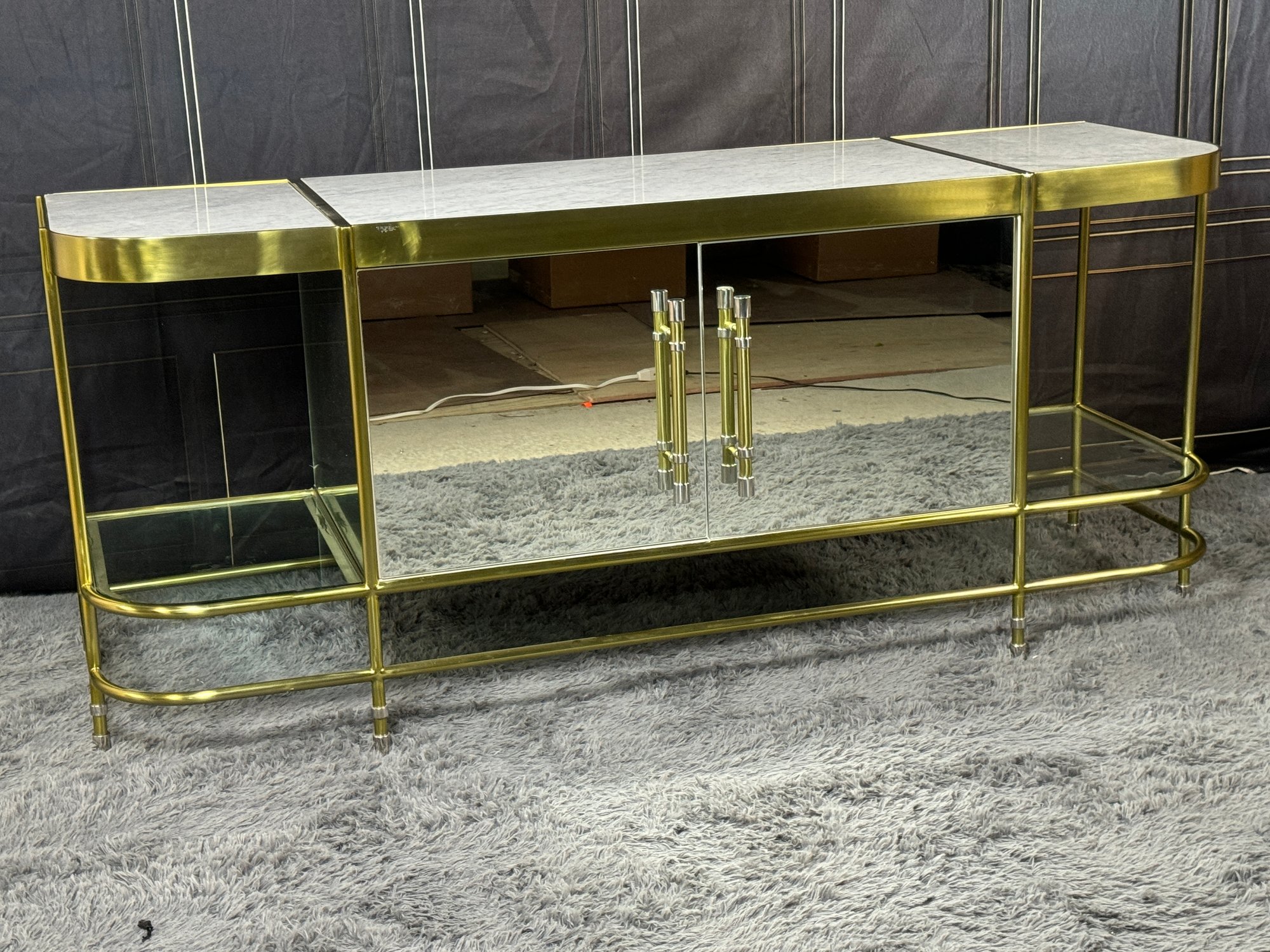 Tracey Boyd conceptualizes her furniture designs in the same way she spends her days - by gathering ideas, experiences and one-of-a-kind items from her extensive travels. Whether inspired by a single drawer pull salvaged near her hometown in England, or an ancient mural from across the world, each piece is a superb amalgam of craftsmanship and unexpected details from her imagination. She finished this polished, curvilinear shape with elegant accents of natural white marble and mirrored glass.