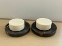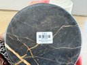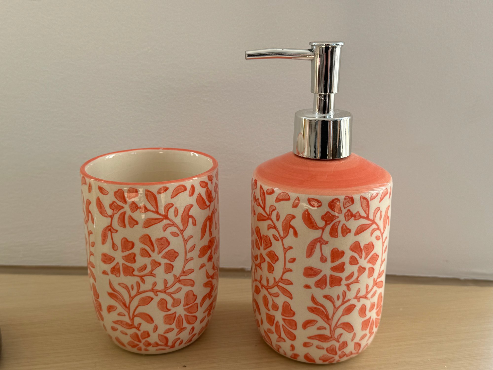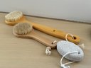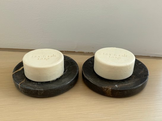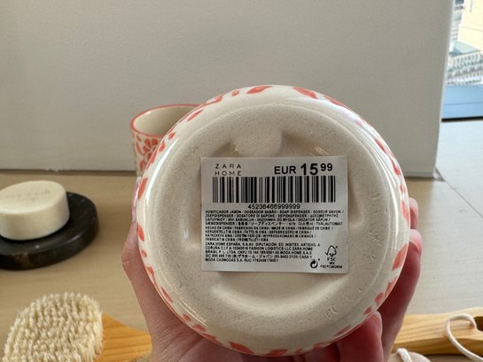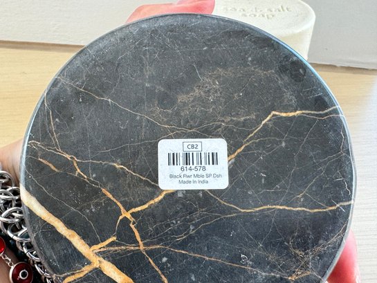 This collection includes two matching black floral marble CB2 soap dishes measuring 4.5” diameter, a pair of bath brushes and pumice stone, a pair of Zara Home heart & floral peach color toothbrush holder and liquid soap dispenser measuring 3.5”d by 6” and 8” tall respectively, and a large glass bottle Lollia bubble bath