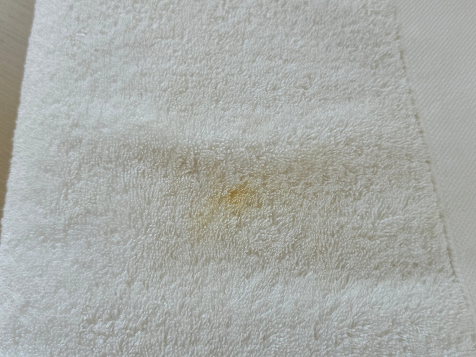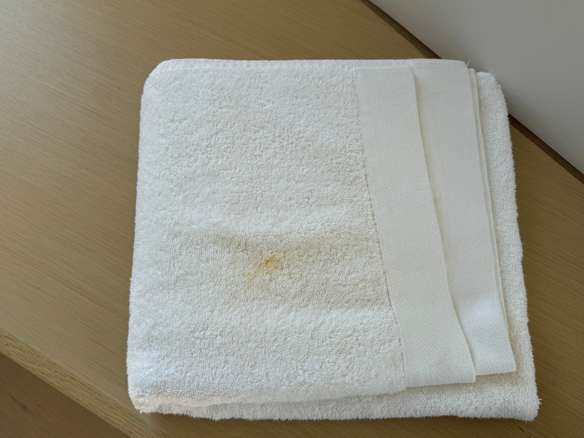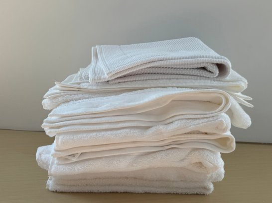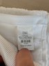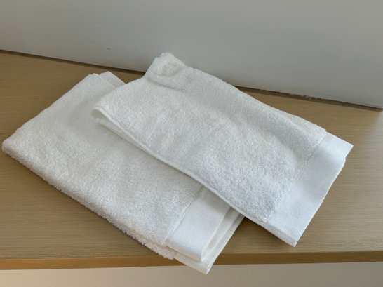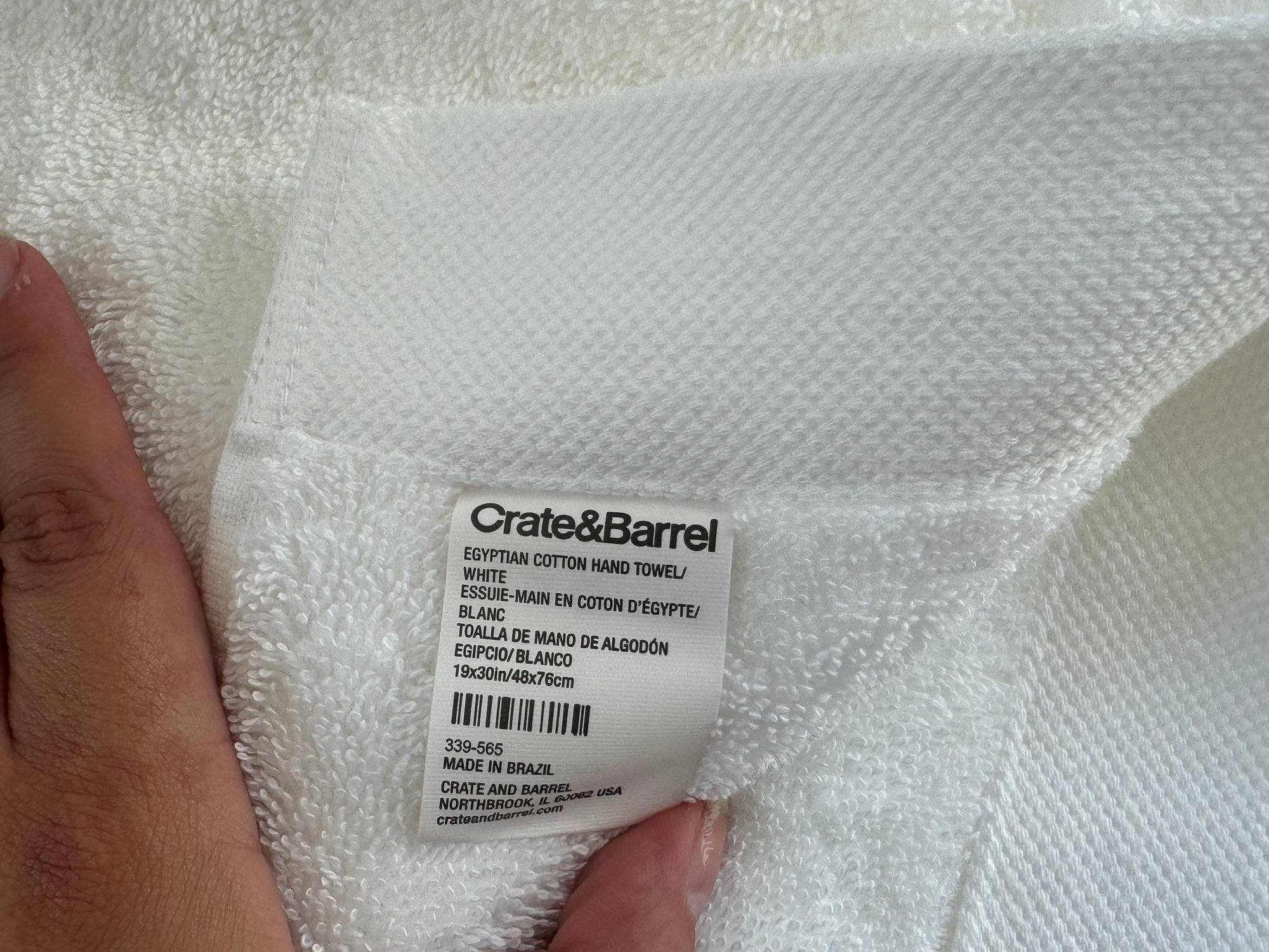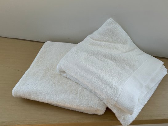 The two Crate & Barrel bath towels are 27” x 55”. There is some discoloration on one towel which is photo-documented, but it is likely able to be cleaned.