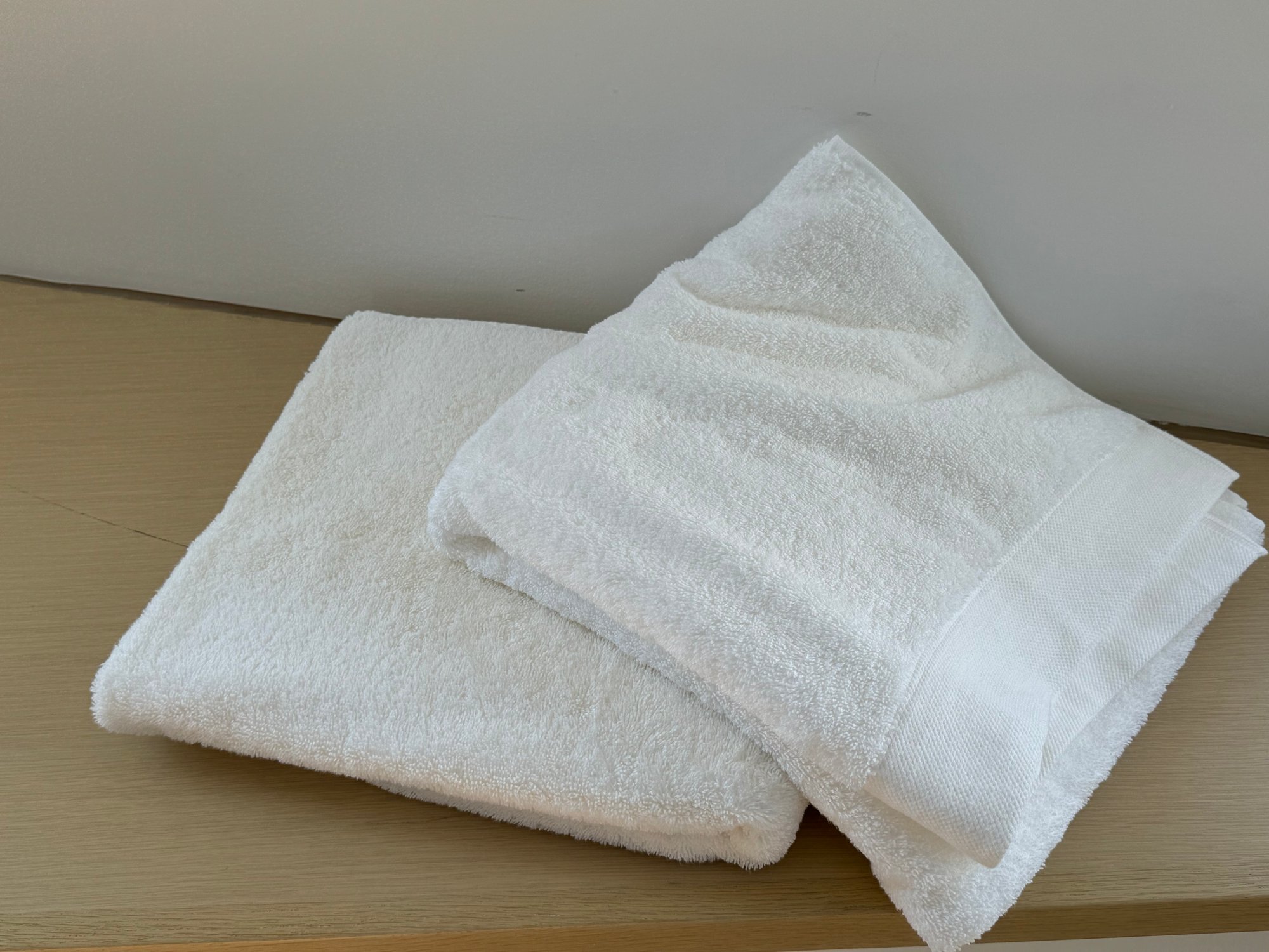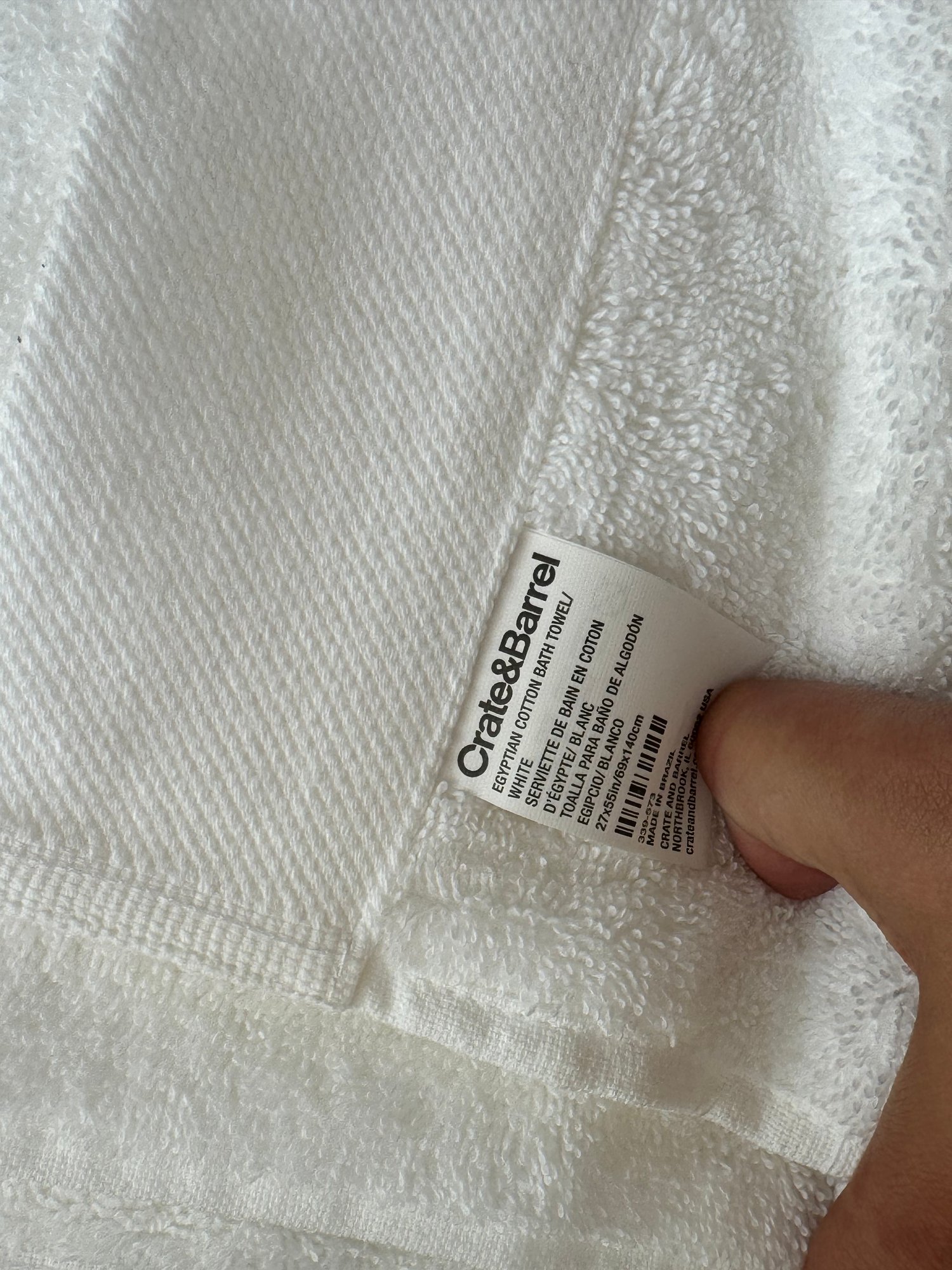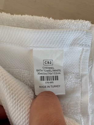 The two ribbed cotton CB2 Channel bath towels are 30” x 60”