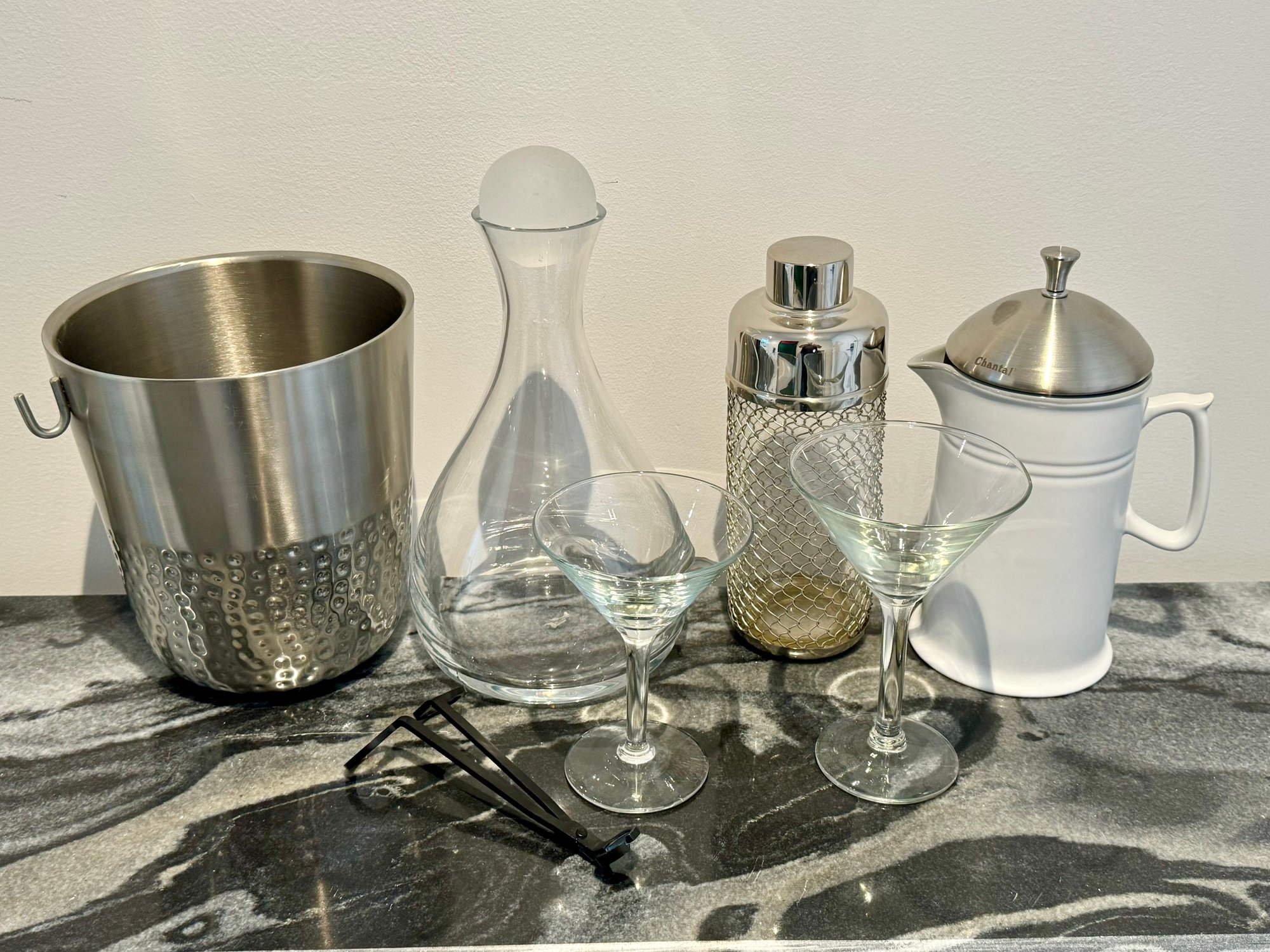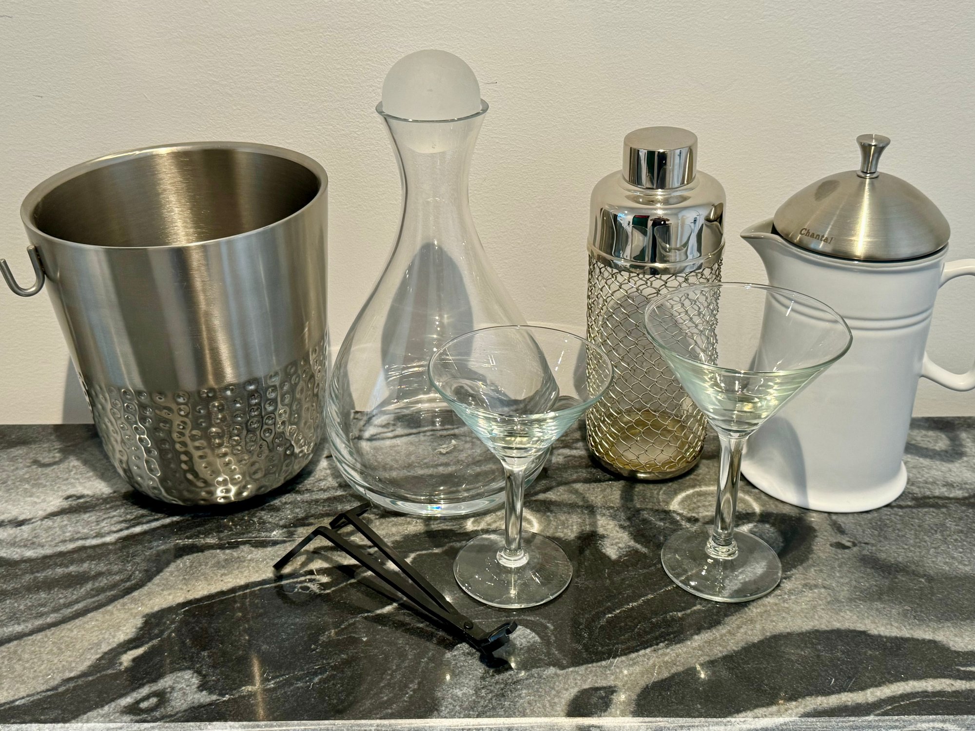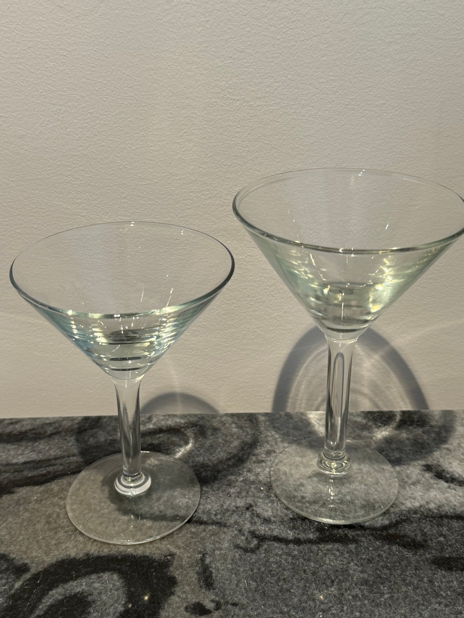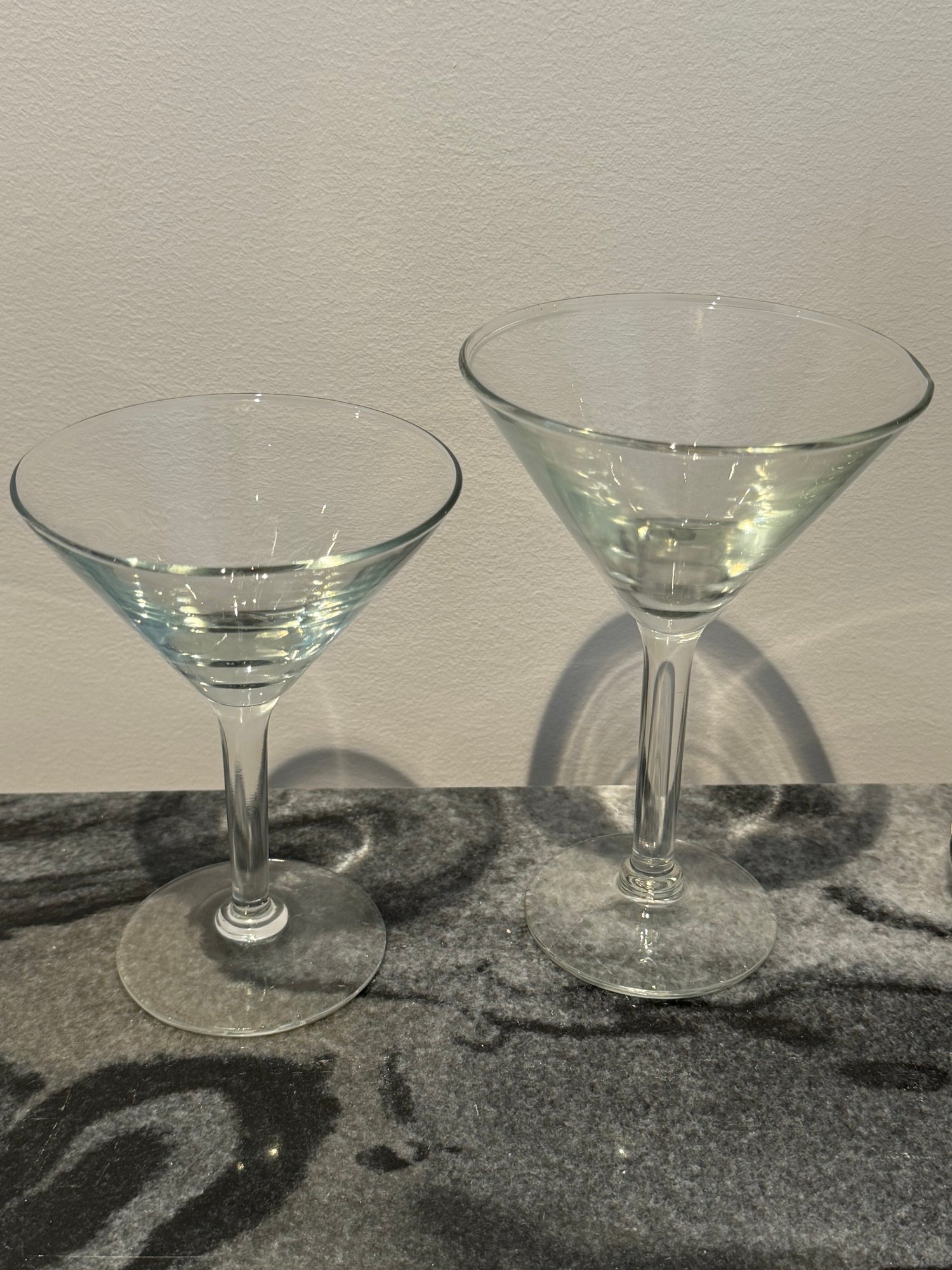 - Pair of martini glasses that are 6” & 7” tall respectively.