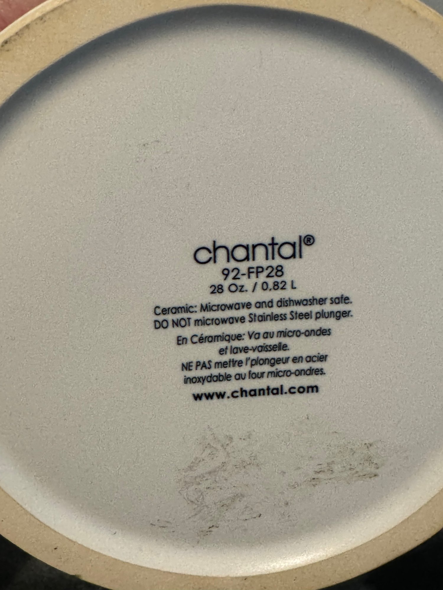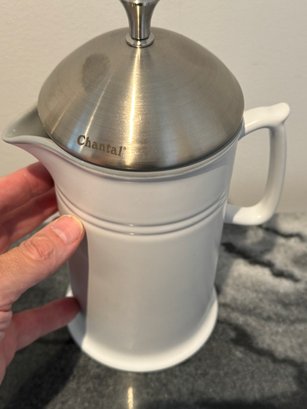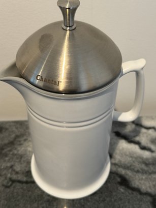 - Chantal ceramic & metal french press that is 10” tall with a 4.5” diameter