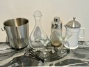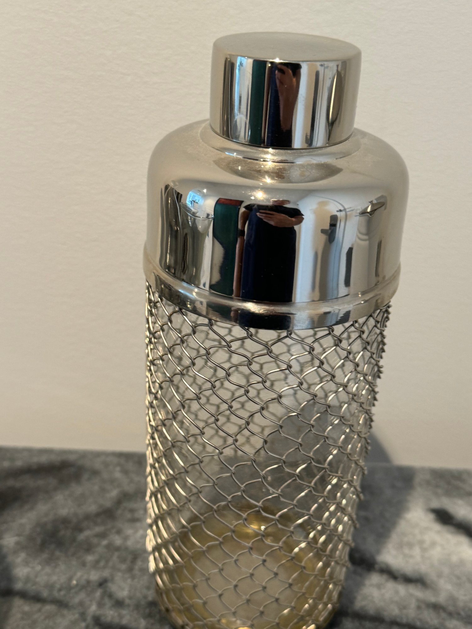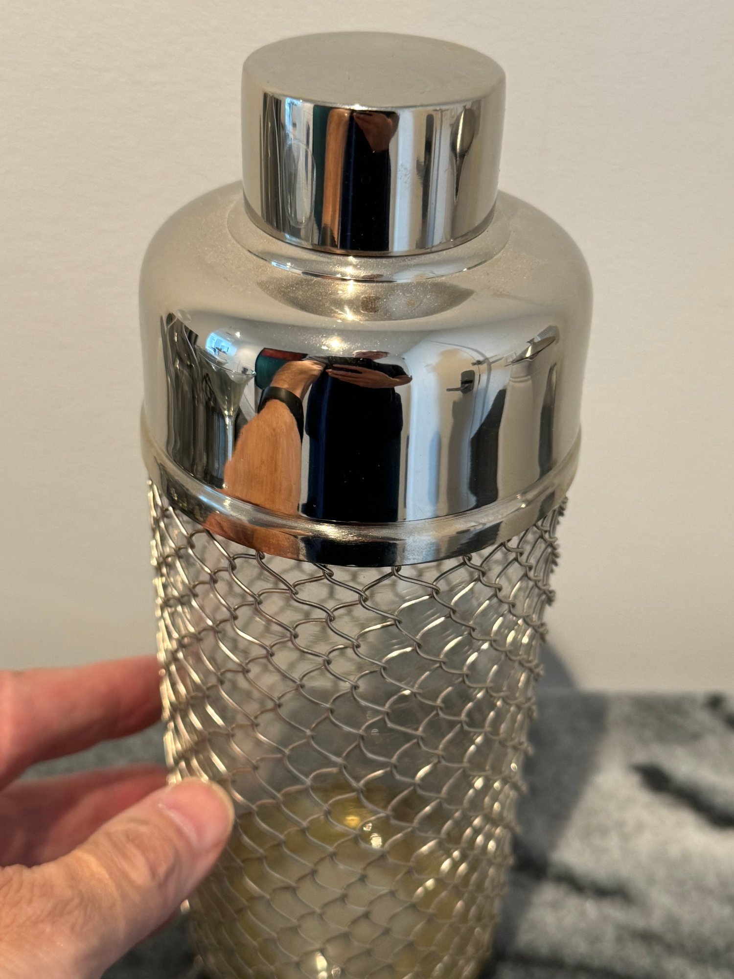 - Glass & metal cocktail shaker that is 9.5” tall with a 3.5” diameter