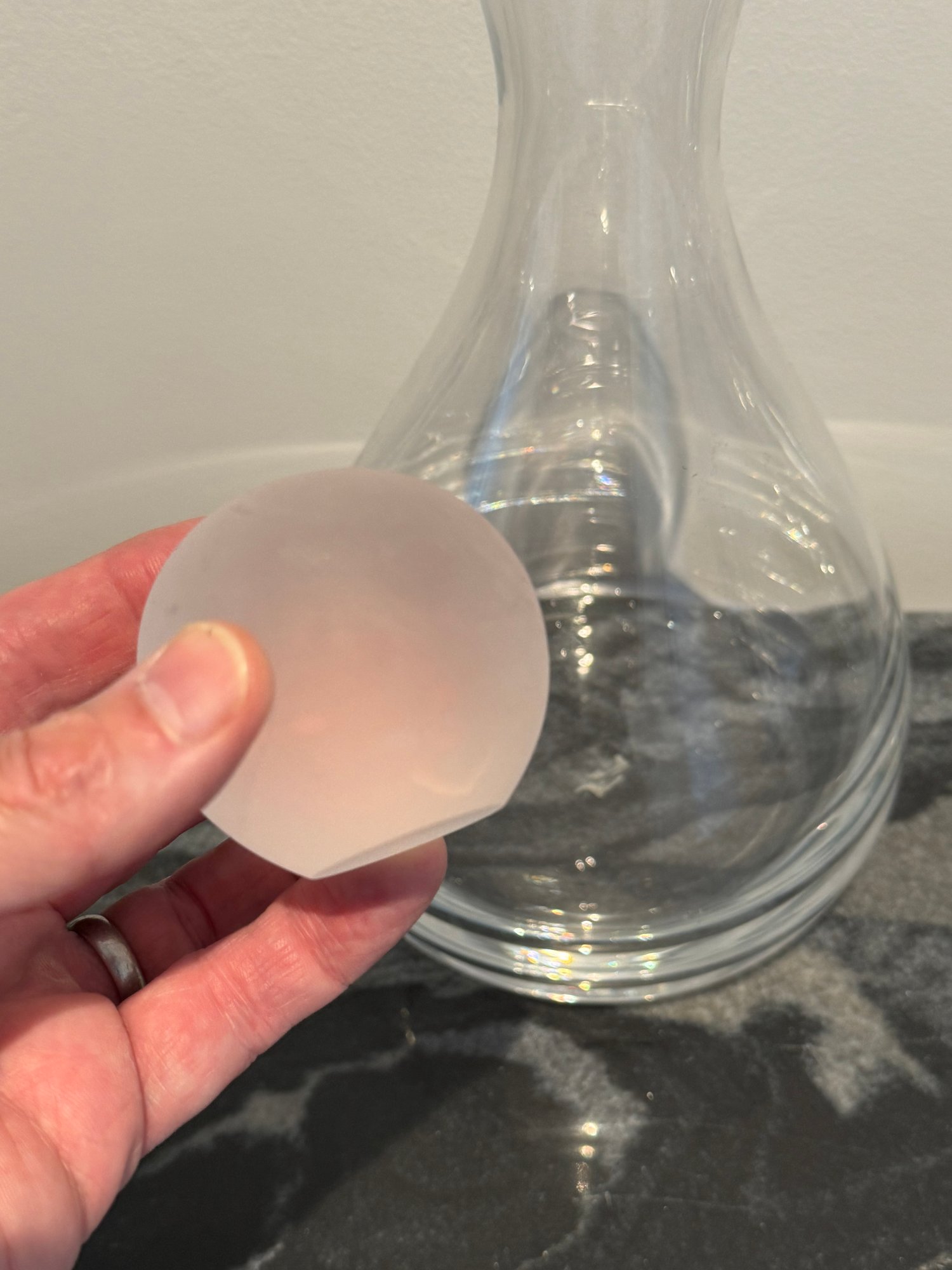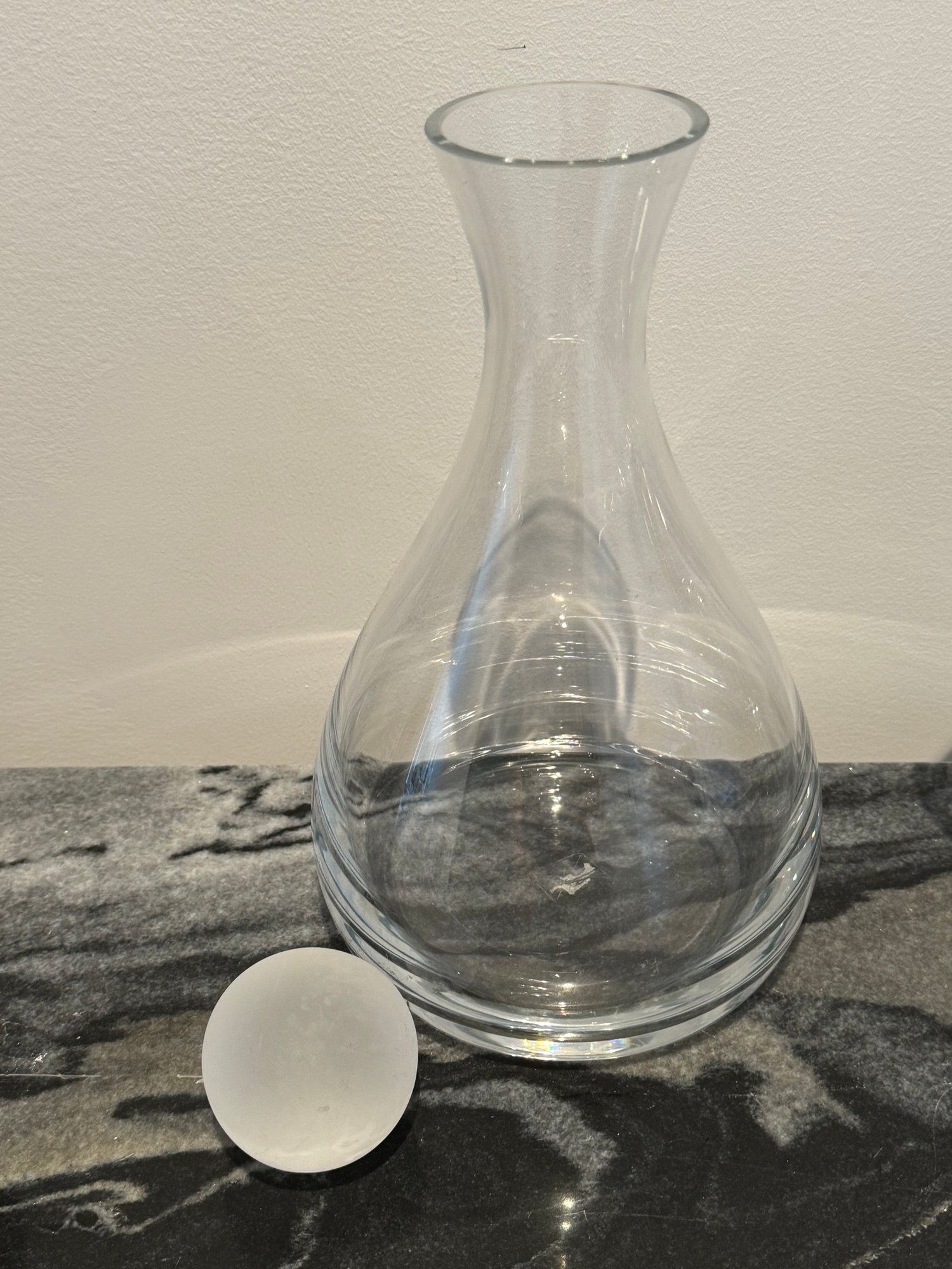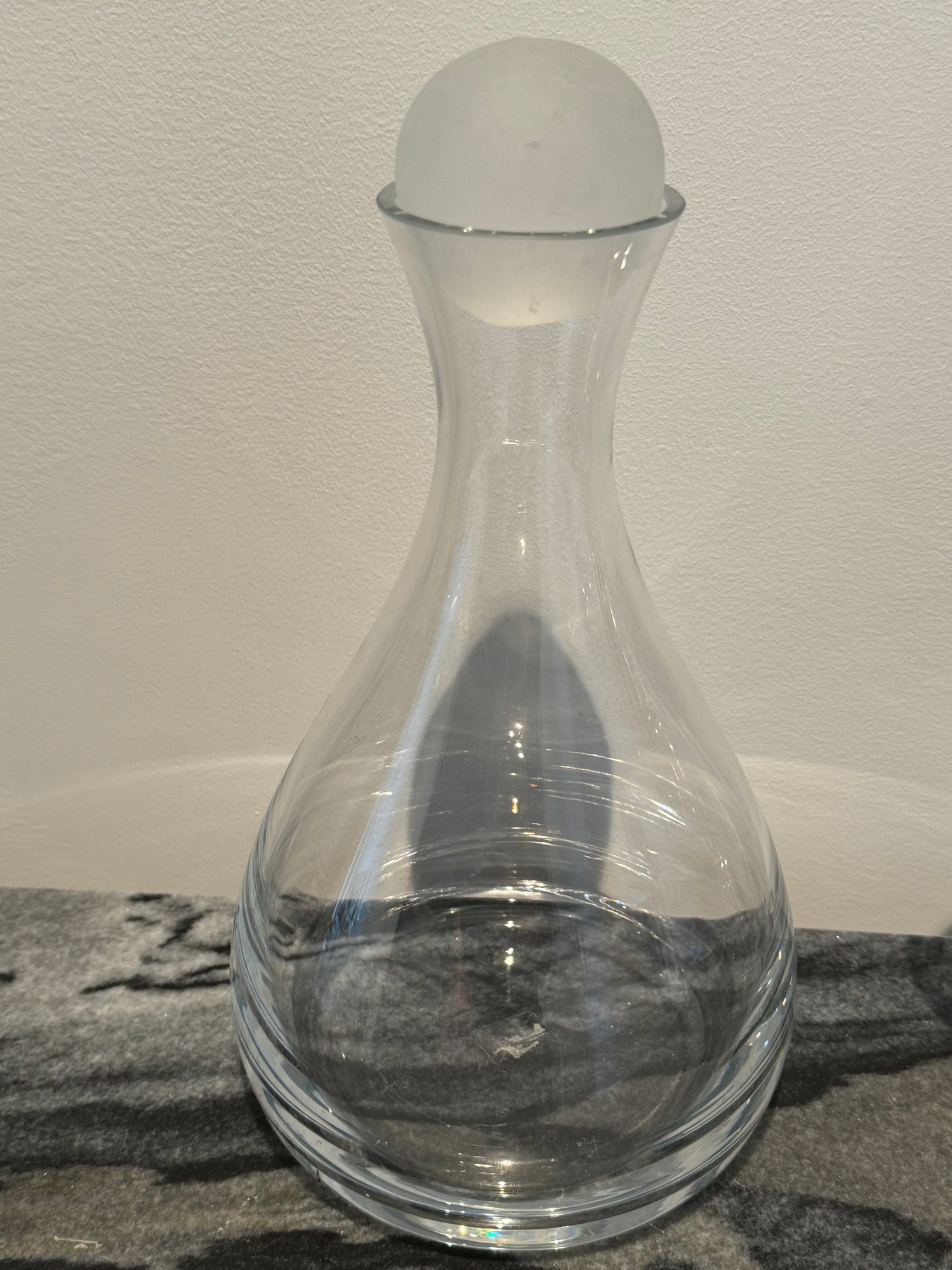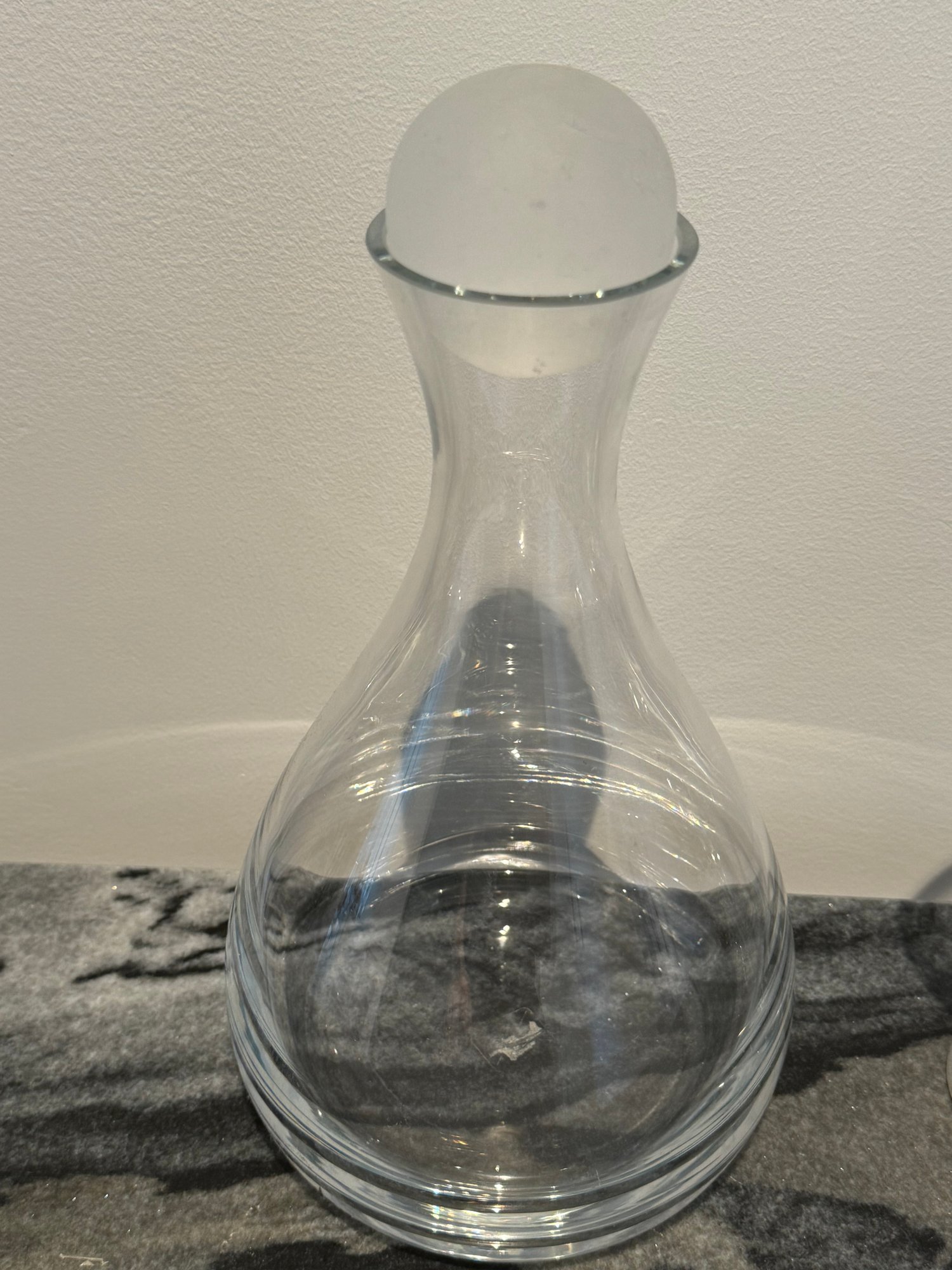 - Glass carafe with frosted glass top that is 12” tall with a 6” diameter at the base