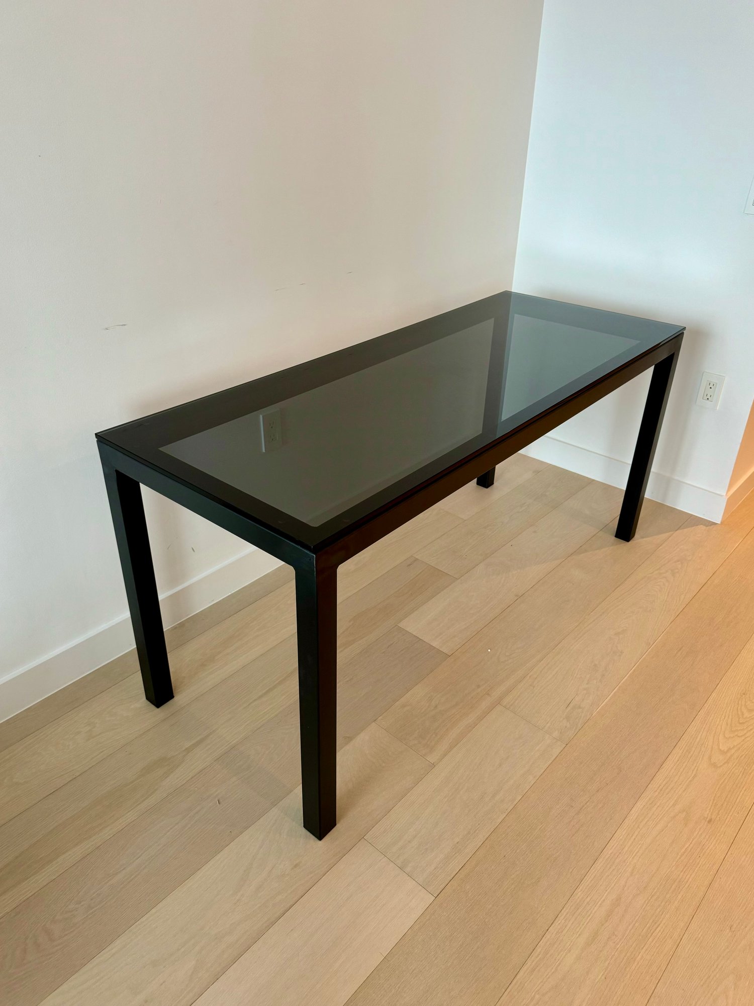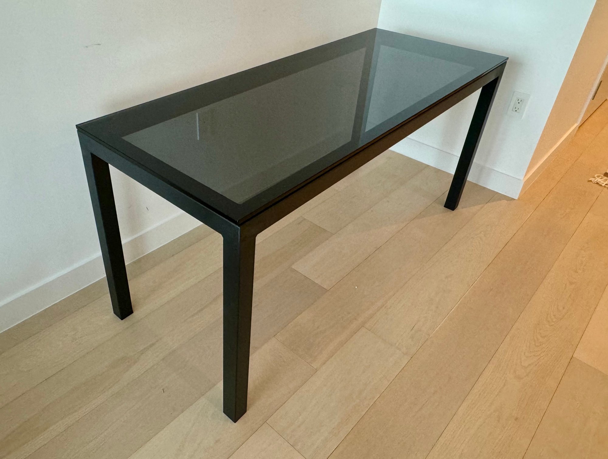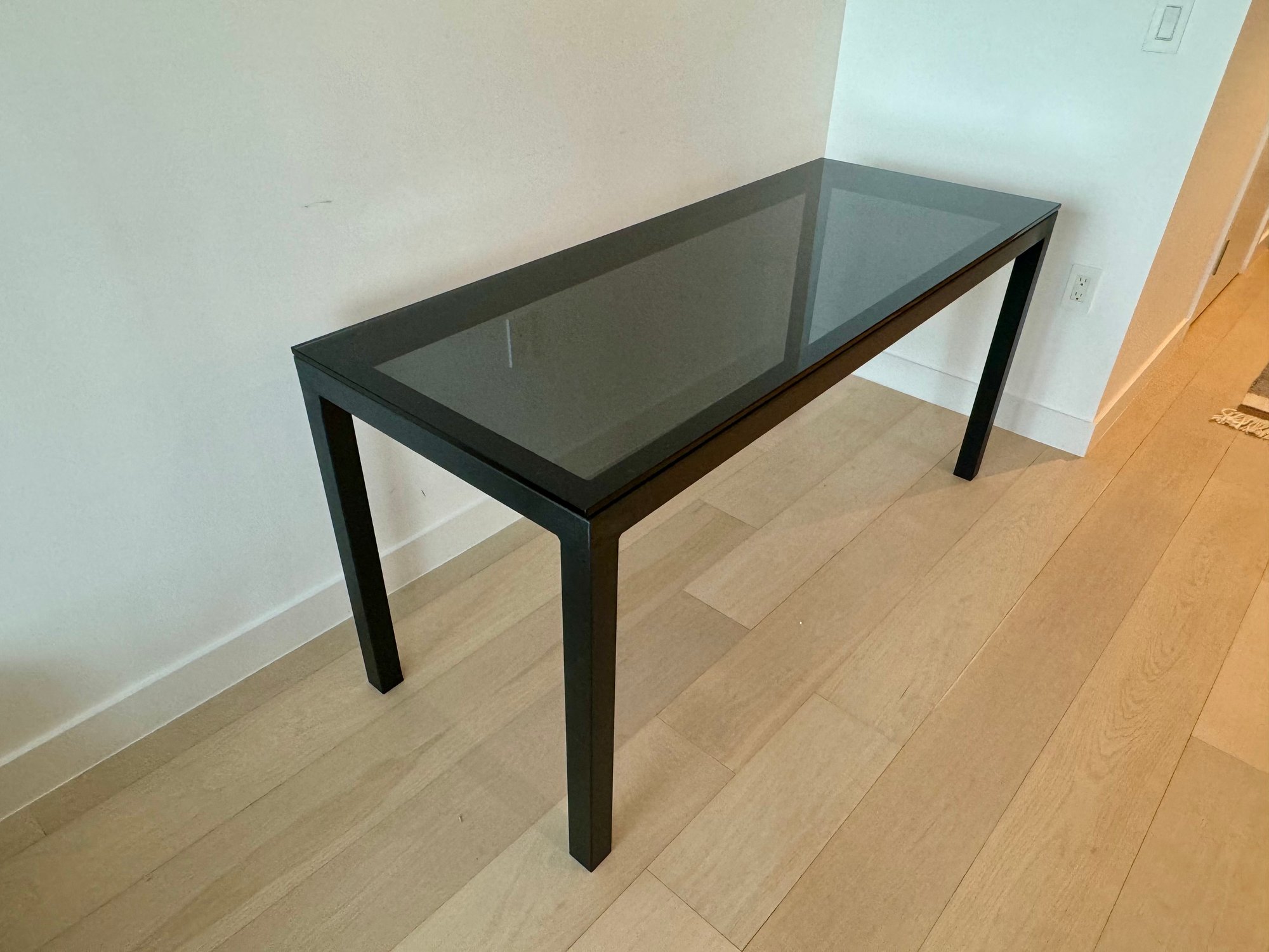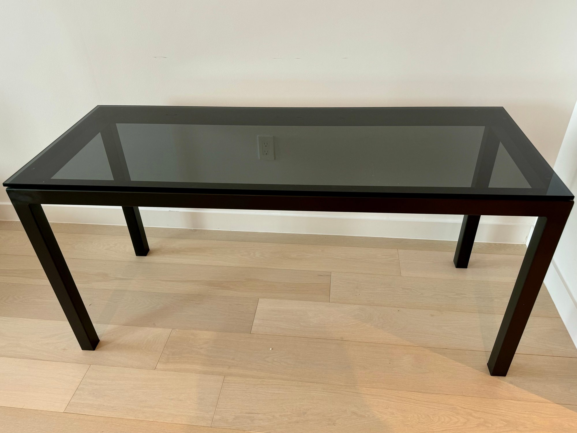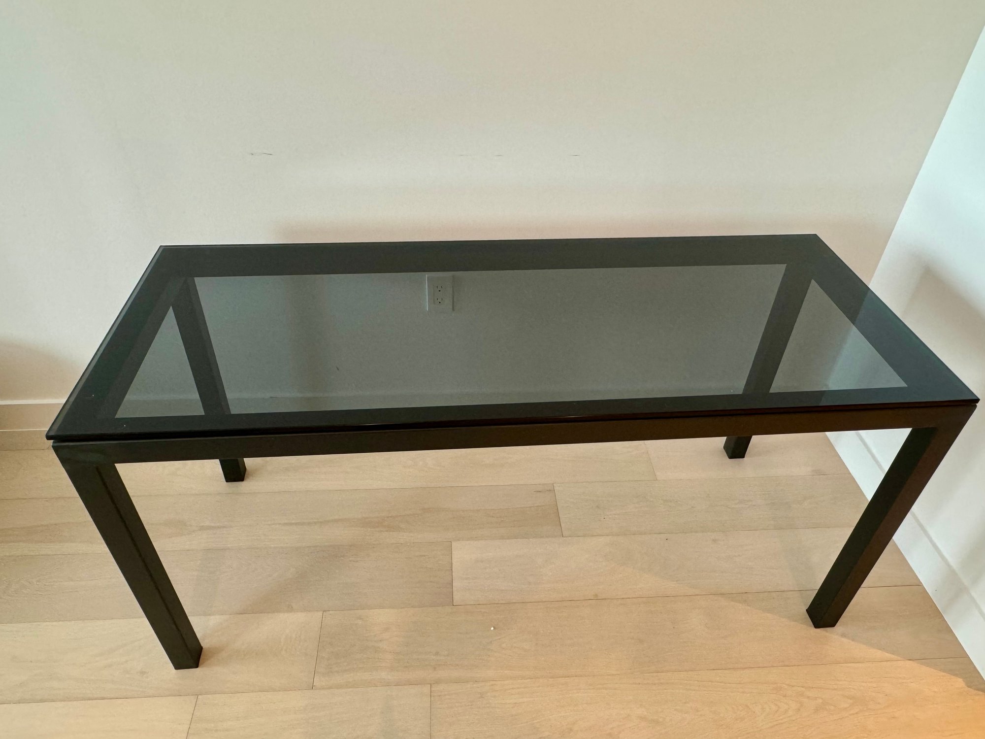 This lovely table measures 60”W x 24”D x 29”H. The glass is removable for transport.
