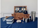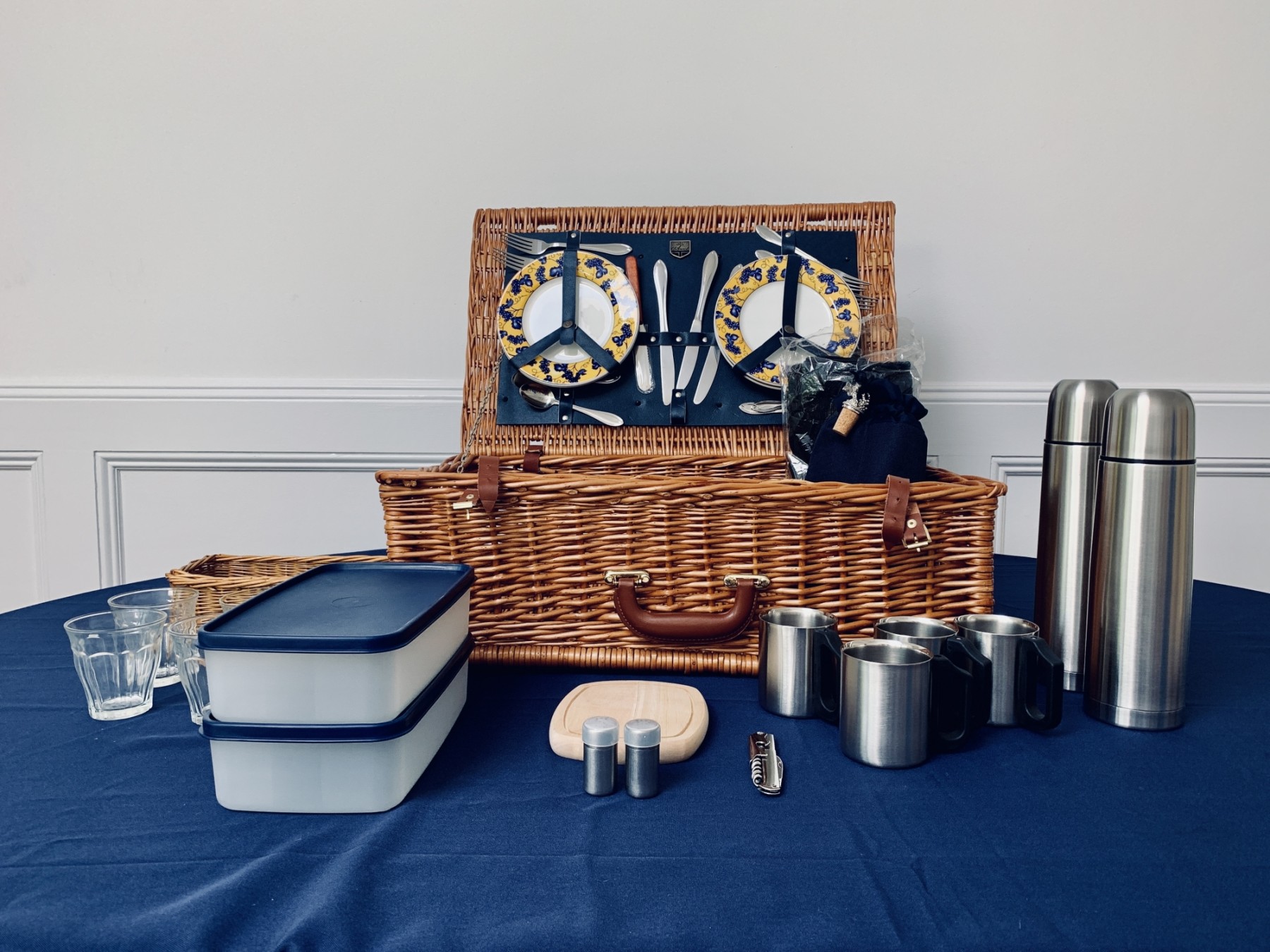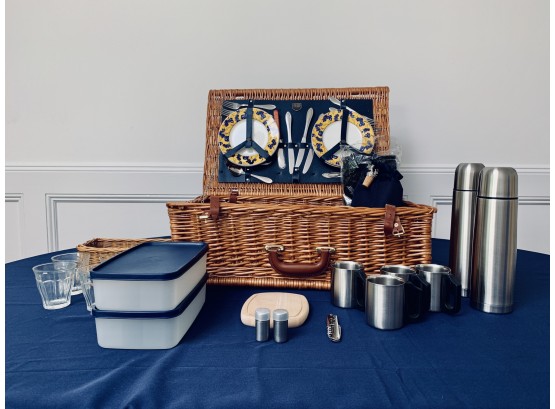 This lovely picnic basket includes 4 plates, silverware, thermoses, containers, cups, wine cooler, cutting board and a picnic blanket.