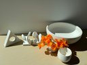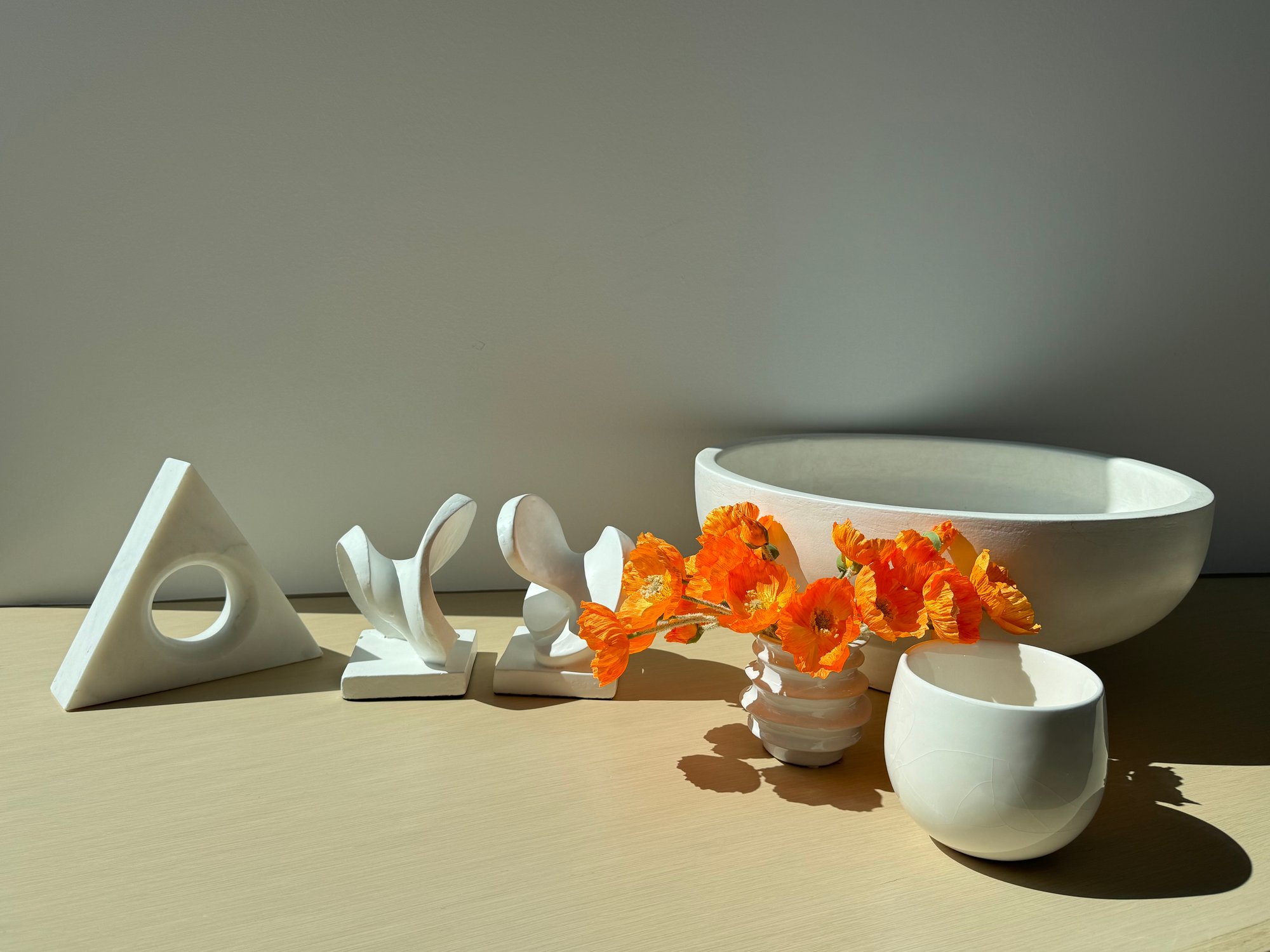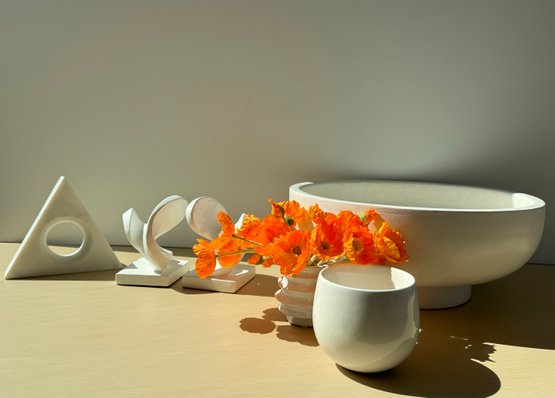 From a large ceramic bowl measuring 16.5”d by 7”h to a pair of white ceramic sculptures measuring 5” square by 6.5” tall, there are some very interesting pieces in this collection.