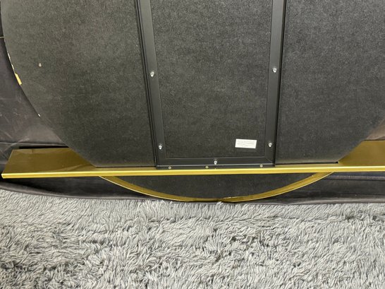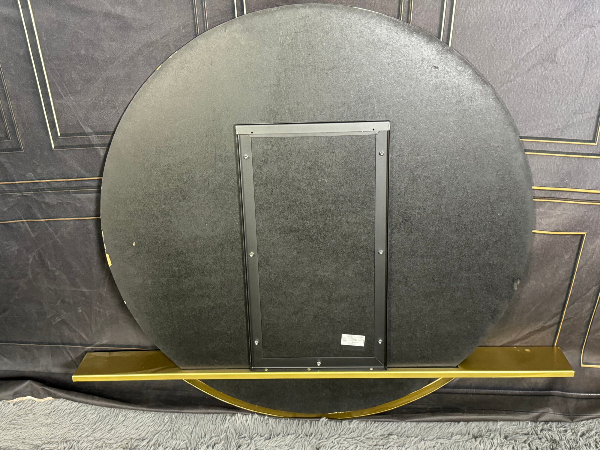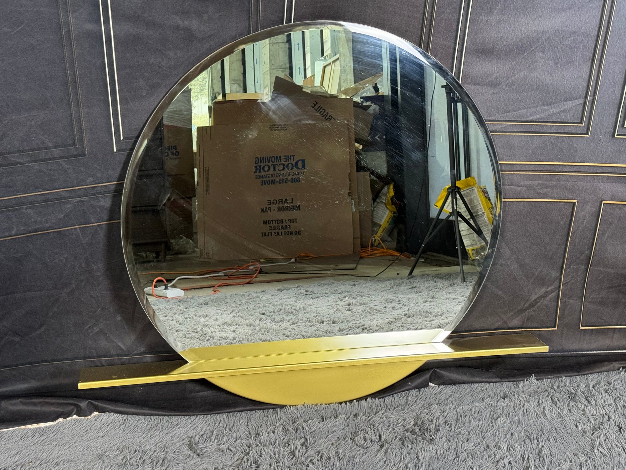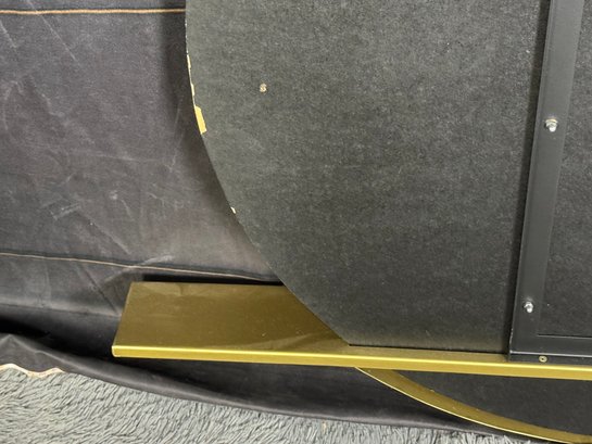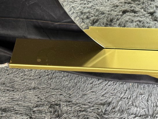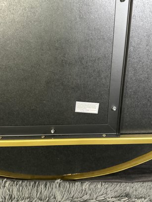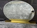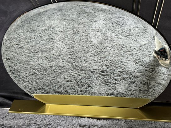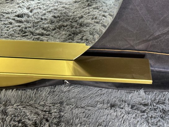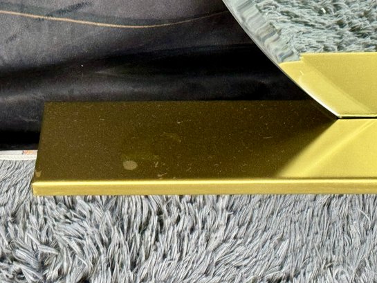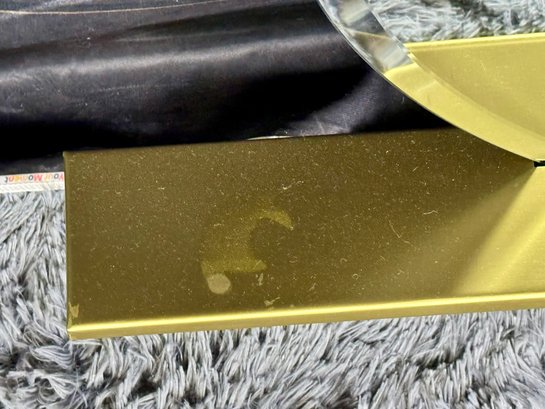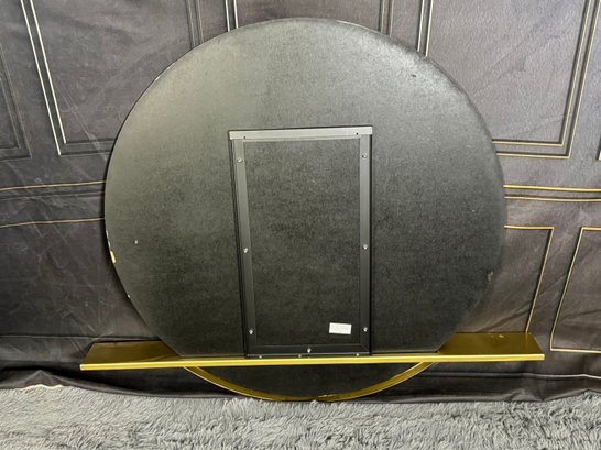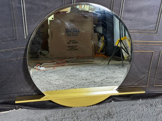 This lovely piece does have some etching in the brass shelf which is photo-documented. The mirror measures 36” diameter; the shelf is 44” long by 4” deep.