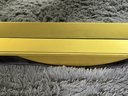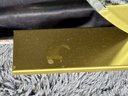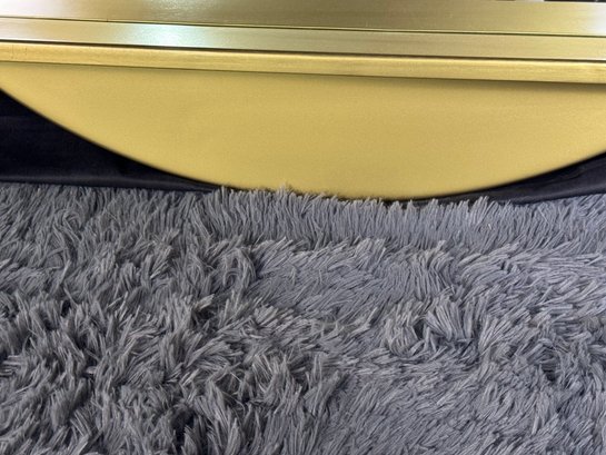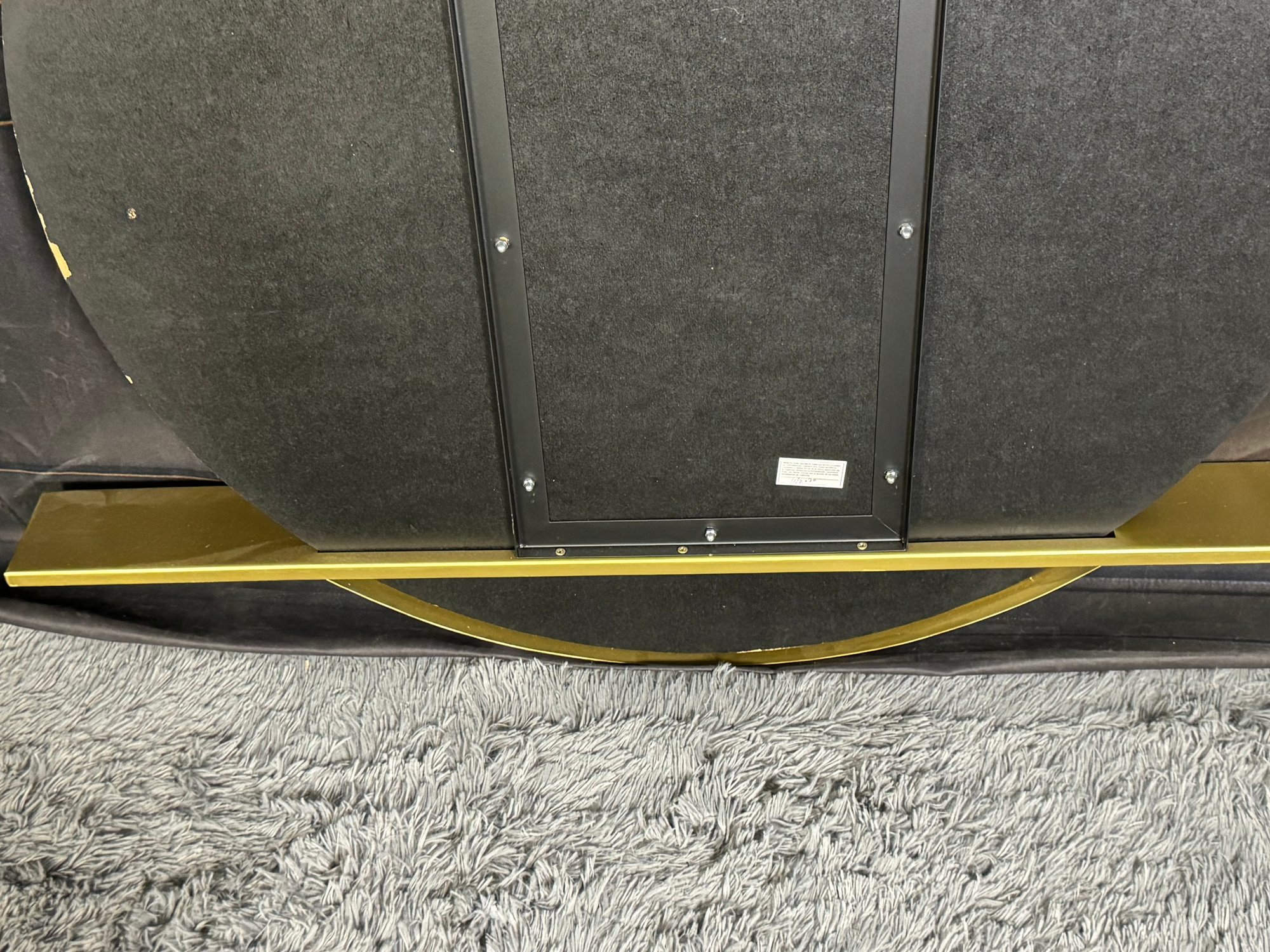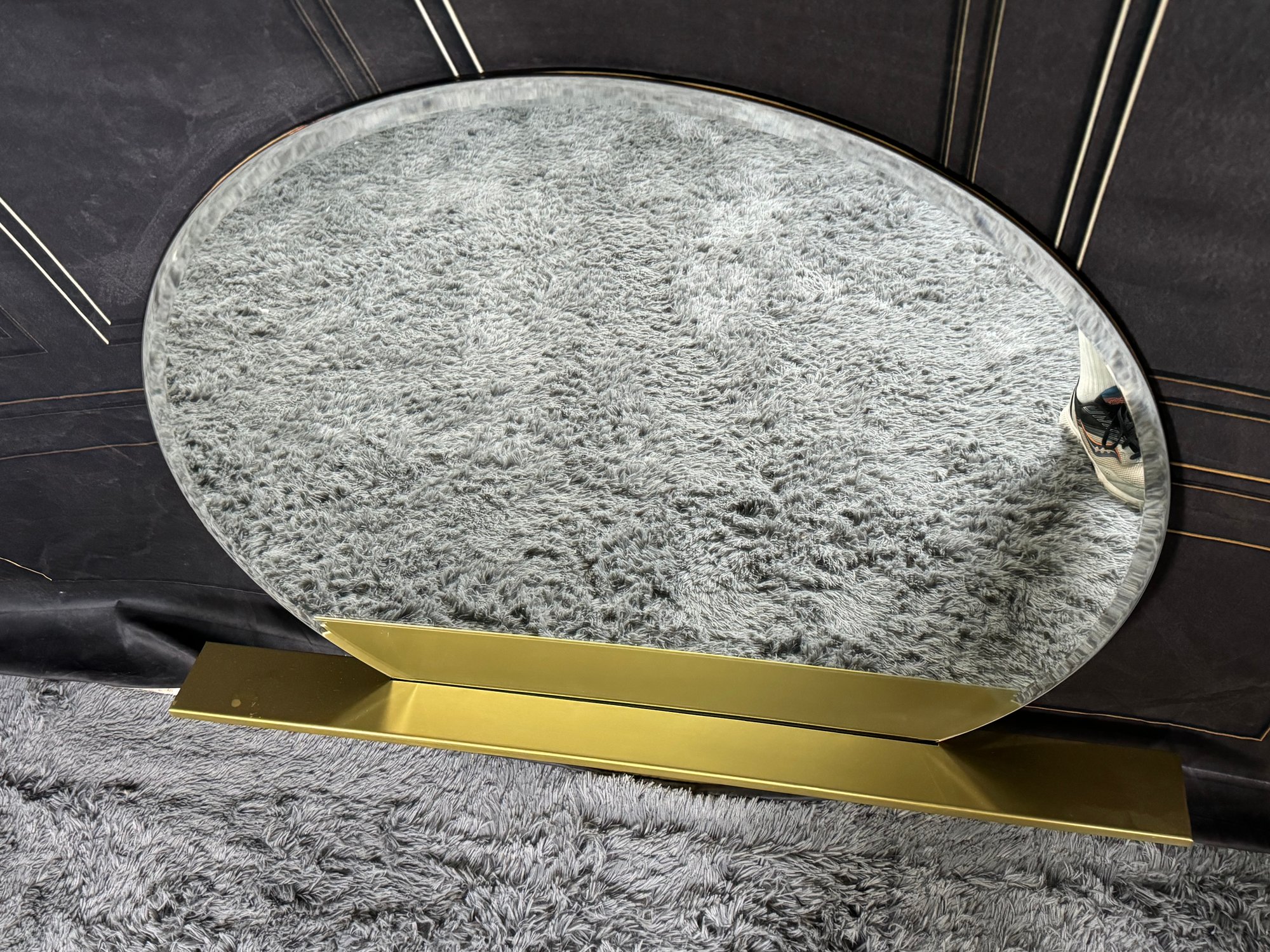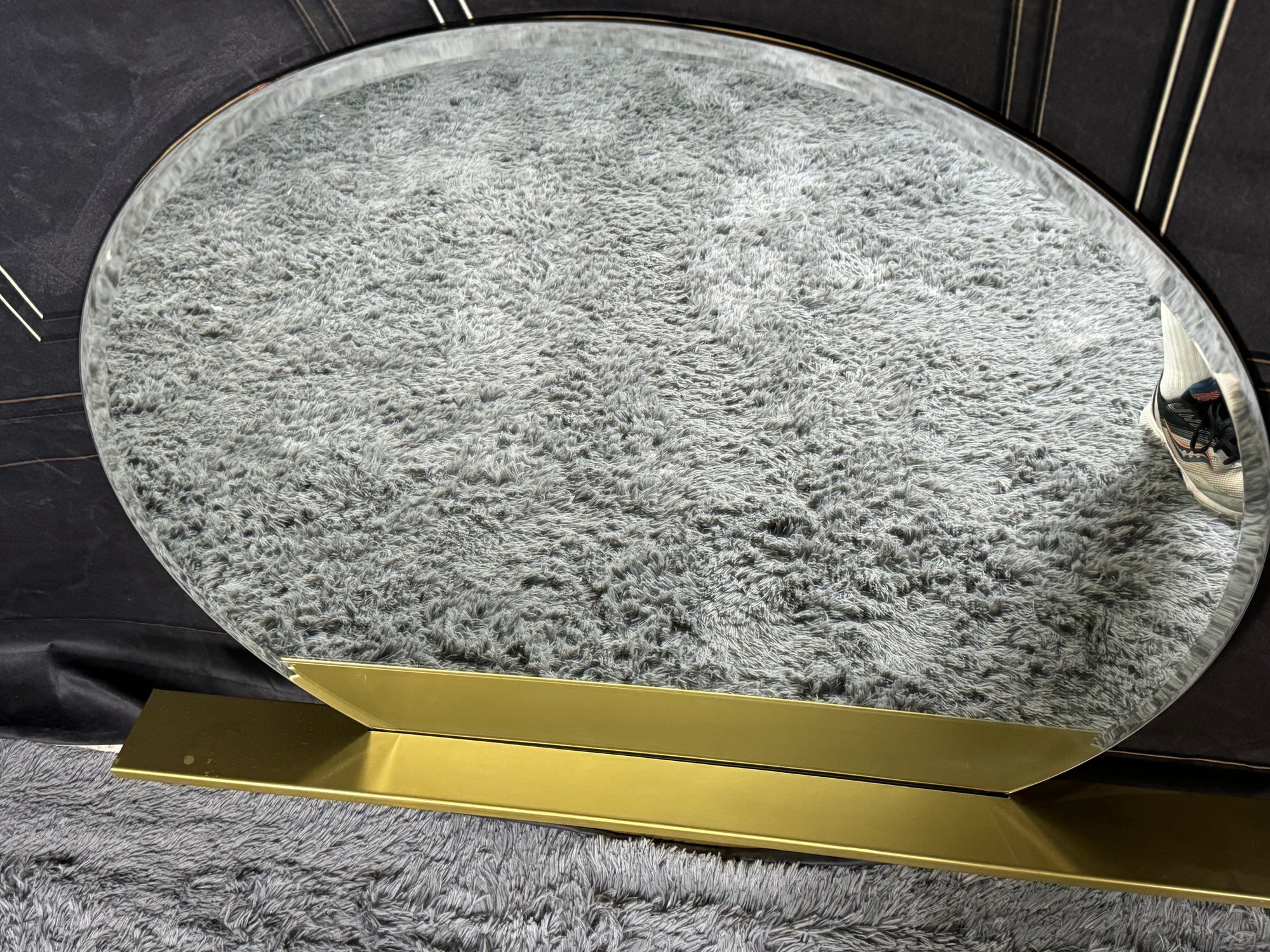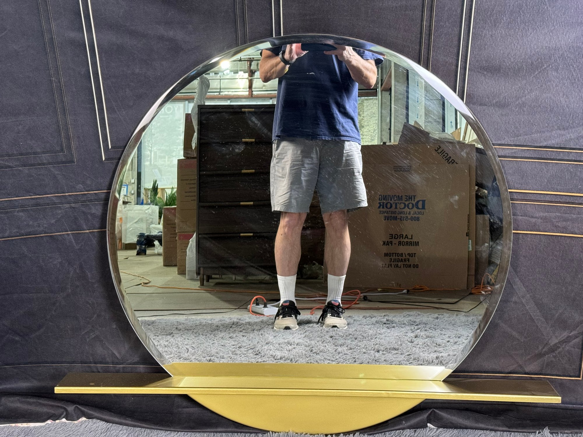 This lovely piece does have some etching in the brass shelf which is photo-documented. The mirror measures 36” diameter; the shelf is 44” long by 4” deep.