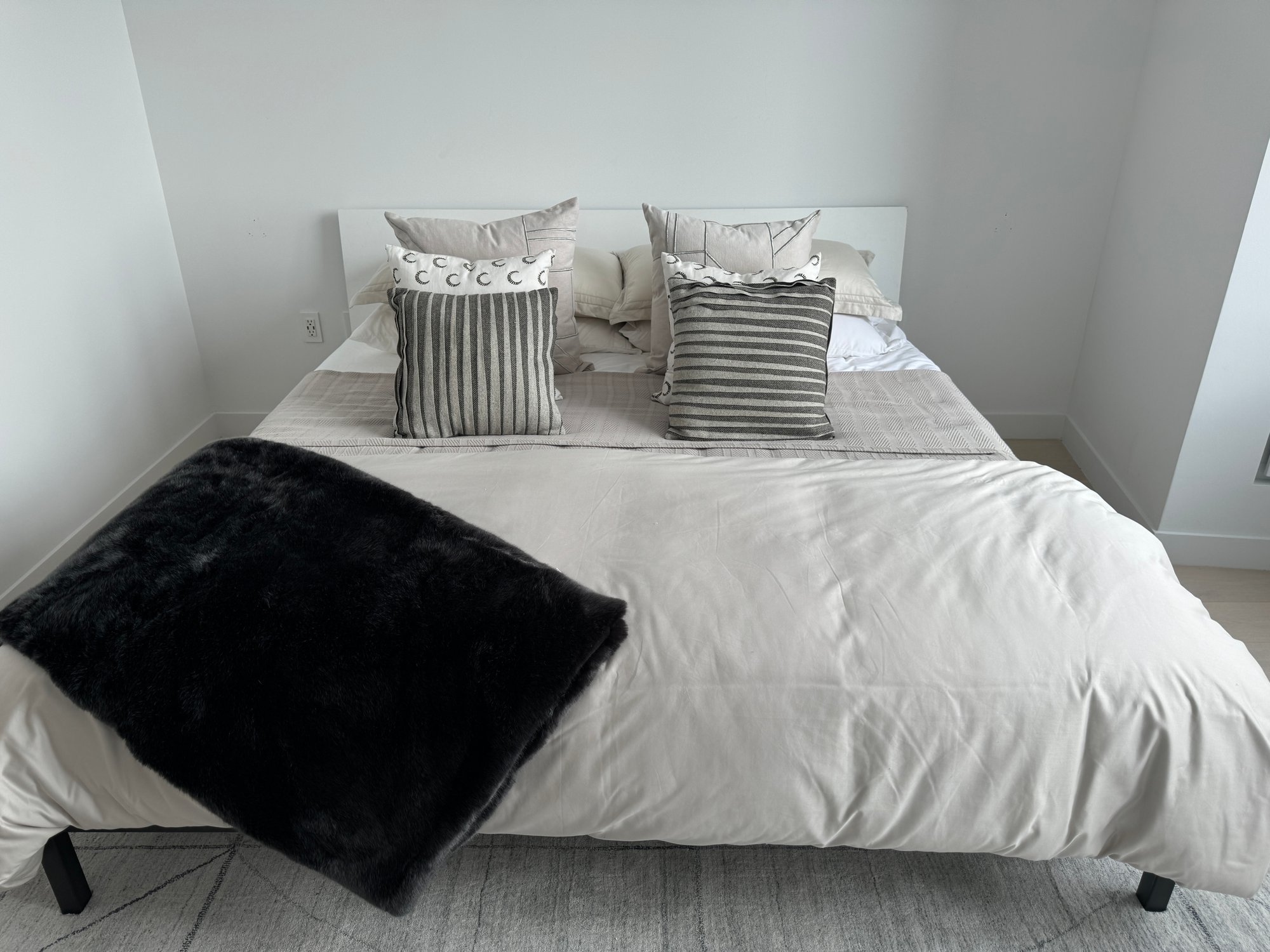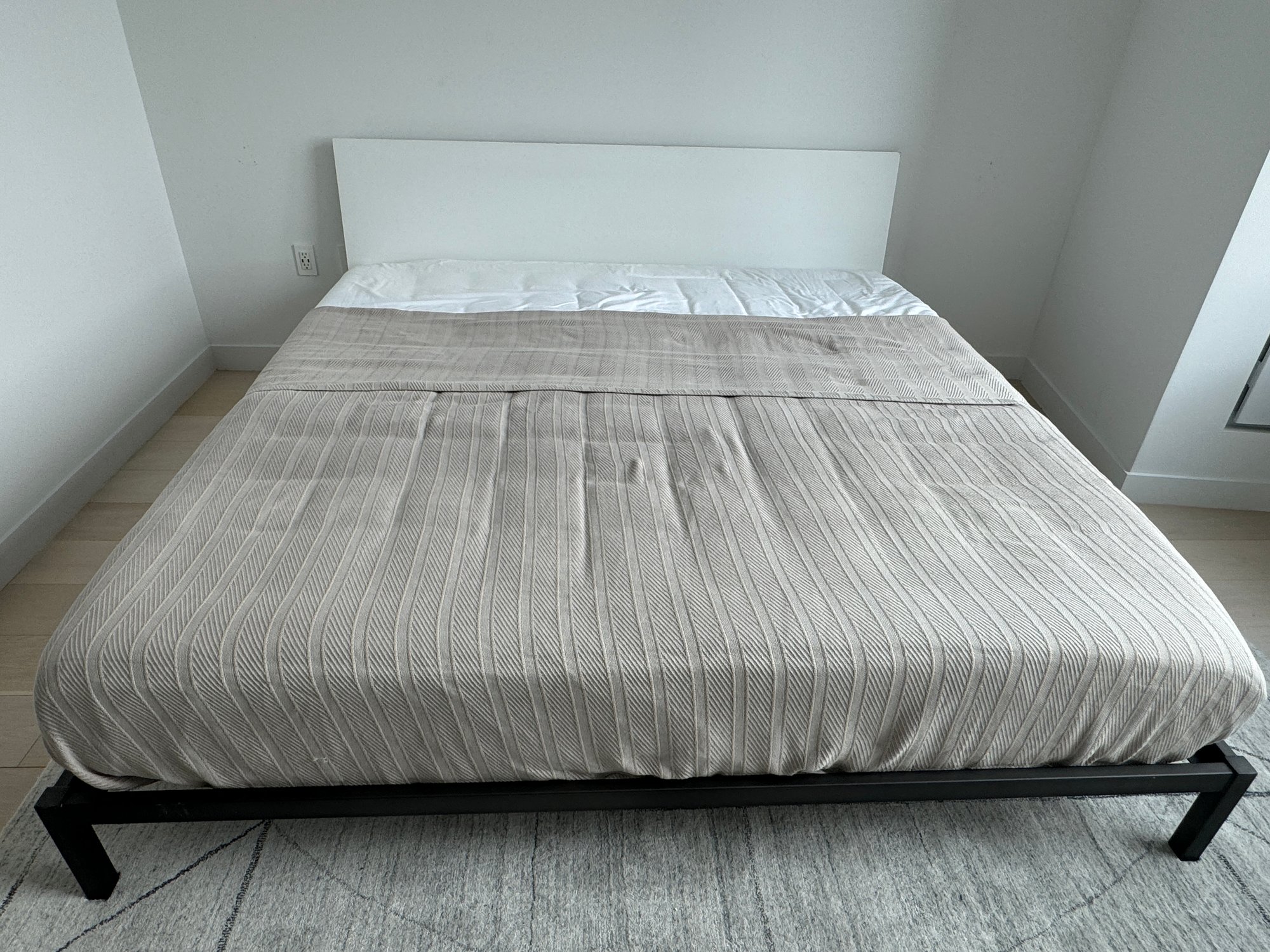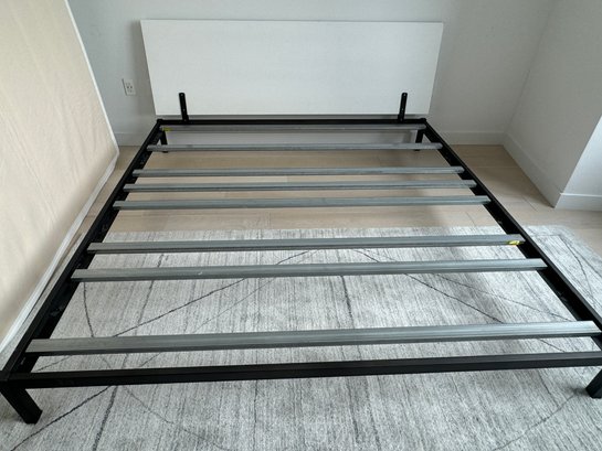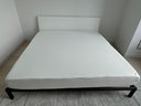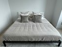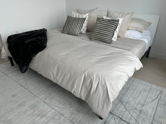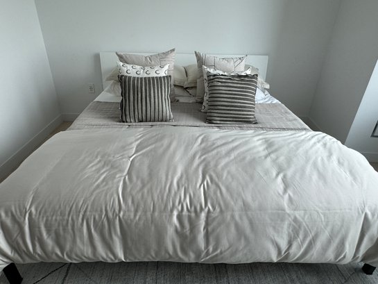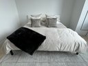 This modern, angular bed does show some signs of use on the headboard which are photo-documented. It measures 82”W x 84”D x 36”H at the headboard. The bedding is included.