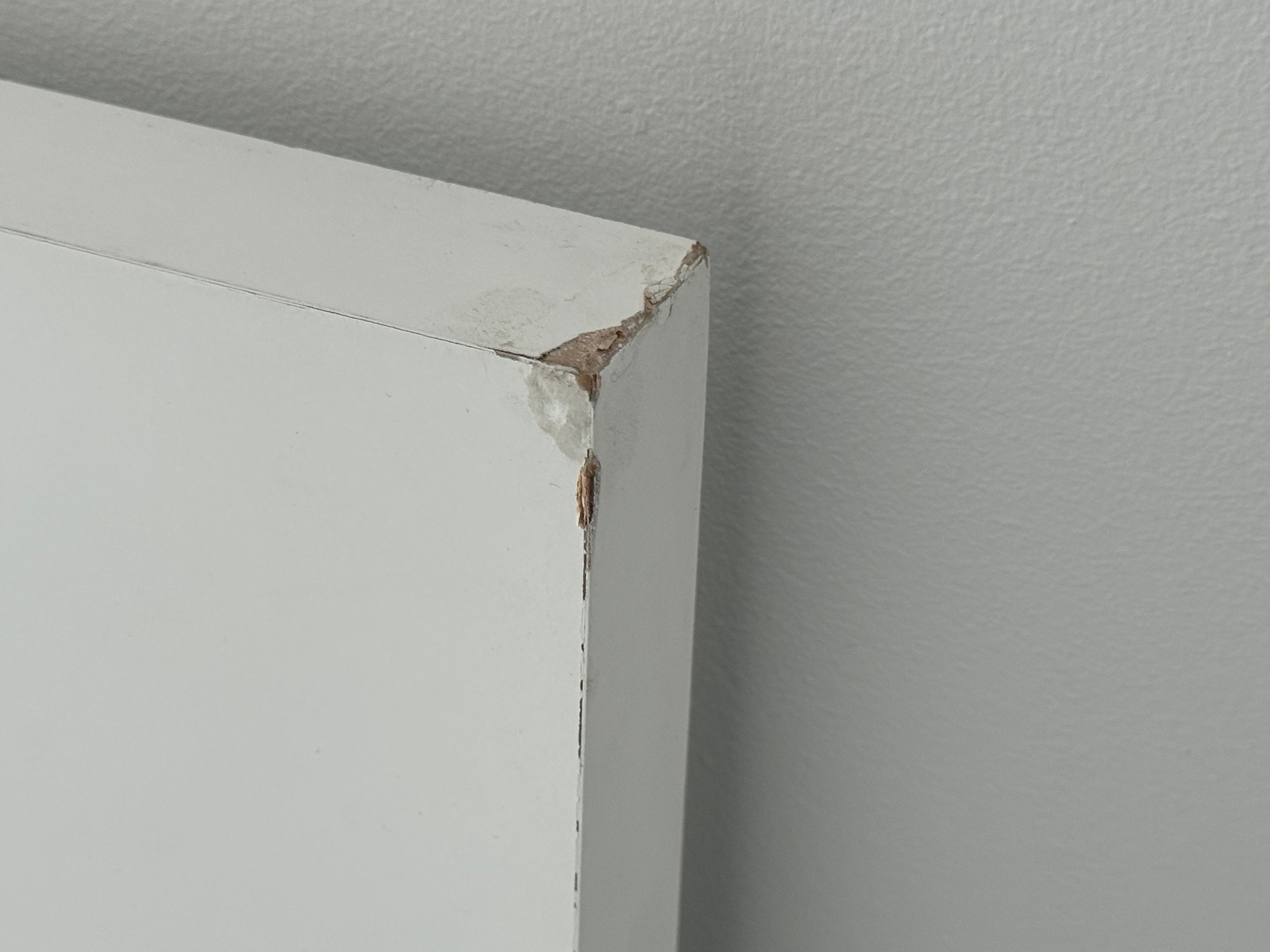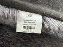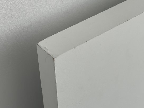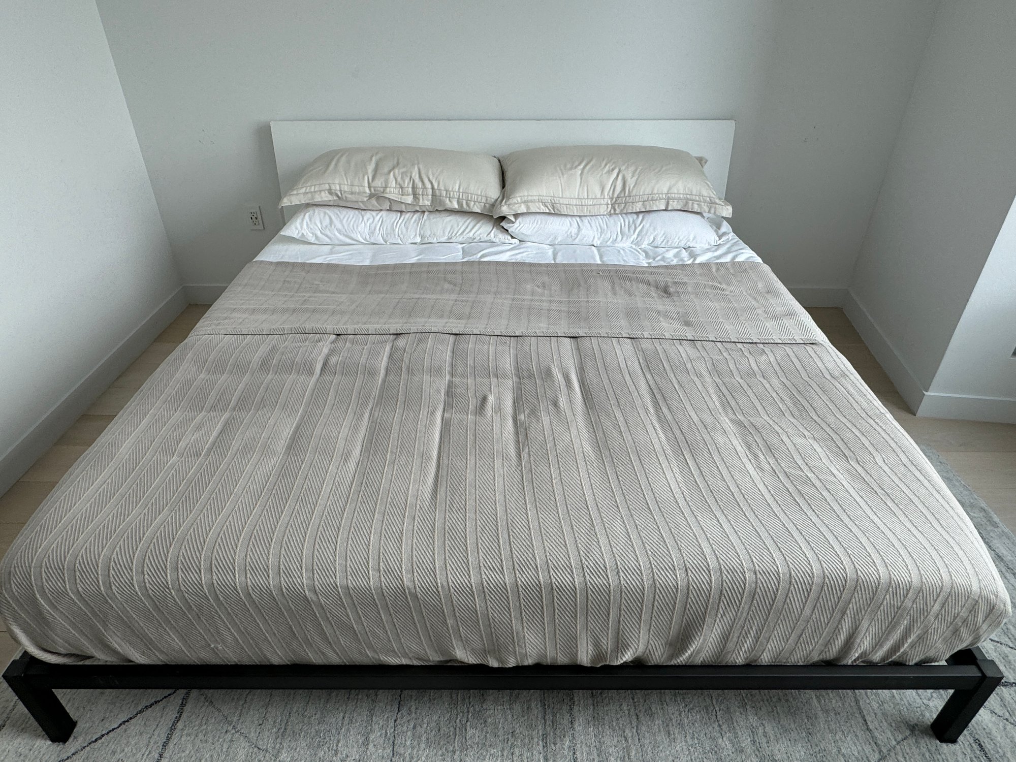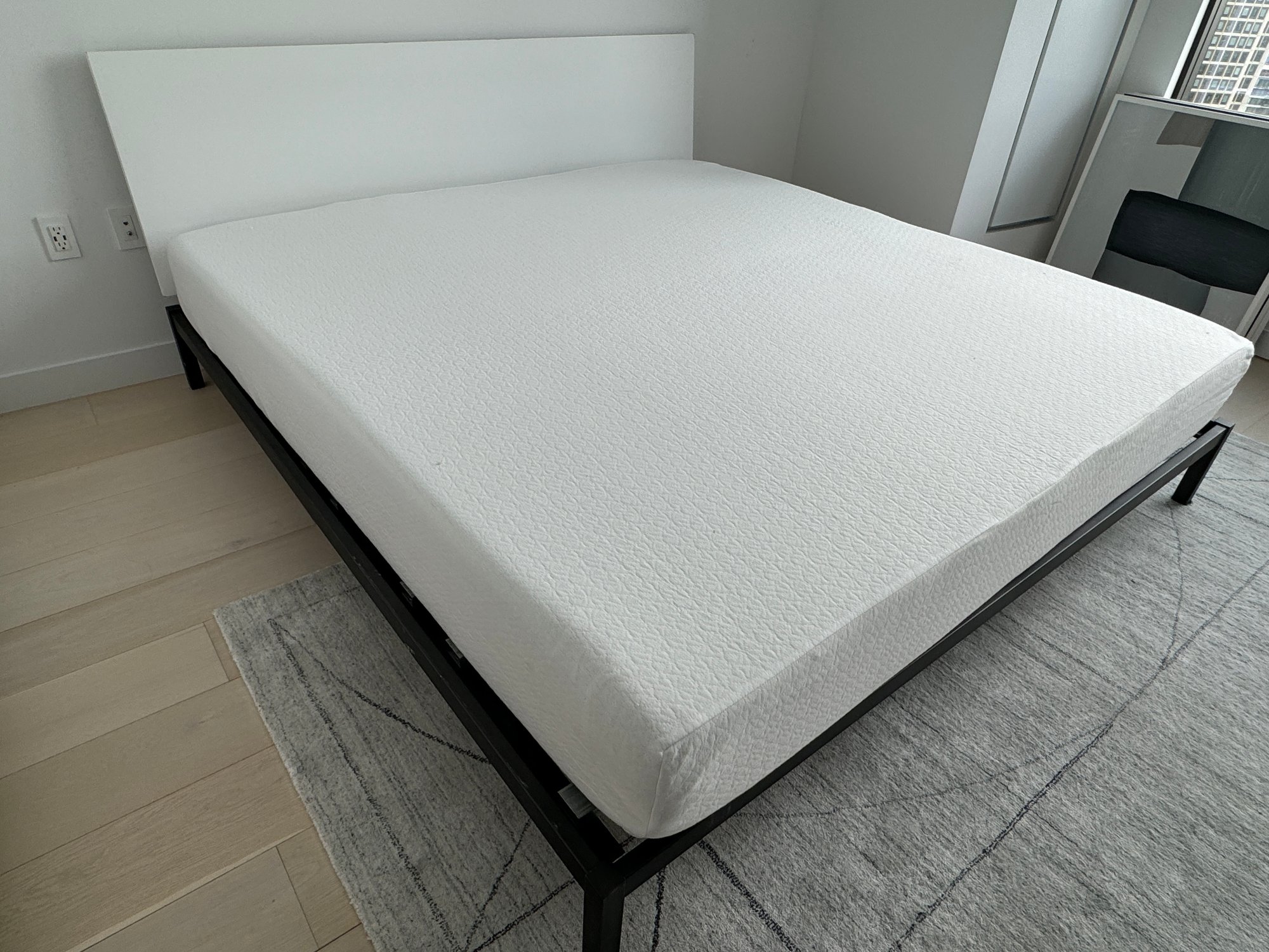 This modern, angular bed does show some signs of use on the headboard which are photo-documented. It measures 82”W x 84”D x 36”H at the headboard. The bedding is included.