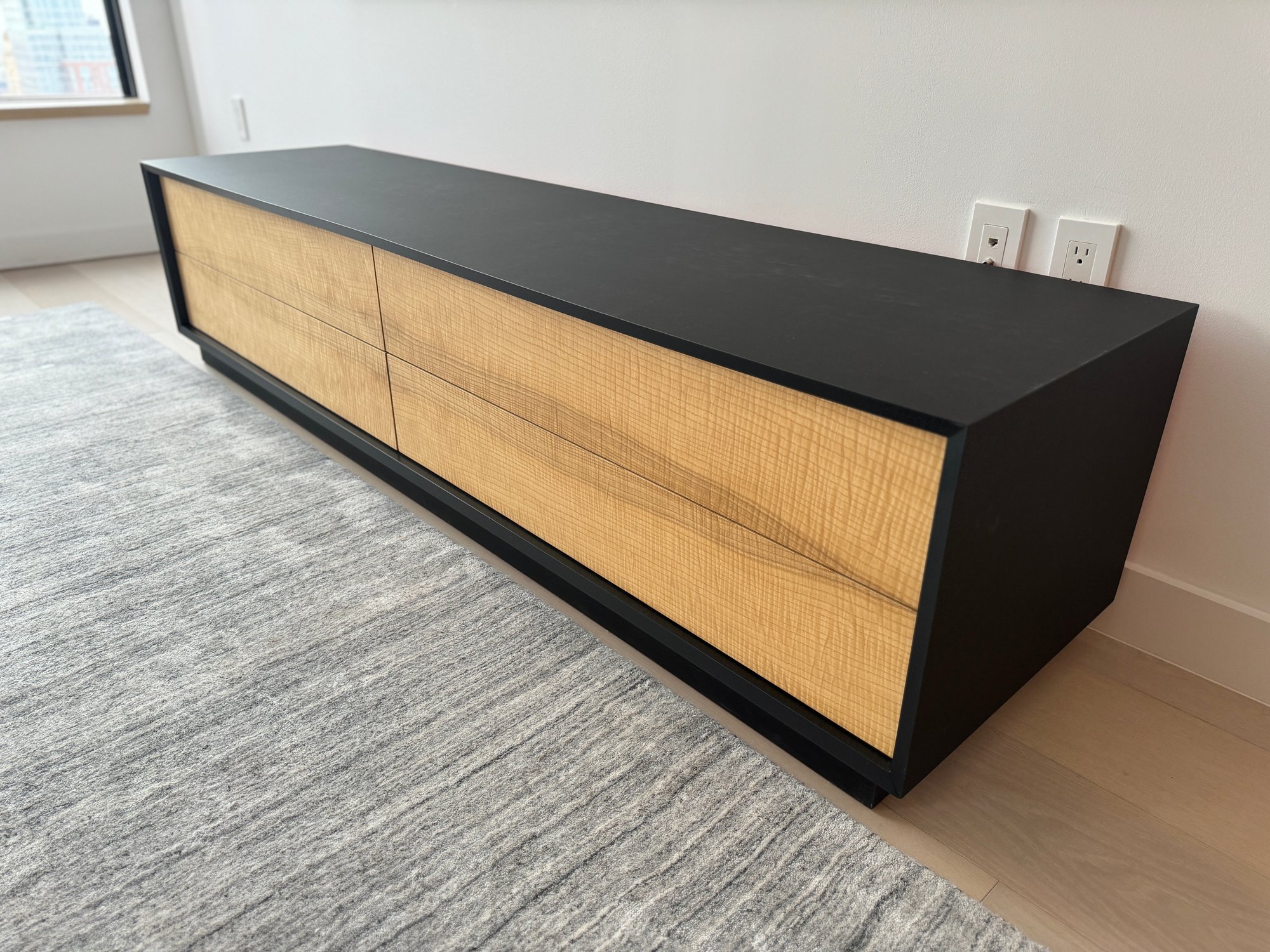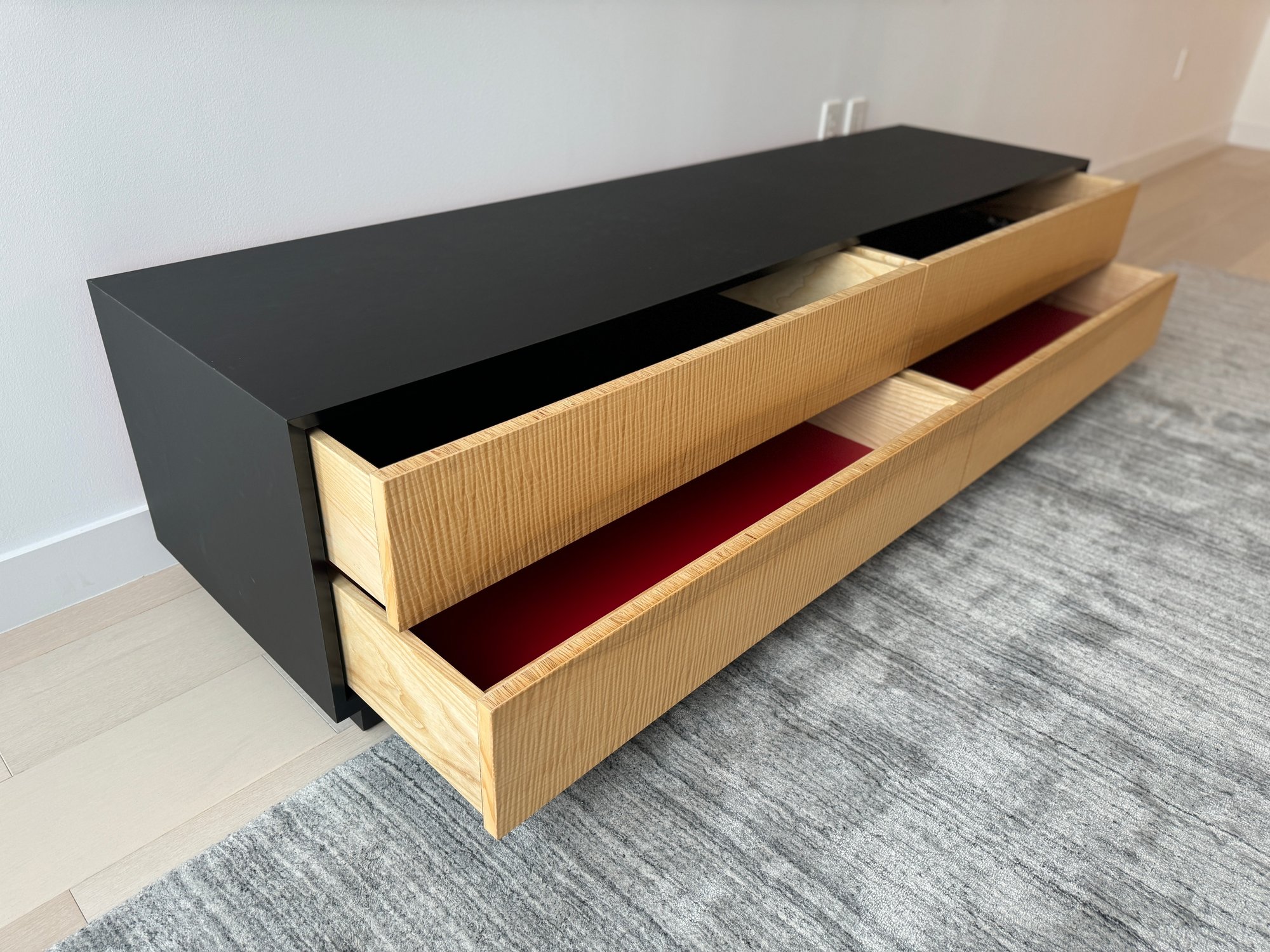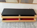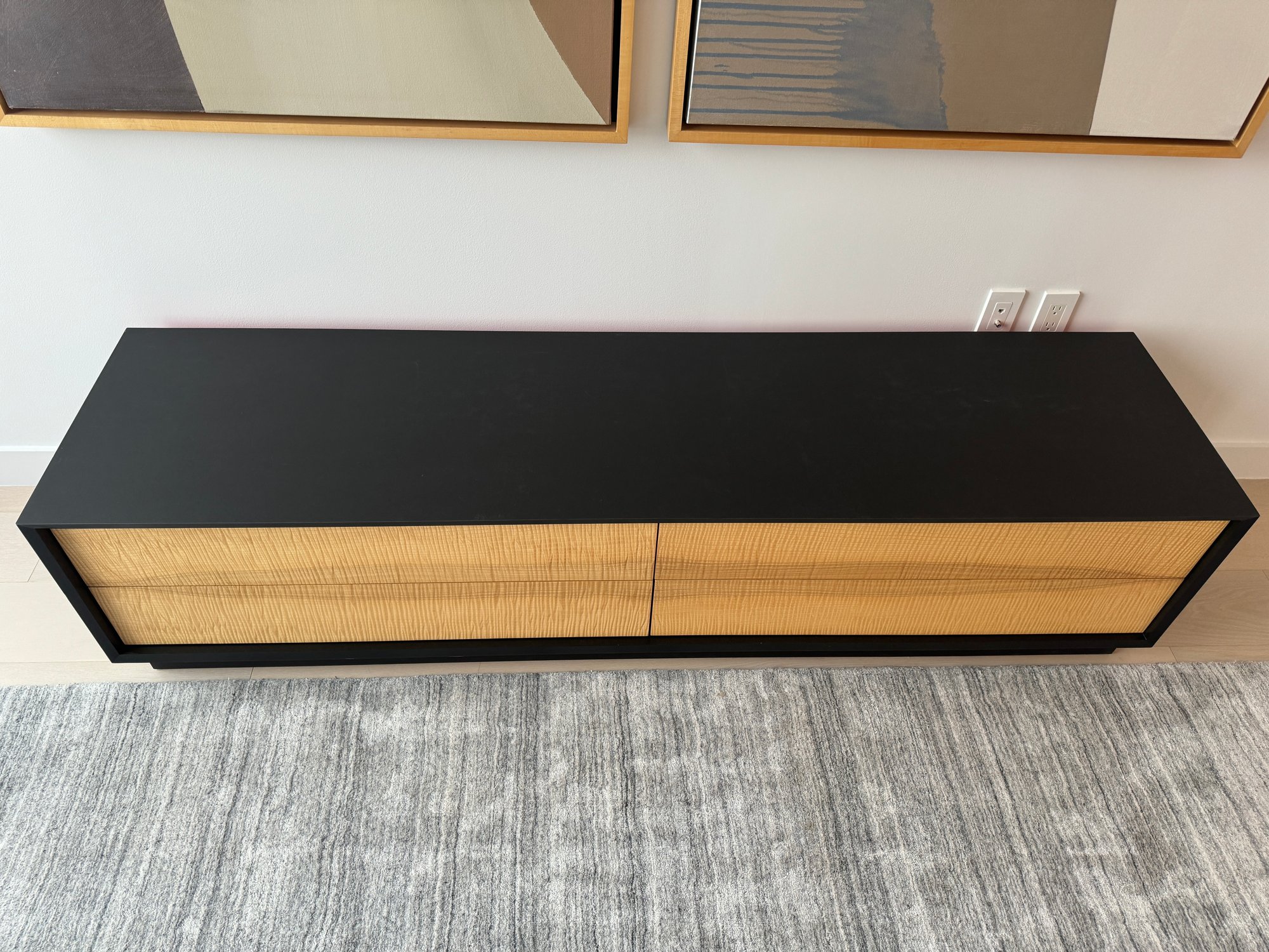 This beautiful piece measures 76”W x 19”D x 18”H. The drawers feature a magnetic closure.