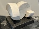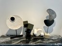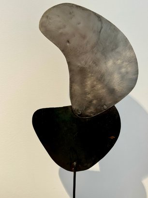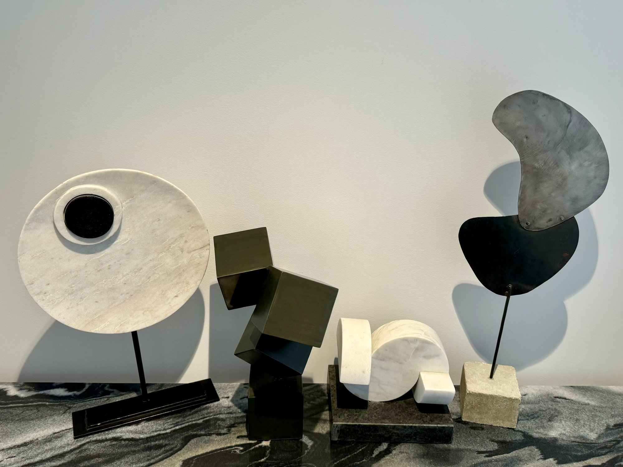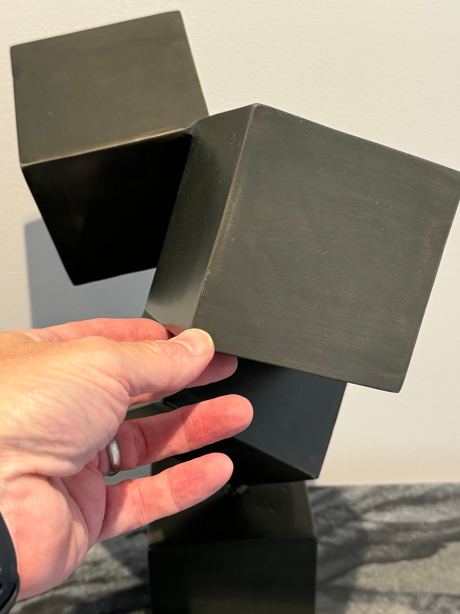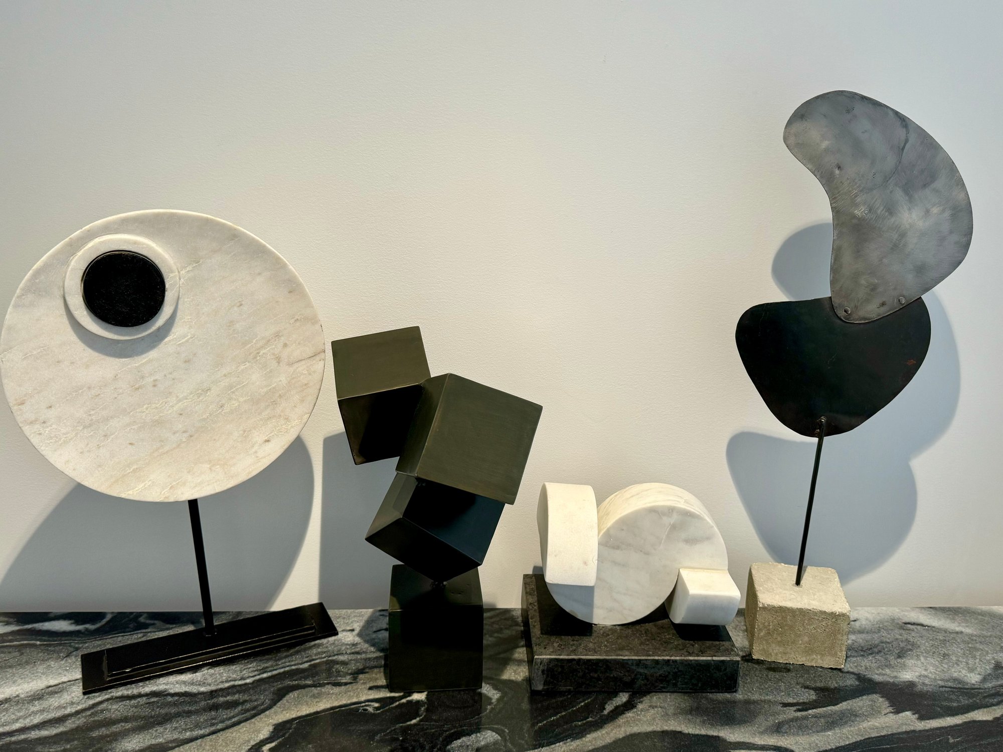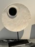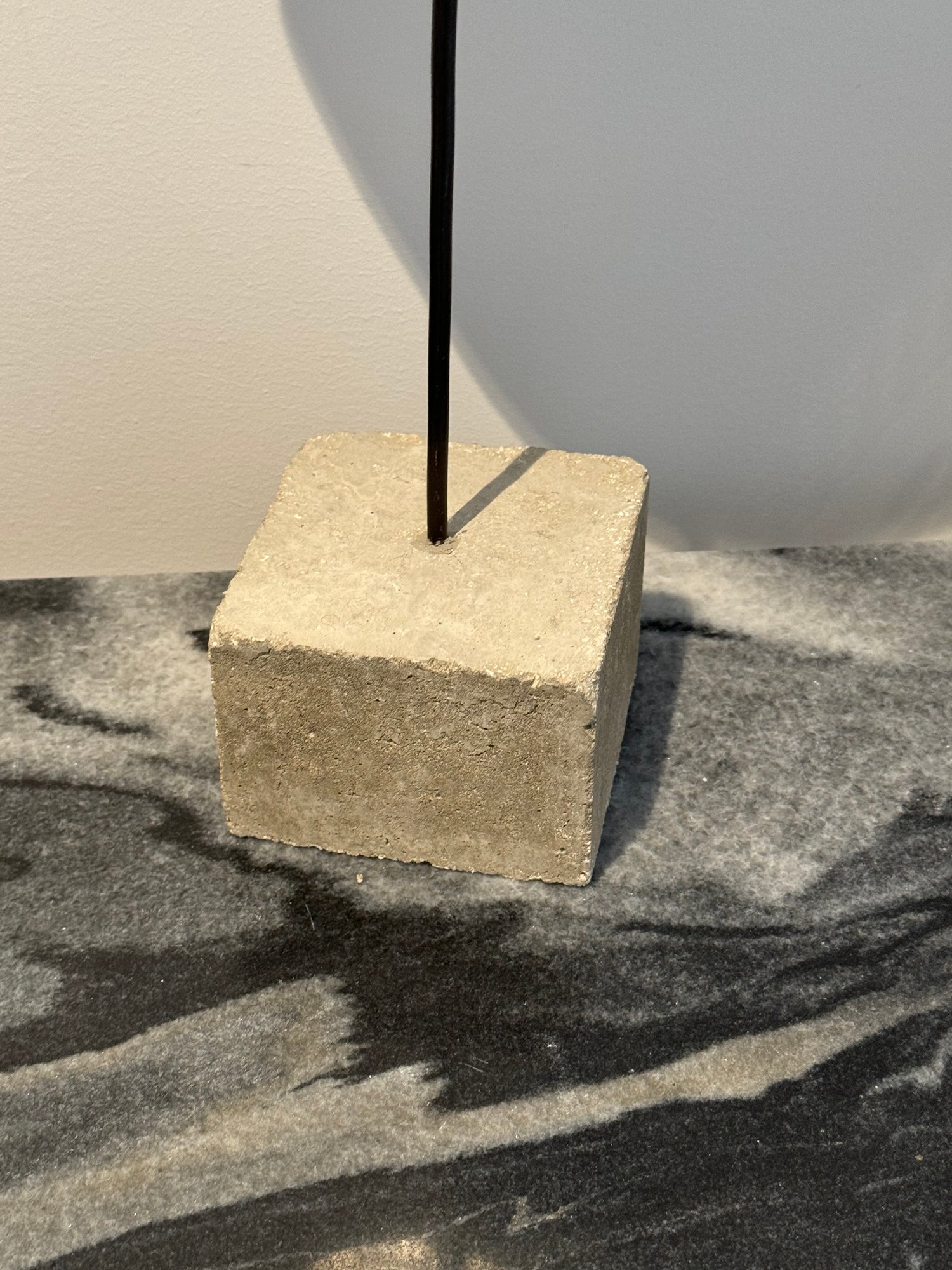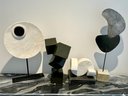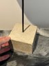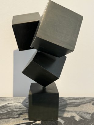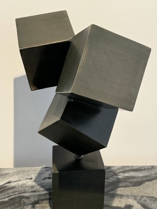 - Metal shapes on stone base that measures 24” tall with a 4” cube base