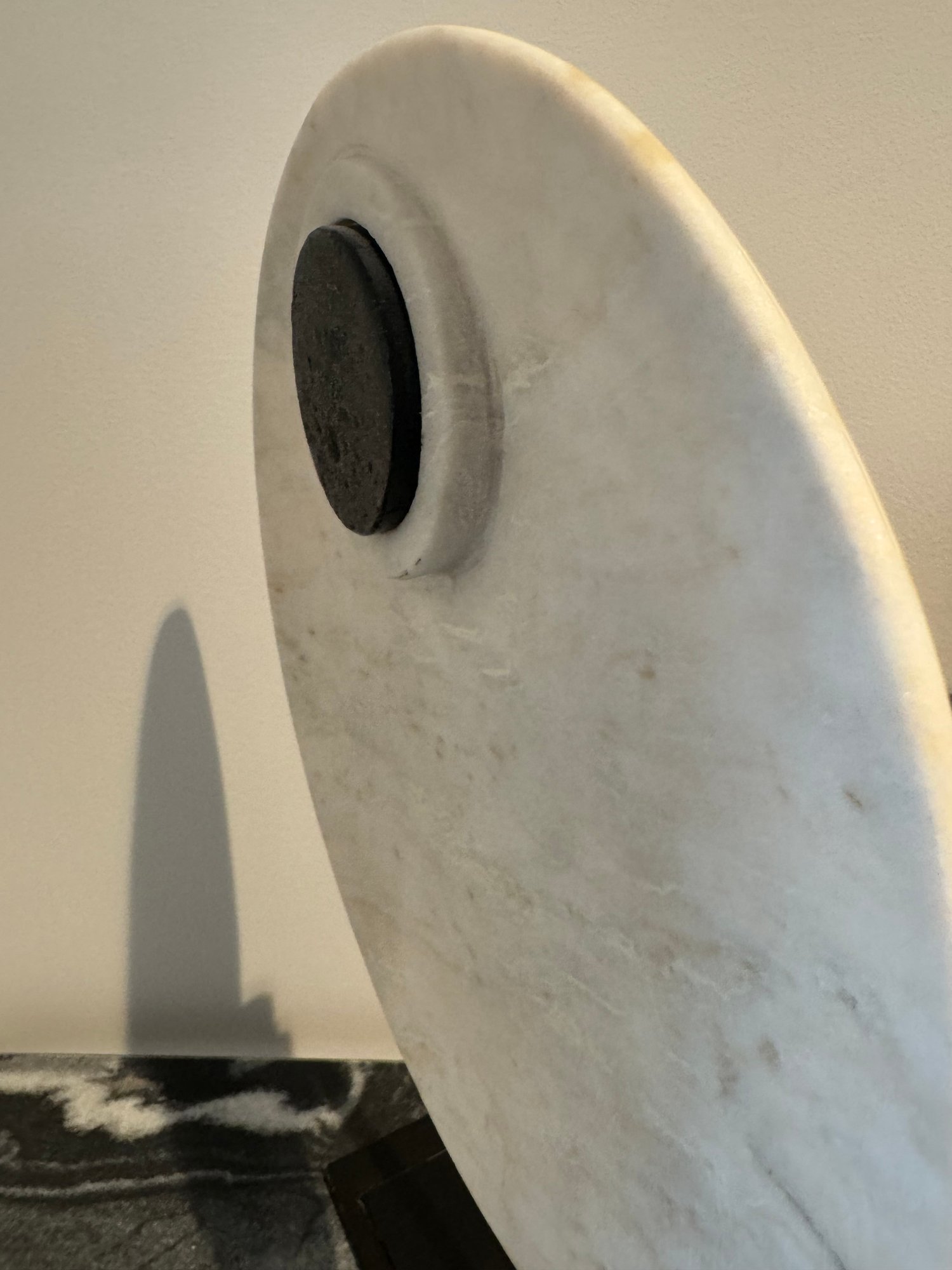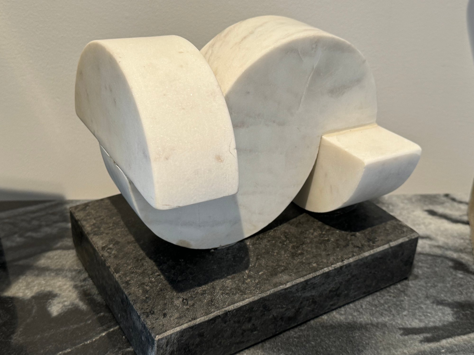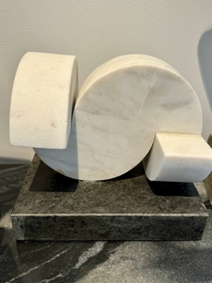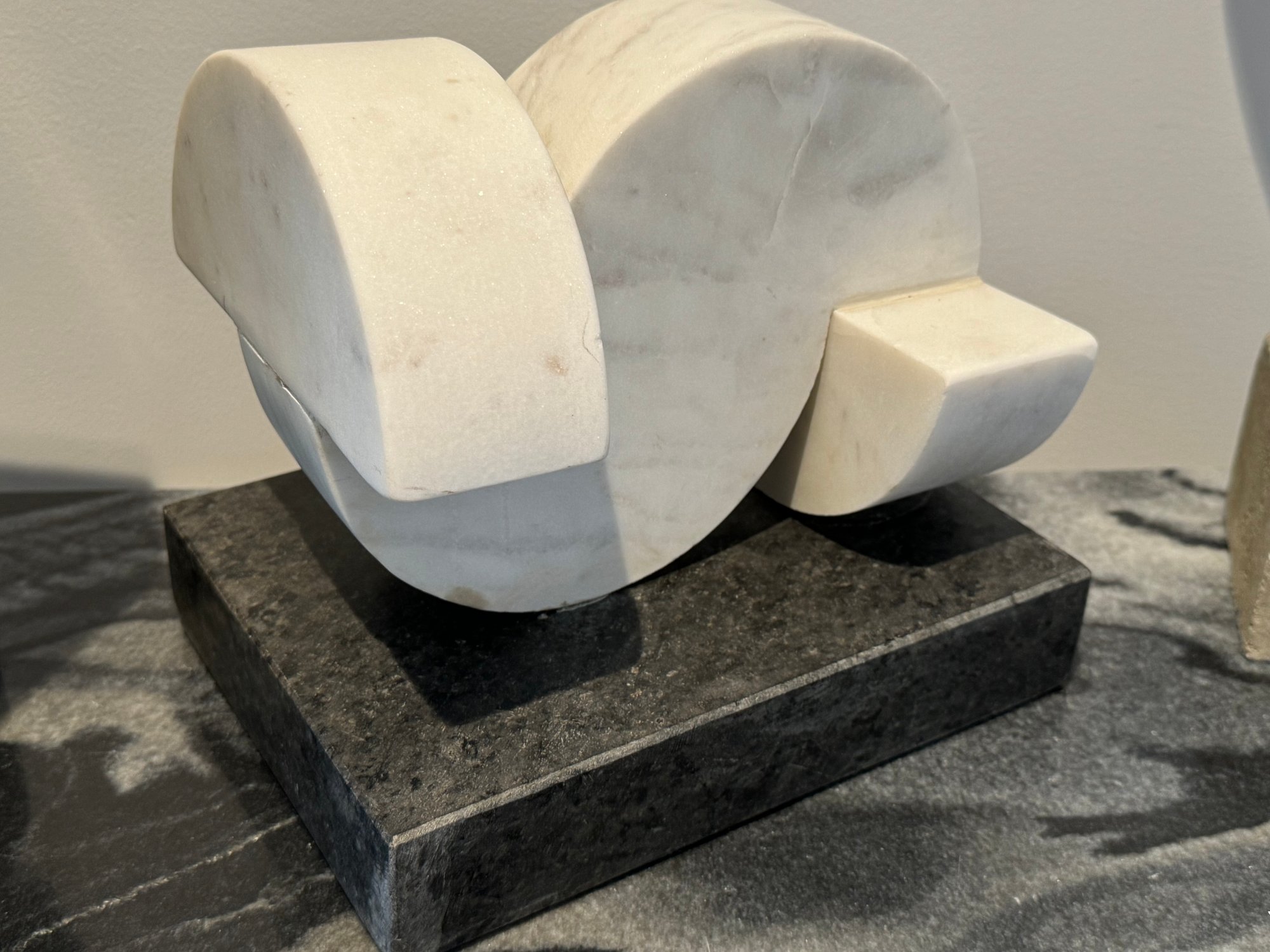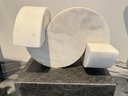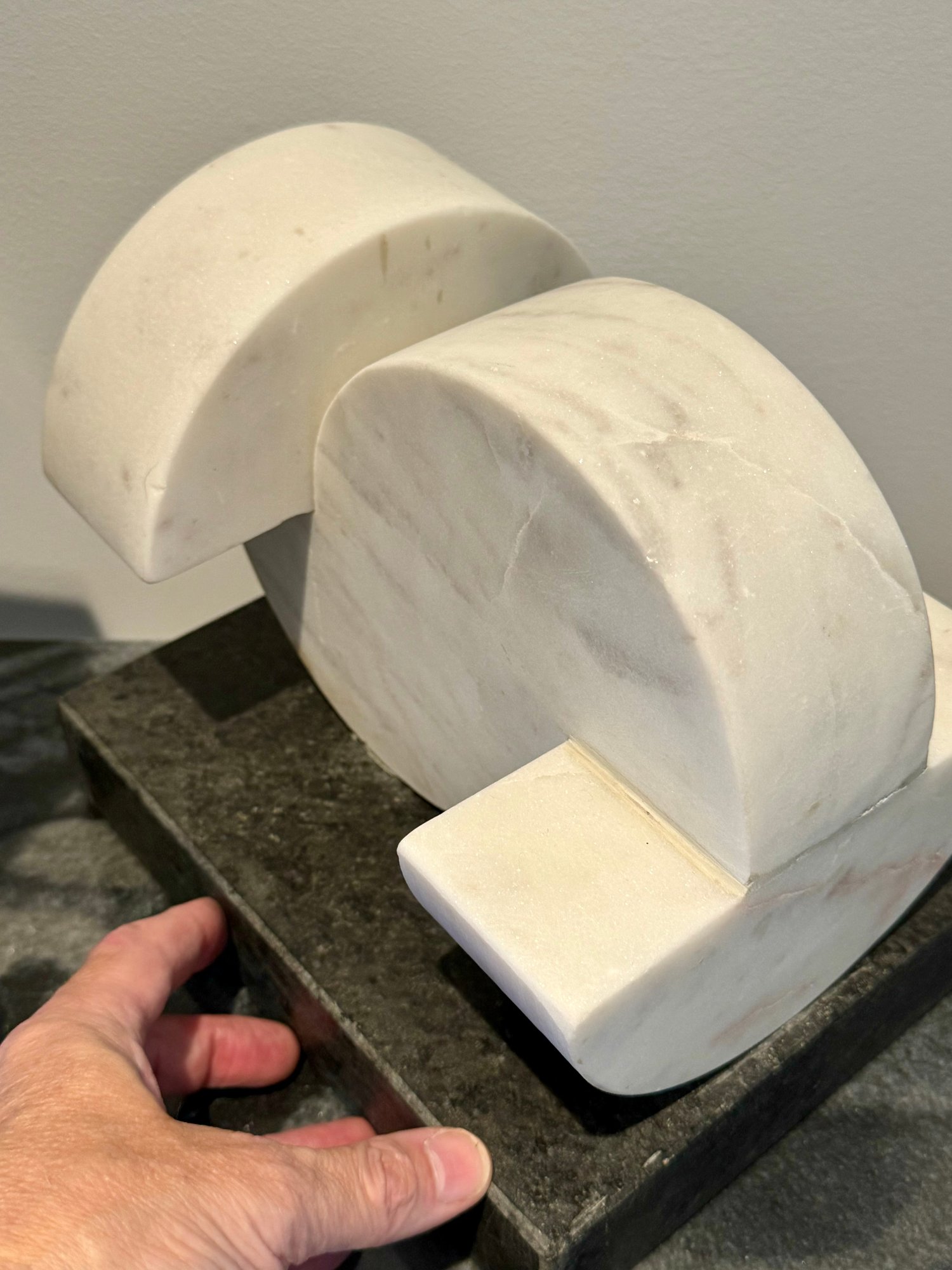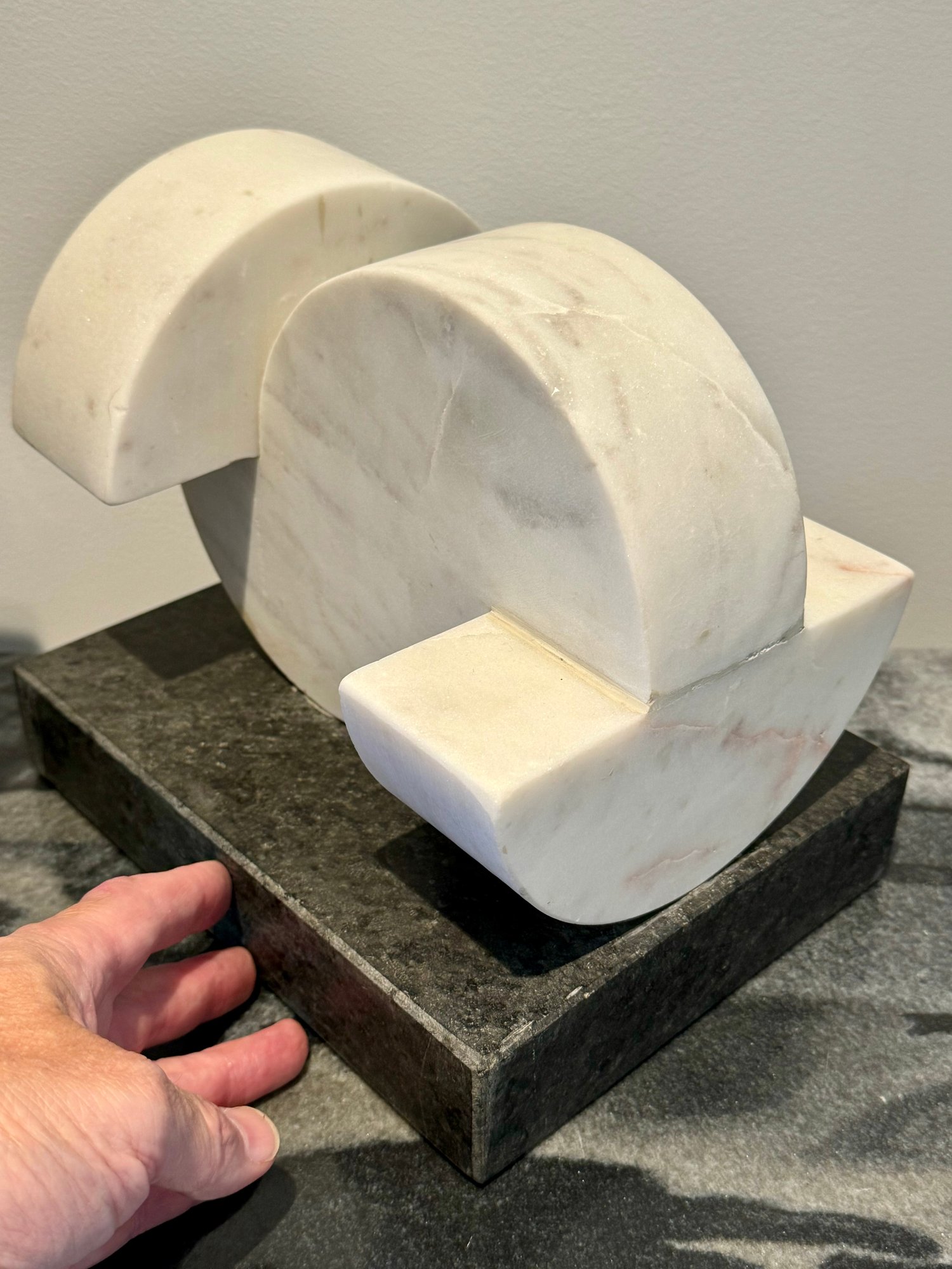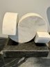 - White marble Demi-lunes on a gray marble base measuring 9”W x 7”D x 8”H